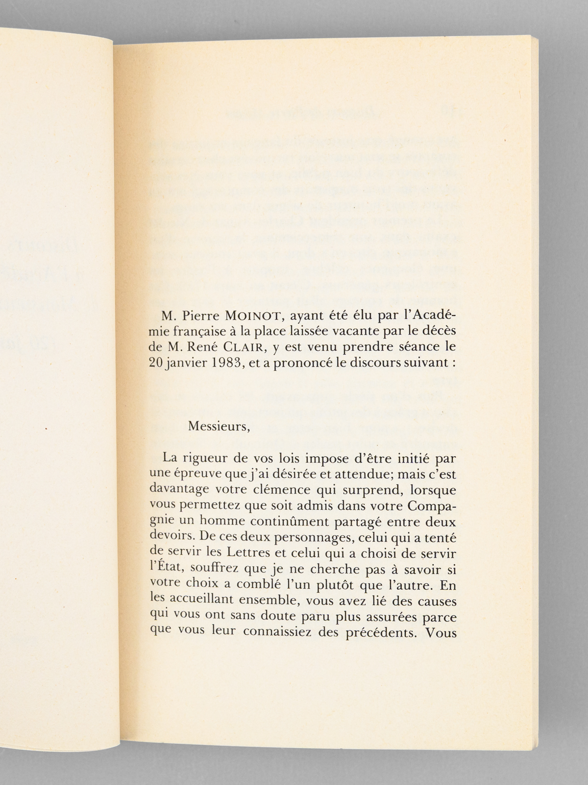 Discours de Réception de Pierre Moinot à l'Académie Française et réponse du Révérend Père Carré [ Livre dédicacé par les auteurs à Maurice Druon ]