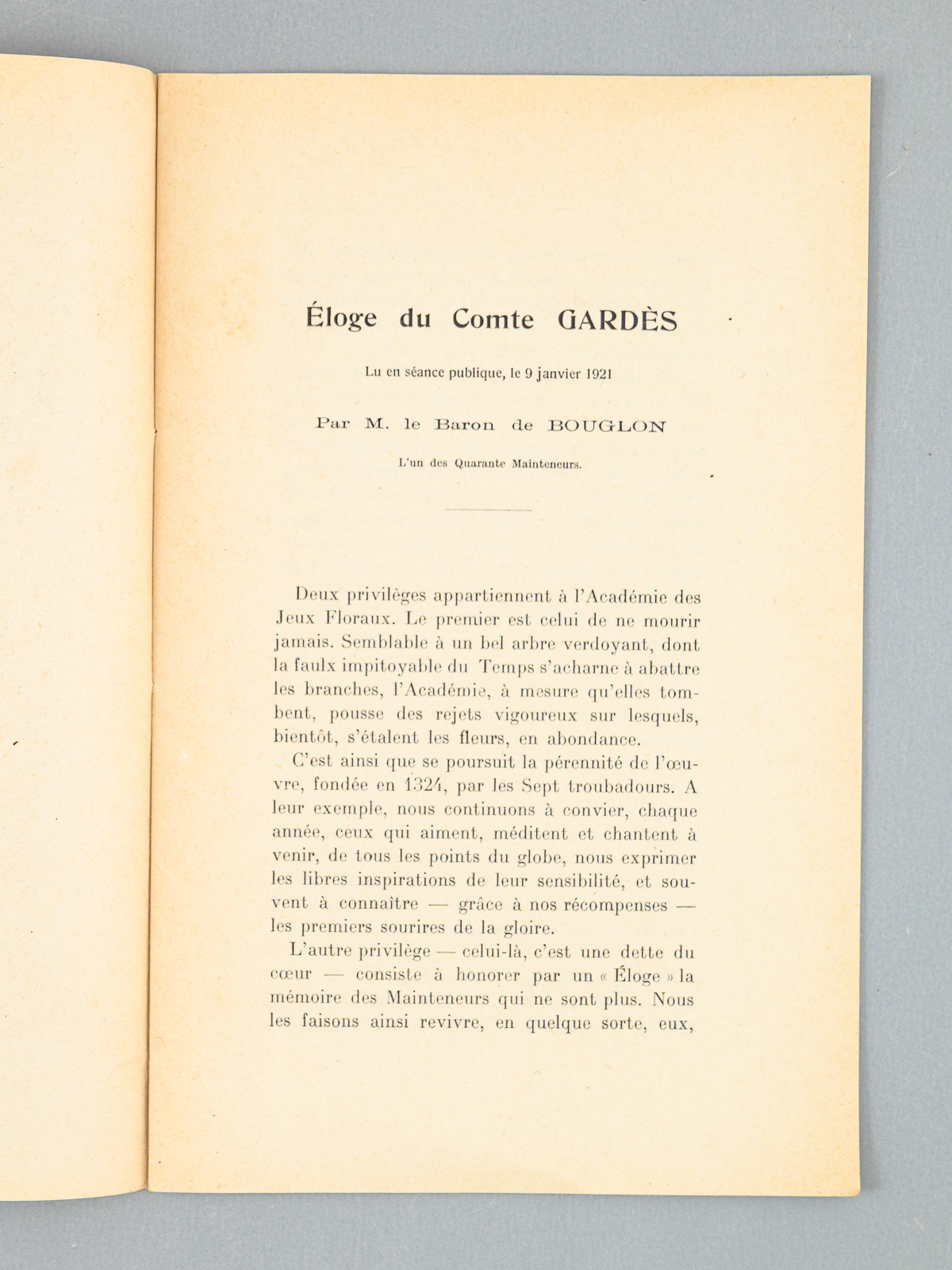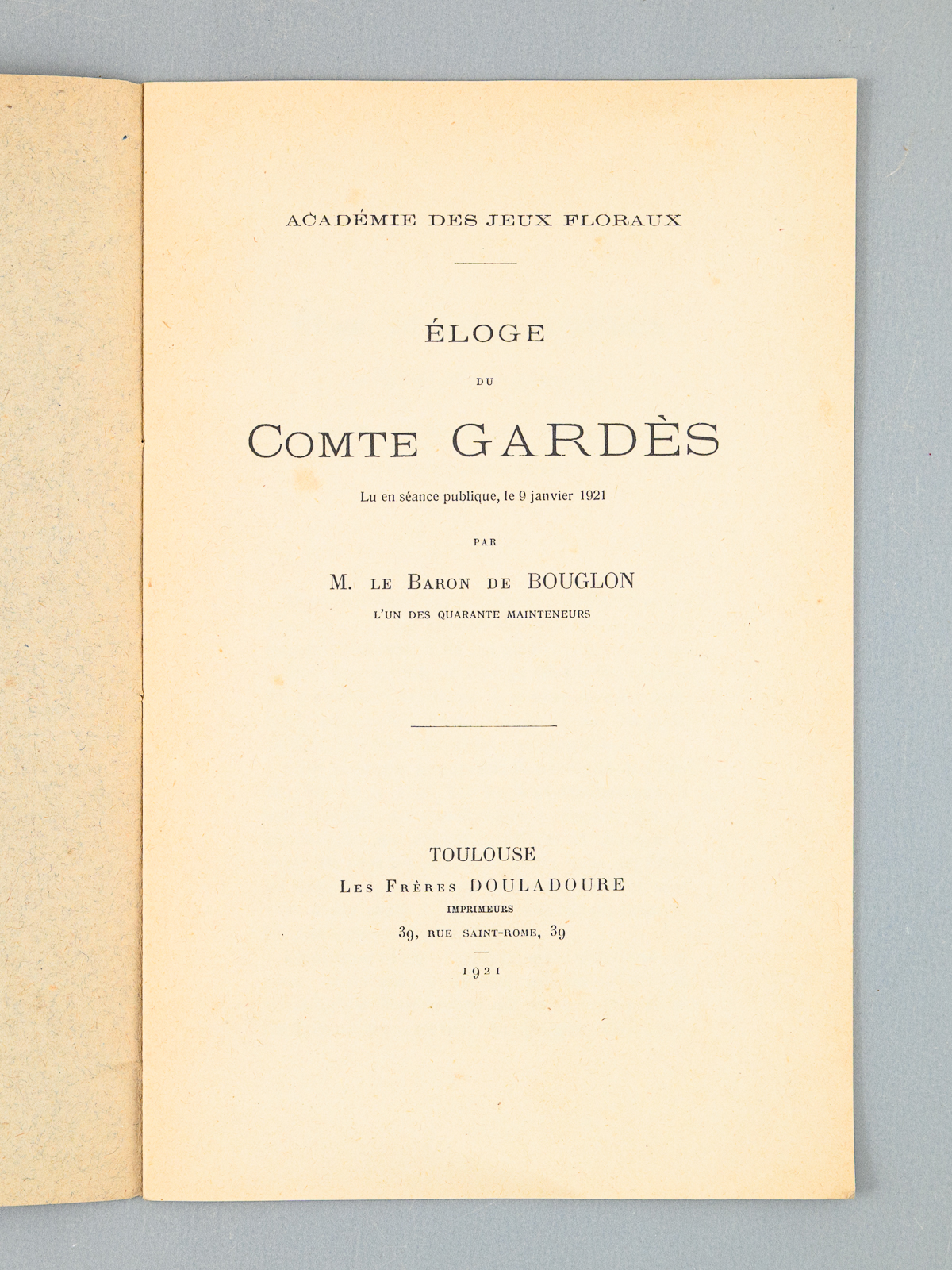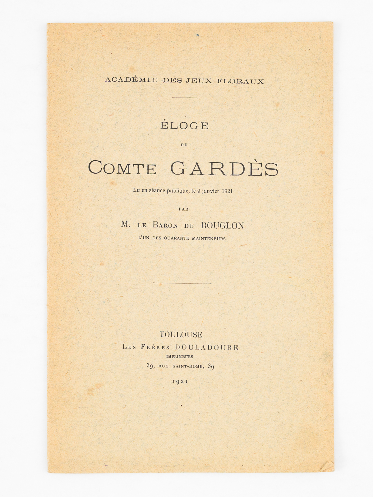 Eloge du Comte Gardès, lu en séance publique, le 9 janvier 1921 par M. le Baron de Bouglon, l'un des quarante mainteneurs ( Académie des Jeux Floraux ]
