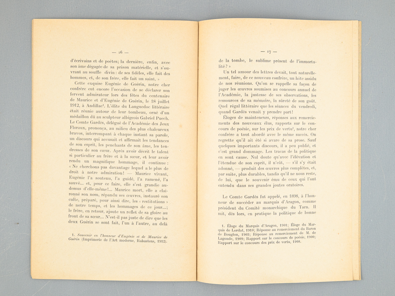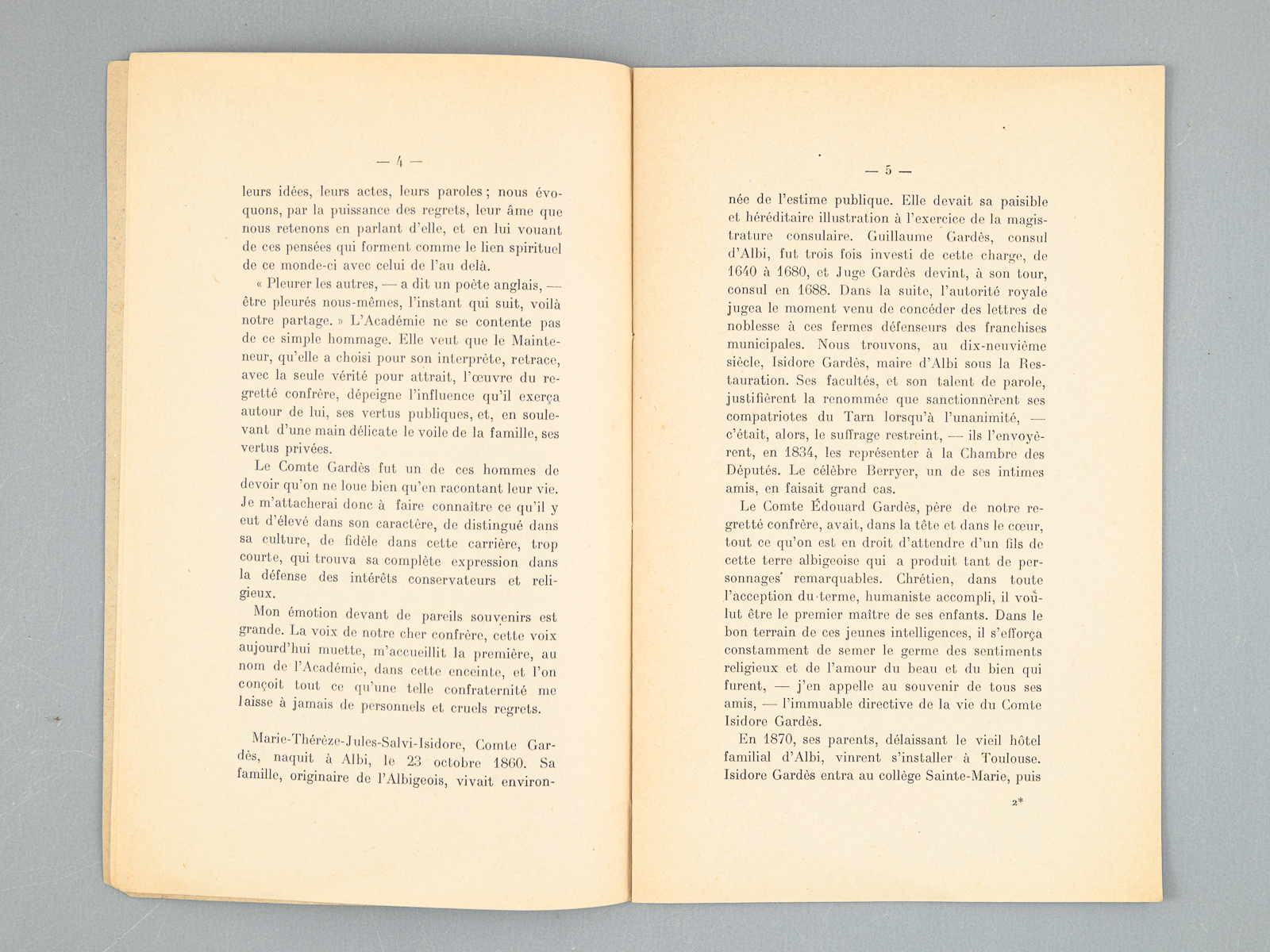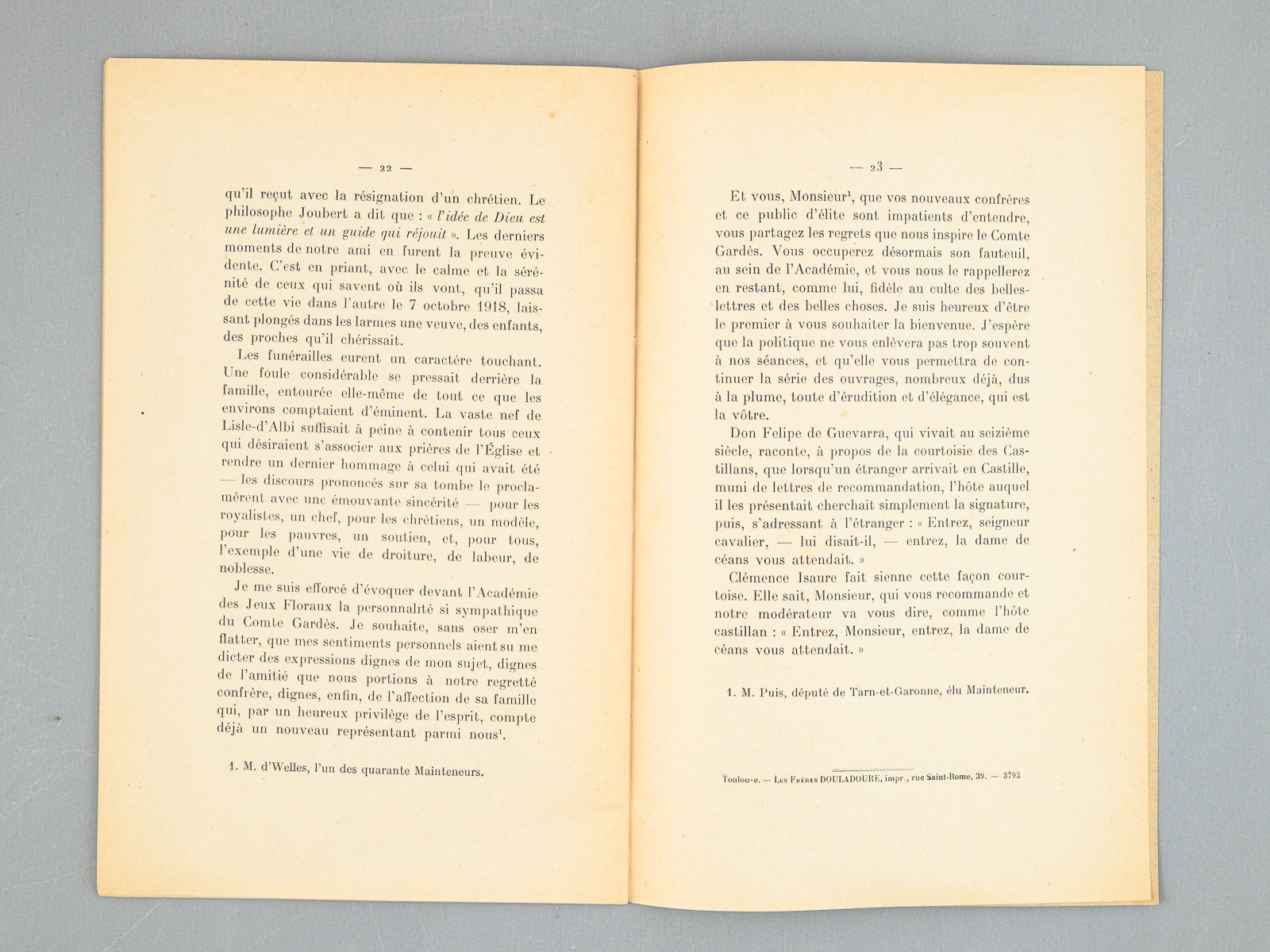 1 vol. in-12 br., Les Frères Douladoure, Toulouse, 1921, 23 pp. Commentaire : Très bon état. Le Comte Isidore Gardès (1860-1918), originaire d'Albi était à son époque, l'un des piliers des Jeux Floraux de Toulouse.