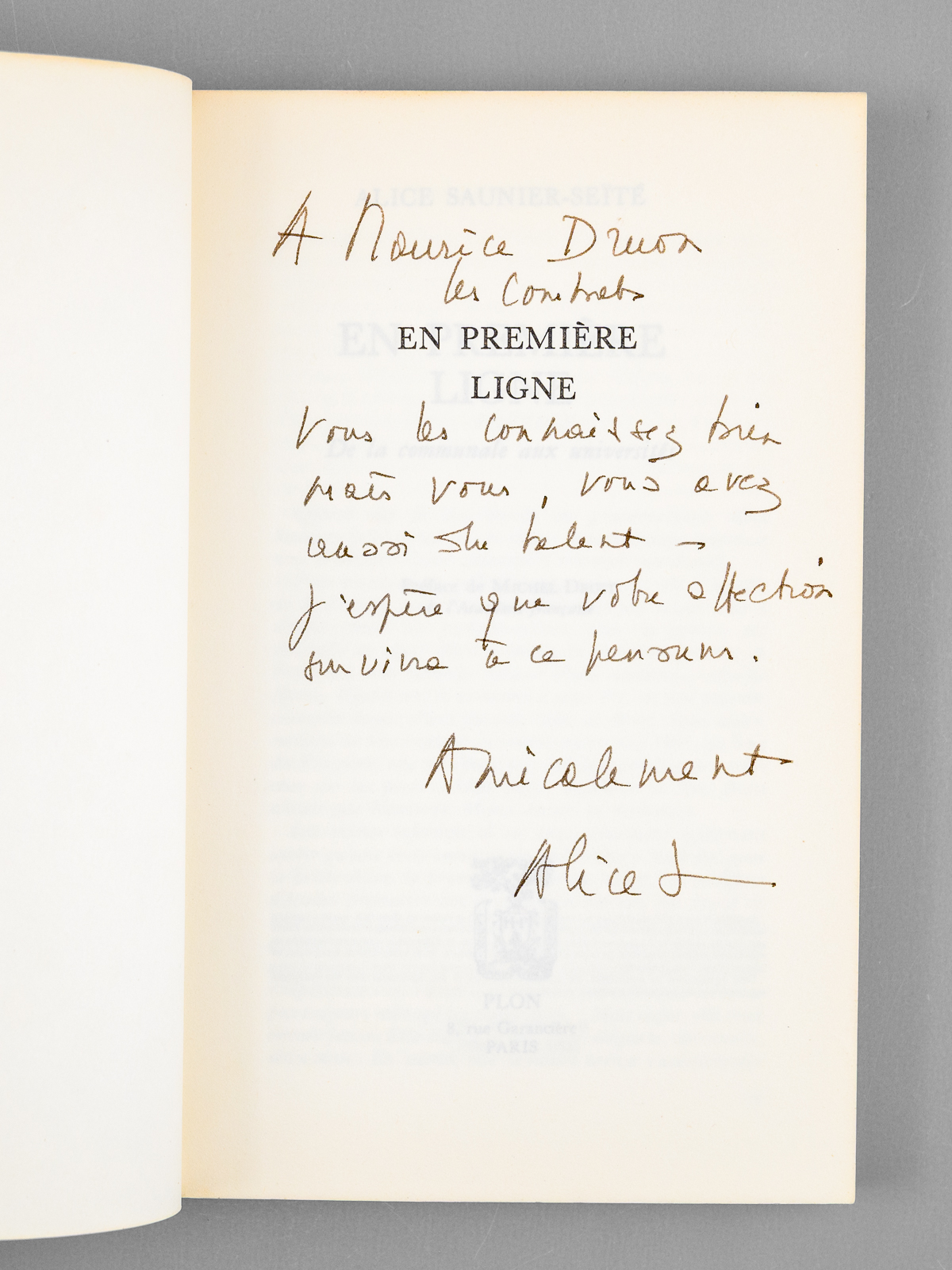 1 vol. in-8 br., Plon, Paris, 1982, 188 pp. Commentaire : Bel envoi d'Alice Saunier-Seïté 'A Maurice Druon, les combats en 'Première ligne' vous les connaissez bien mais vous, vous avez aussi du talent. J'espère que votre affection survivra à ce pensum.' Bon état pour cet exemplaire de superbe provenance : de la bibliothèque du grand écrivain Maurice Druon, Secrétaire Perpétuel de l'Académie Française de 1985 à 1999, et qui fut ministre des Affaires culturelles en 1973-1974. Conformément à son habitude, a plié l'angle des feuillets contenant des passages de l'ouvrage qui avaient retenu plus particulièrement son attention, et a signalé à l'encre en marge quelques passages.