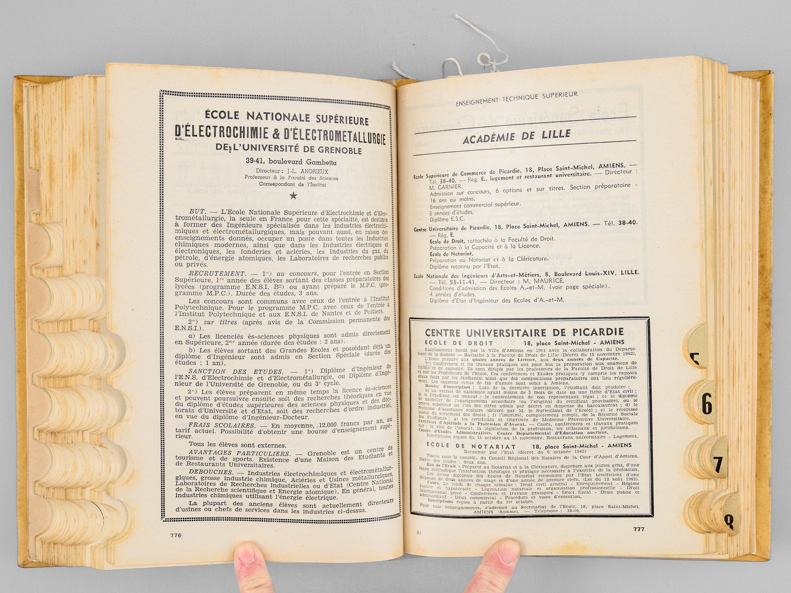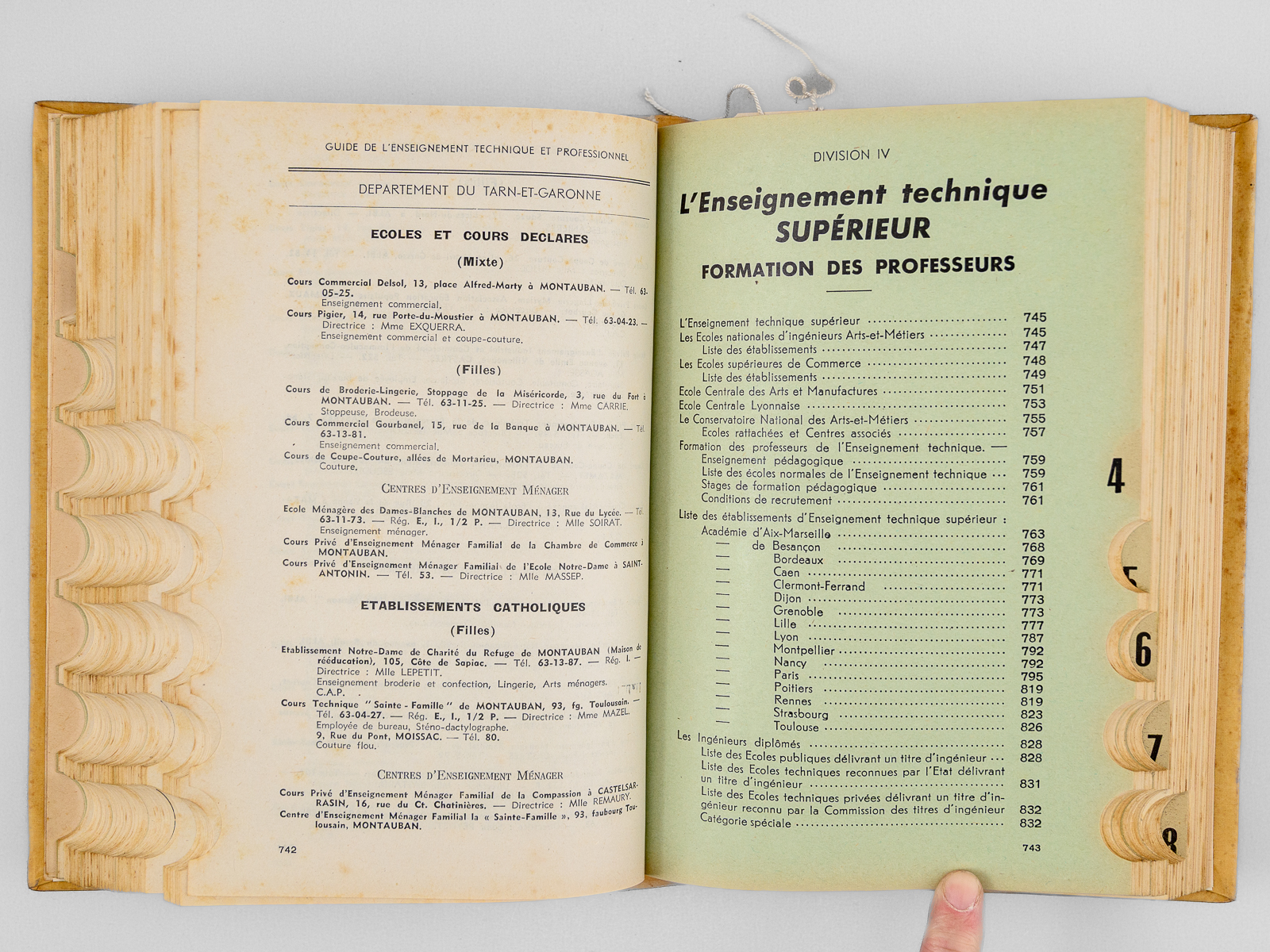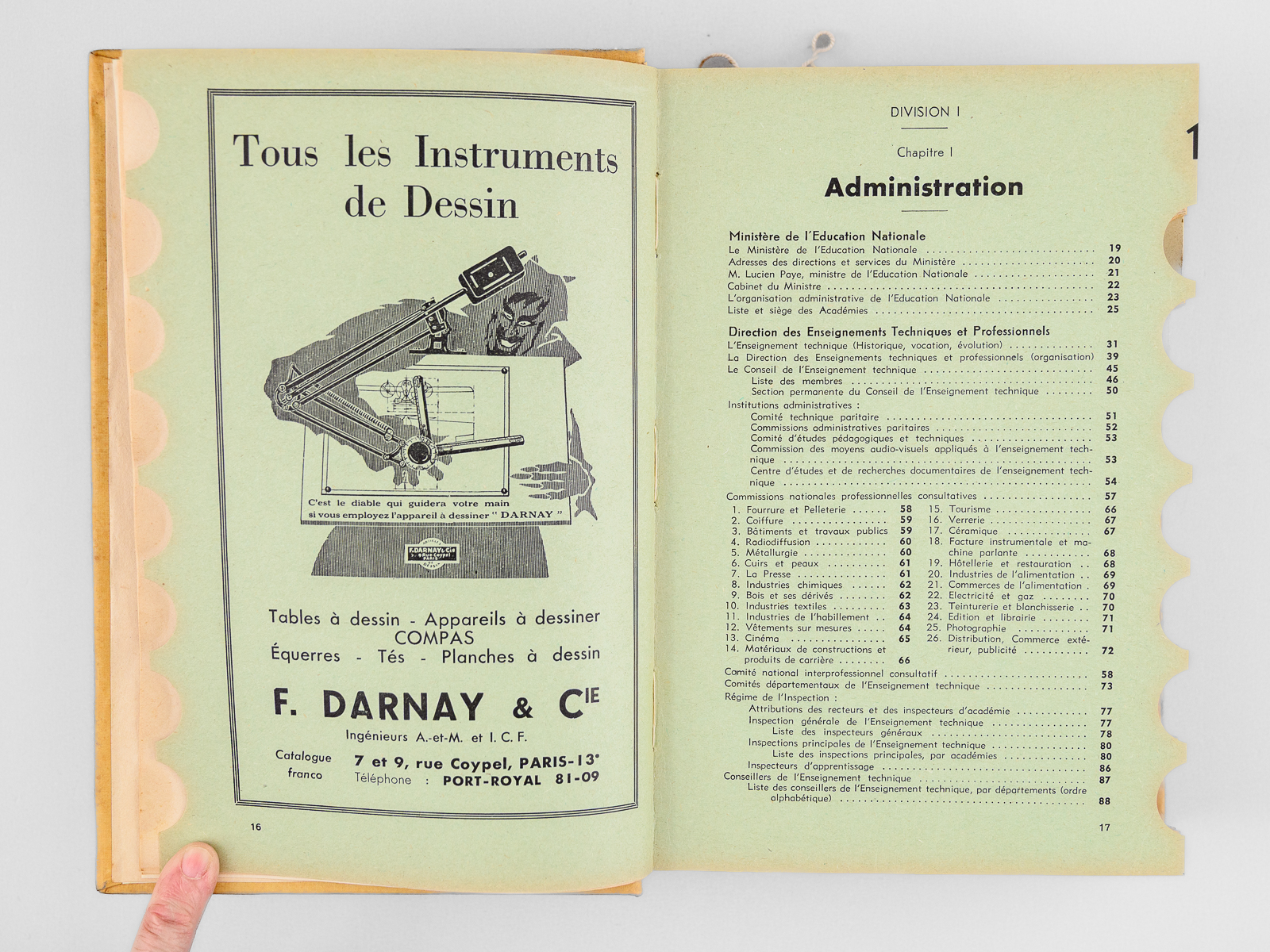 Commentaire : Cet annuaire très peu commun fournit une masse de renseignement considérable sur la situation de l'enseignement technique et professionnel au début des années 60. L'ouvrage est divisé en 8 sections : Administration-Documentation, Enseignement Public, Enseignement Privé, Enseignement Supérieur, Outremer, Enseignements Spéciaux, Perfectionnement-Promotion, Carrières et Culture. Bon exemplaire.