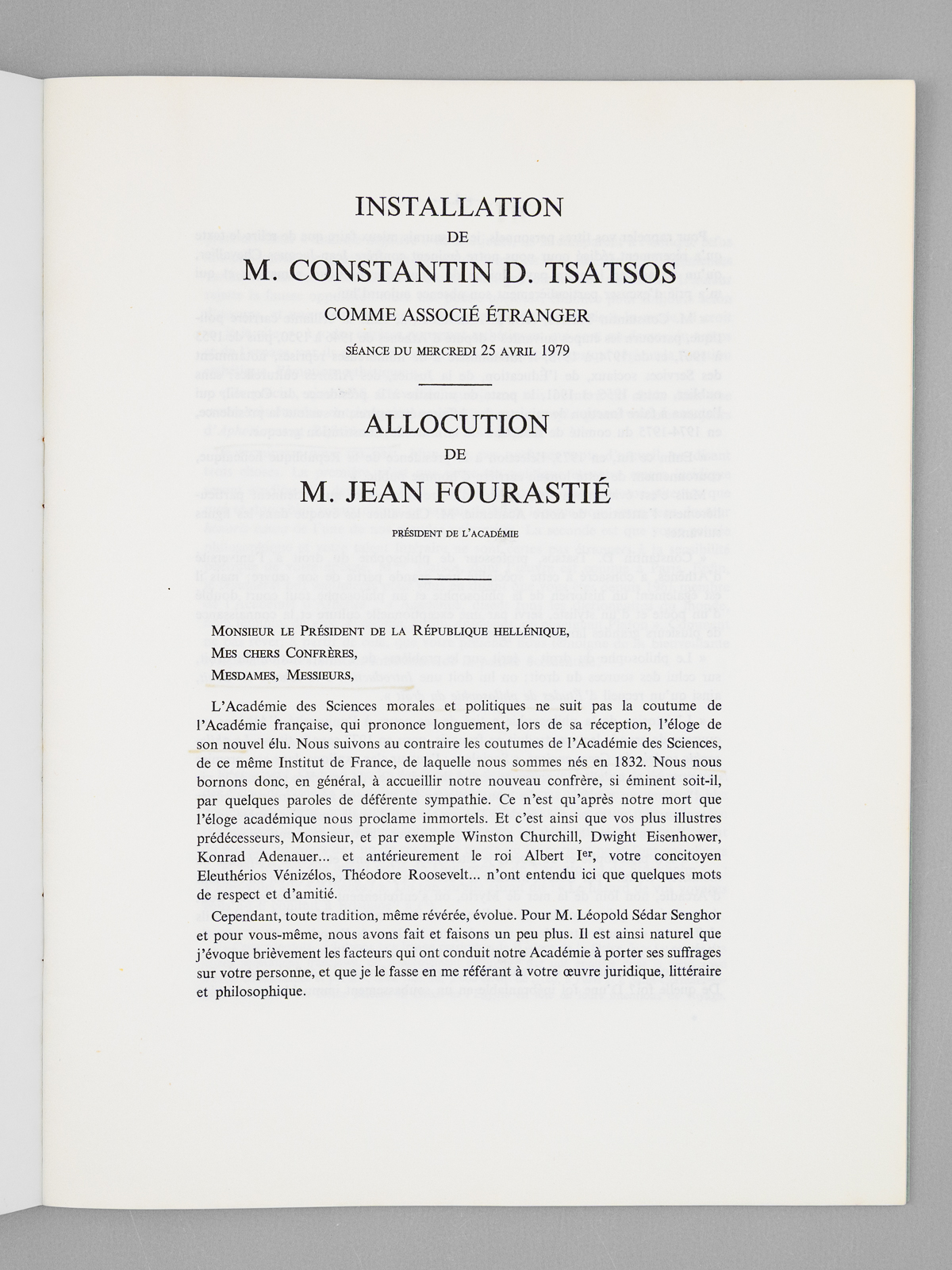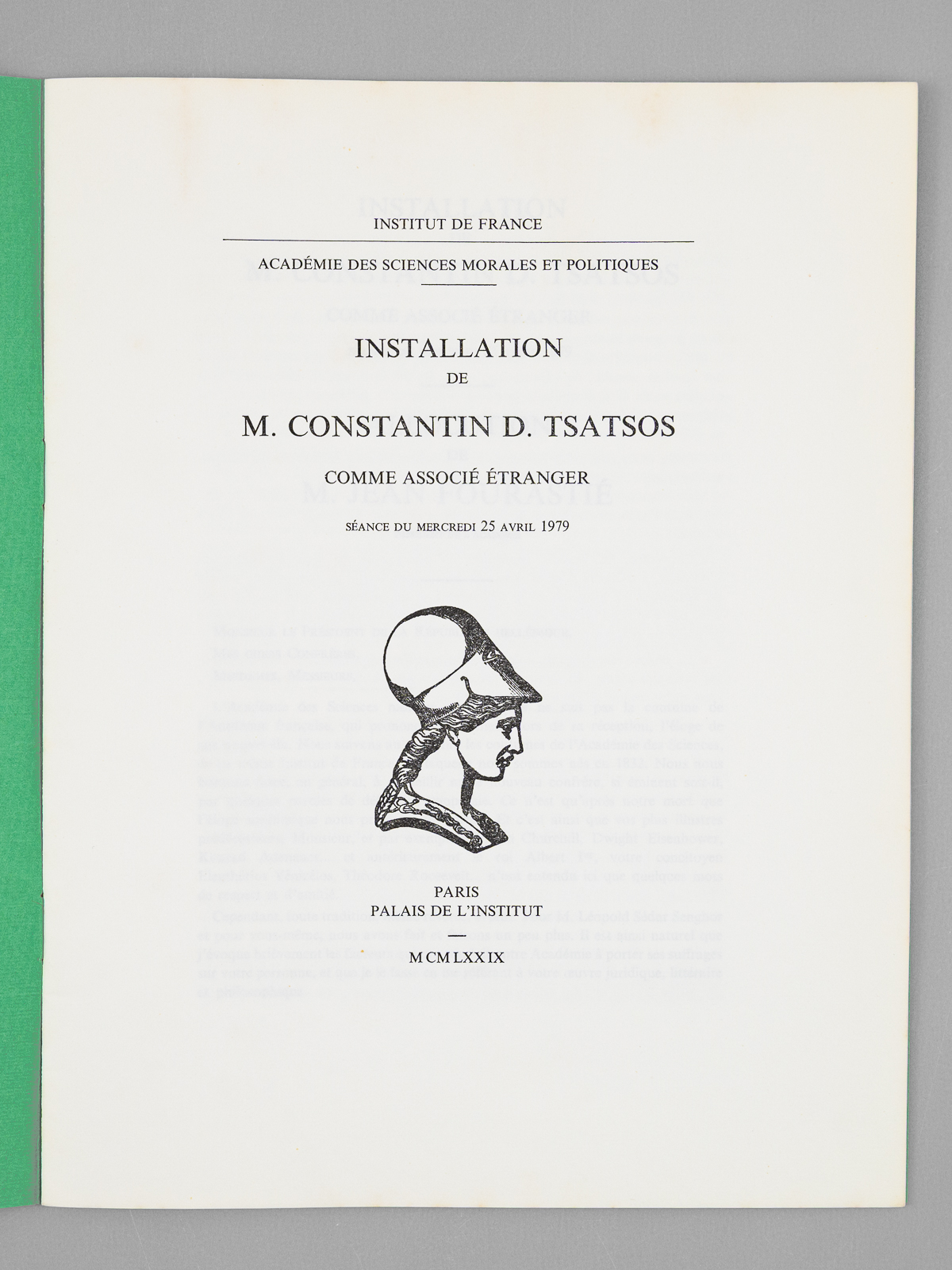 Installation de M. Constantin D. Tsatsos comme Associé Etranger. Séance du mercredi 25 avril 1979