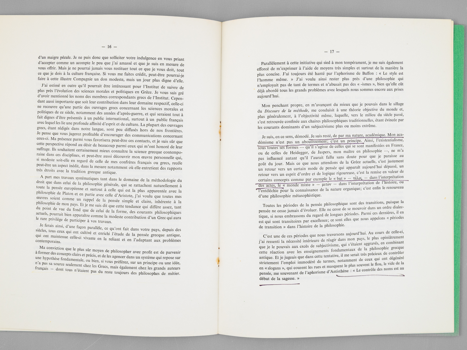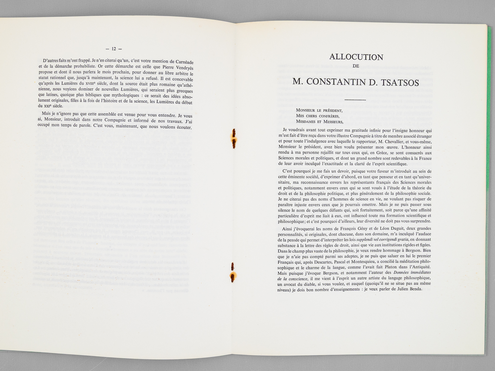 Commentaire : Bon état (rouille sur les agrafes). Avec les allocutions de Jean Fourastié et de Konstantin Tsatsos. Superbe provenance (bien qu'aucune marque ne la précise sur le document) : de la bibliothèque du grand écrivain et auteur des 'Rois Maudits', Maurice Druon, futur Secrétaire Perpétuel de l'Académie Française de 1985 à 1999 et immortel auteur avec son oncle Joseph Kessel du texte du 'Chant des Partisans', qui a souligné de sa main quelques passages.