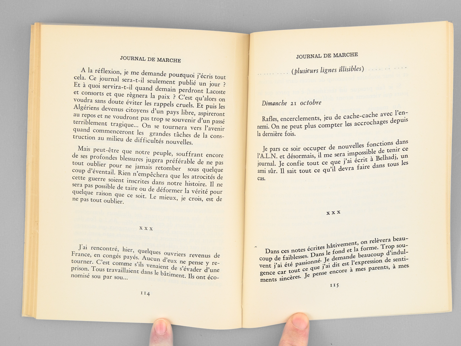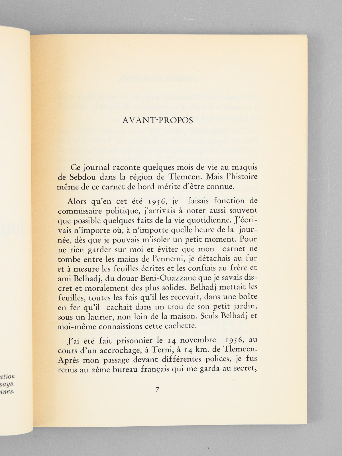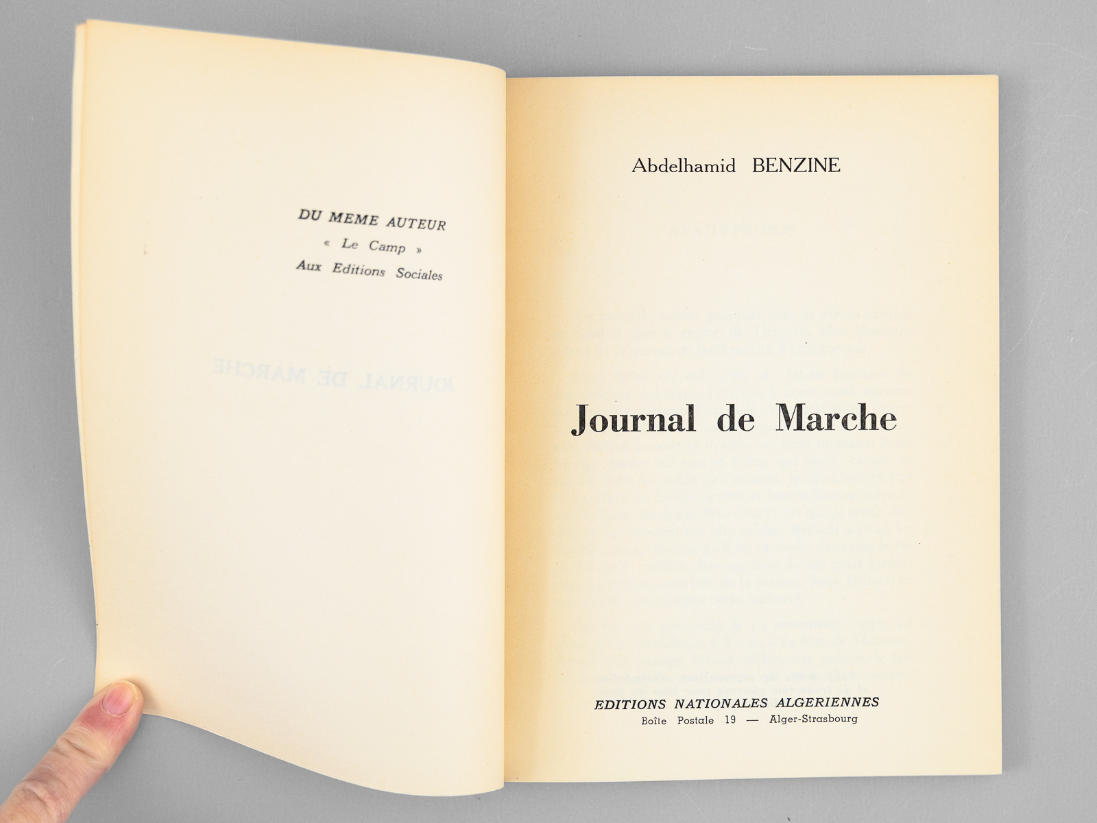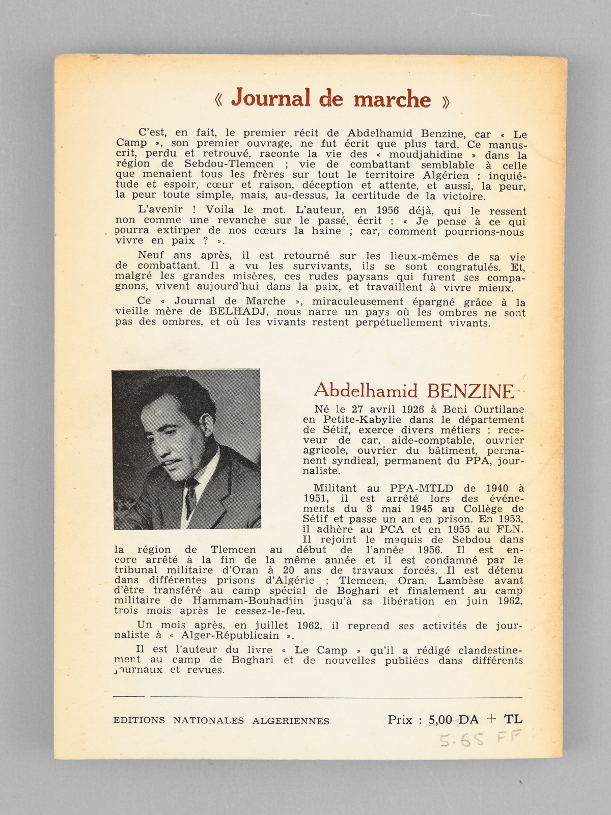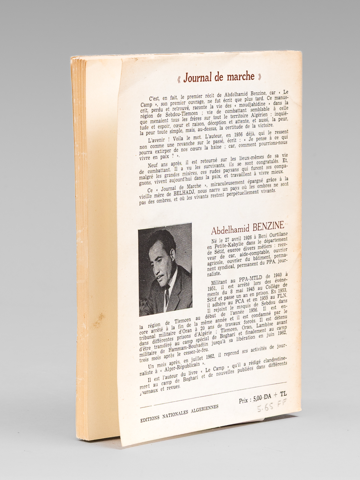 Commentaire : Bon exemplaire. Abdelhamid Benzine (1926-2003) fut un responsable important de la CGT avant la guerre d'Algérie. Après l'indépendance il devint directeur du quotidien communiste 'Alger républicain', auquel avait collaboré Albert Camus. Ce 'Journal de Marche' raconte 'la vie des moudjahidine dans la région de Sebdou-Tlemcen'. Neuf ans après, il revient sur les lieux de sa vie de combattant.