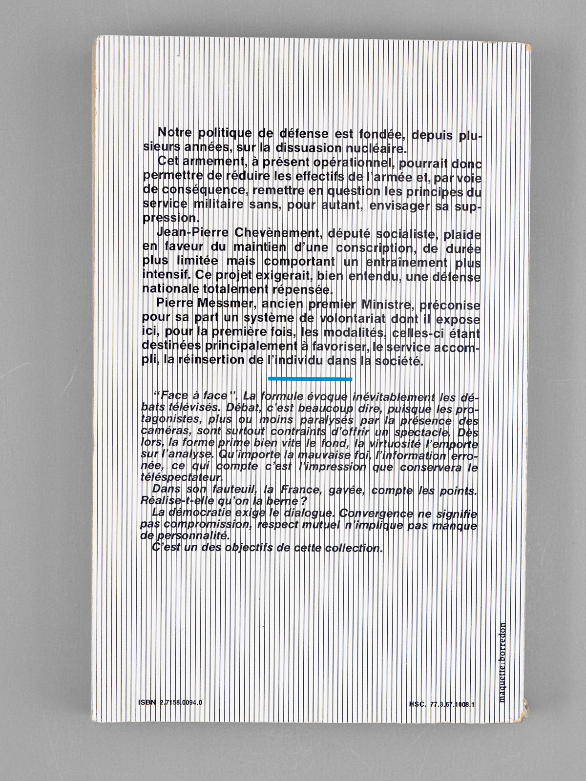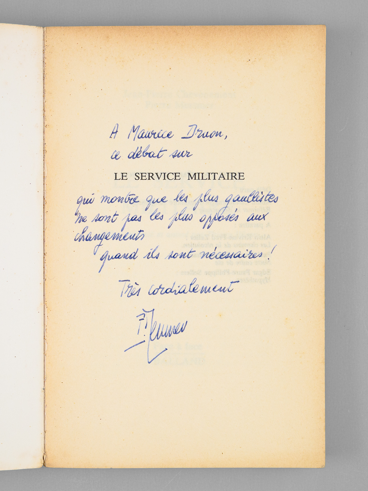 Commentaire : Bel envoi de Pierre Messmer 'A Maurice Druon, ce débat sur 'Le Service Militaire' qui montre que les plus gaullistes ne sont pas les plus opposés aux changements, quand ils sont nécessaires ! Très cordialement'. Bon état. De la bibliothèque du grand écrivain Maurice Druon, Secrétaire Perpétuel de l'Académie Française de 1985 à 1999 et immortel auteur avec son oncle Joseph Kessel du 'Chant des Partisans'