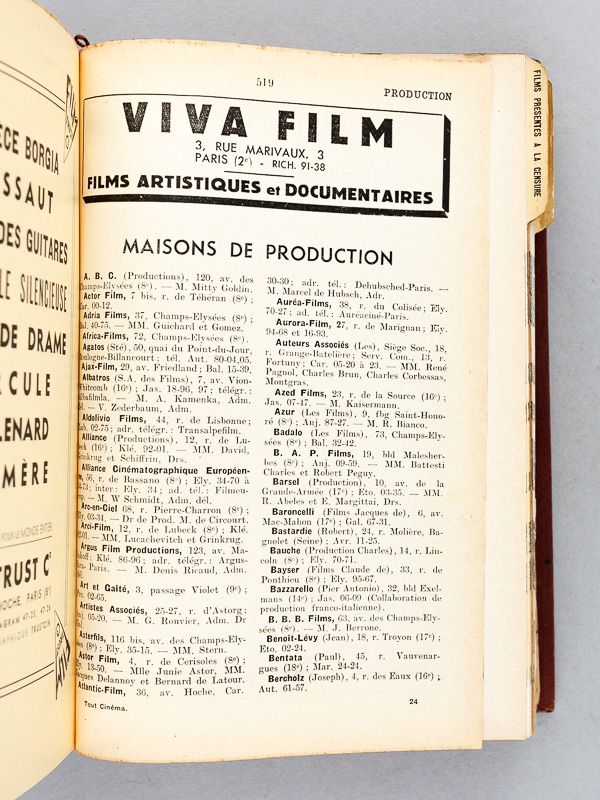 1 vol. fort in-8 cartonnage percaline éditeur mauve, nomb. ill., Publications 'Filma', Paris, 1938, 1245 pp. marqué GFFA et GMF Film sur tranches Commentaire : Extraordinaire annuaire professionnel, incontournable, richement illustré et recueillant toutes les adresses, des stars, des cinémas, des techniciens, des producteurs, etc., etc. La galerie de portraits des acteurs est impressionnante. Bon exemplaire (cartonnage lég. frotté, très bon état par ailleurs) pour ce document remarquable, qui nous donne une vision détaillée de l'industrie cinématographique française à la veille de la Seconde Guerre Mondiale.