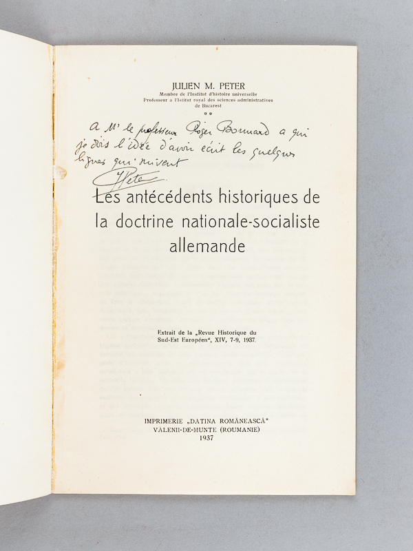 Extrait de la 'Revue Historique du Sud-Est européen, XIV, 1937, 1 brochure in-8, Imprimerie 'Datina Romaneasca' Valenii-de-Munte (Roumanie), 1937, 38 pp. Commentaire : Très bel envoi de l'auteur 'A Mr. le professeur Roger Bonnard a qui je dois l'idée d'avoir écrit les quelques lignes qui suivent'. Très intéressante étude sur les sources de l'idéologie nazie, rédigée avant-guerre et dédicacée au doyen bordelais Roger Bonnard. Bon exemplaire pour ce rare tirage à part.