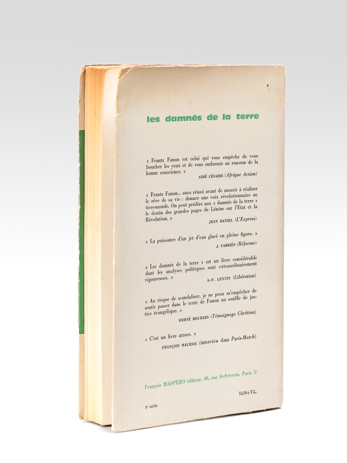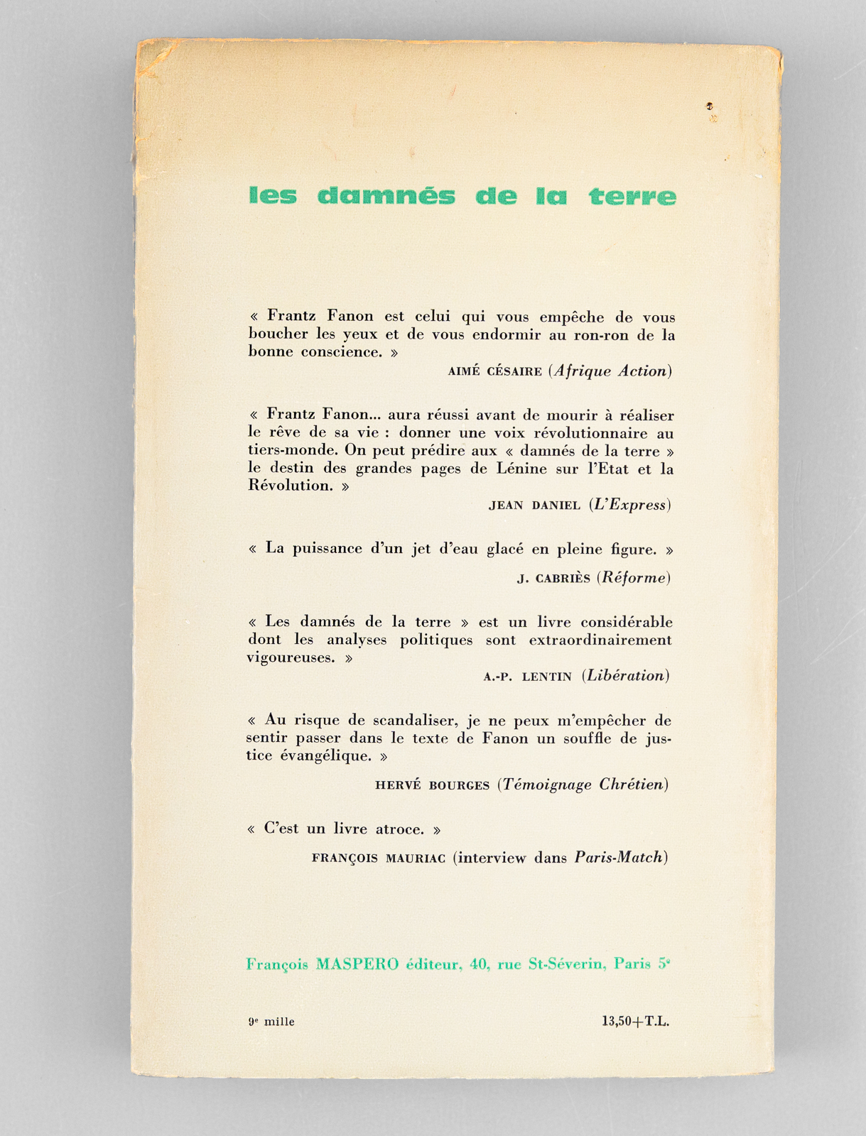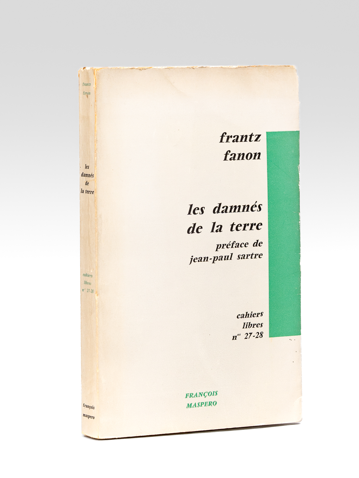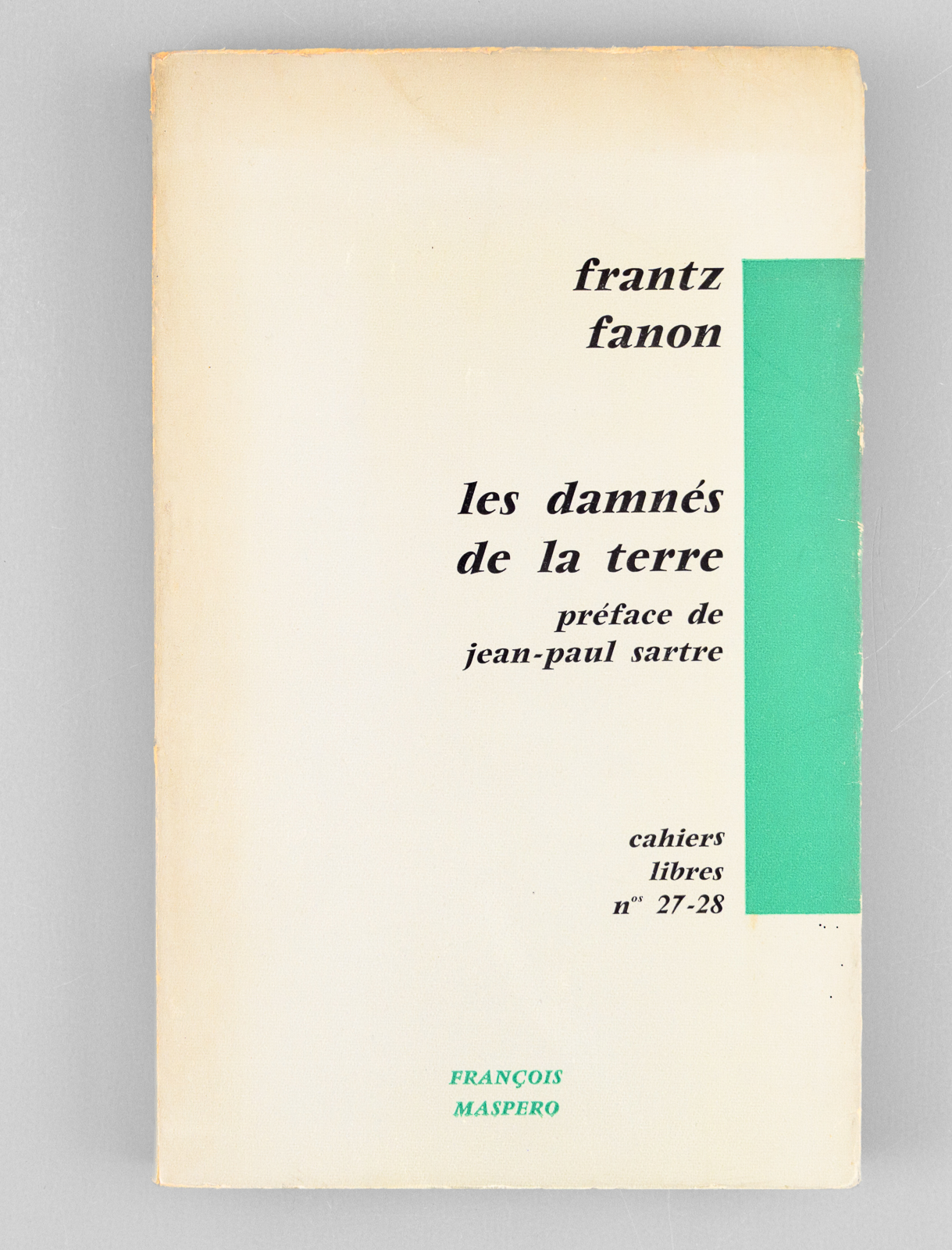 Préface de Jean-Paul Sartre, 1 vol. in-8 br., Cahiers Libres n° 27-28, François Maspero, Paris, 1961, 242 pp. et 3 ff. n. ch. Commentaire : Bon exemplaire de l'édition de 1961, portant mention de 9e mille. Il n'existe pas de grands papiers, et les 250 exemplaires numérotés réservés aux abonnés sont tirés sur le même papier. Dans ce tirage du 9e mille, la 4e de couverture est modifiée et expose les réactions d'écrivains (Aimé Césaire, Jean Daniel, Hervé Bourges, François Mauriac, etc...) à l'ouvrage de Frantz Fanon. Bon exemplaire (petits frott. en couv., très bon état par ailleurs). Peu courant, surtout en bon état