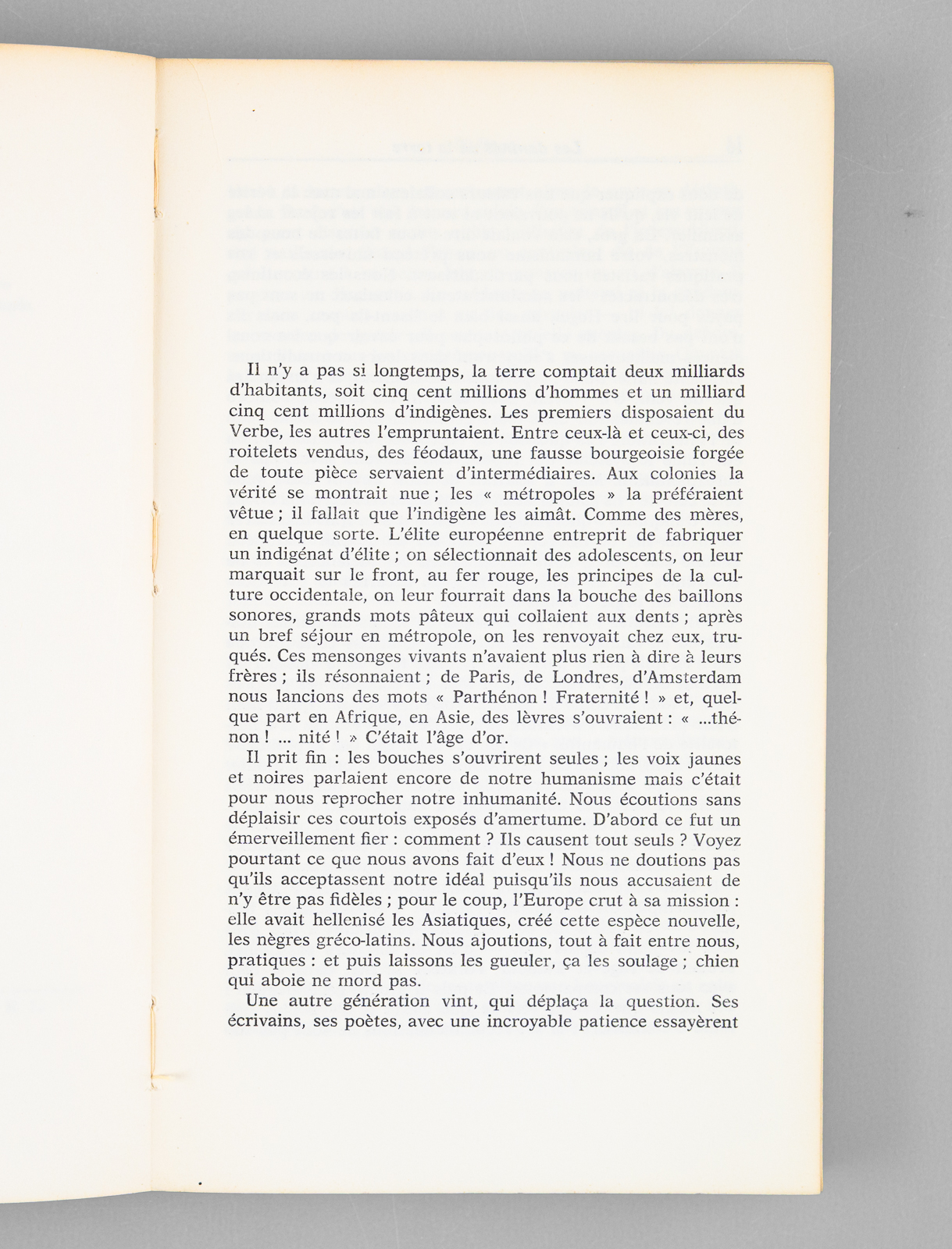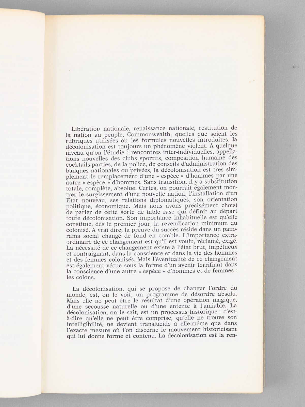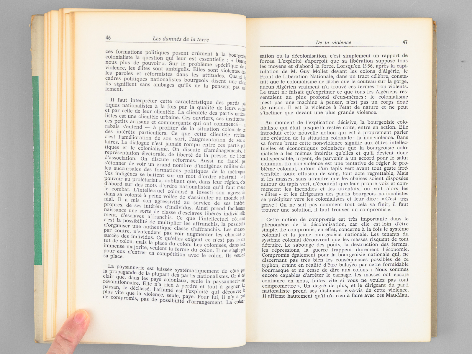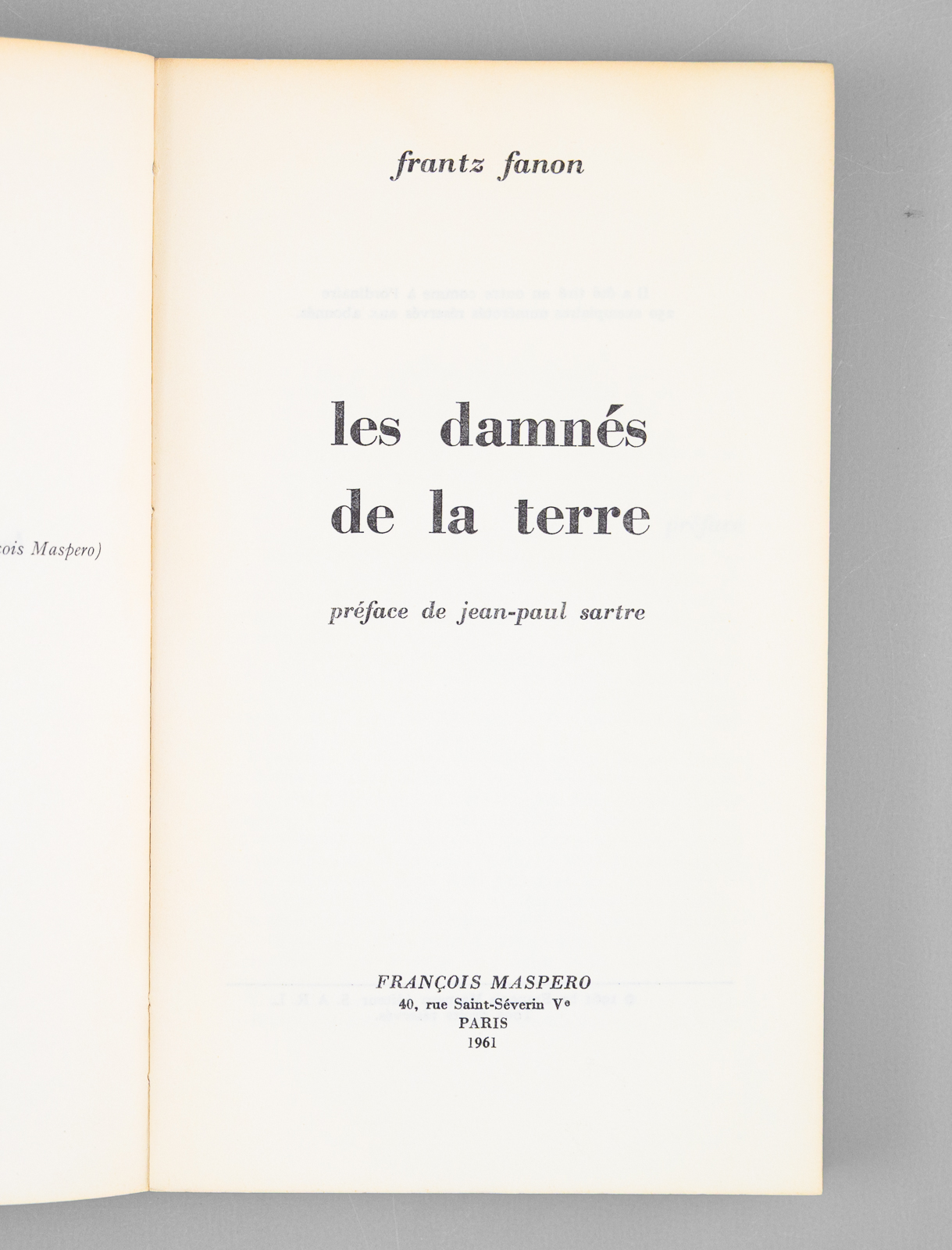 Préface de Jean-Paul Sartre, 1 vol. in-8 br., Cahiers Libres n° 27-28, François Maspero, Paris, 1961, 242 pp. et 3 ff. n. ch. Commentaire : Bon exemplaire de l'édition de 1961, portant mention de 9e mille. Il n'existe pas de grands papiers, et les 250 exemplaires numérotés réservés aux abonnés sont tirés sur le même papier. Dans ce tirage du 9e mille, la 4e de couverture est modifiée et expose les réactions d'écrivains (Aimé Césaire, Jean Daniel, Hervé Bourges, François Mauriac, etc...) à l'ouvrage de Frantz Fanon. Bon exemplaire (petits frott. en couv., très bon état par ailleurs). Peu courant, surtout en bon état