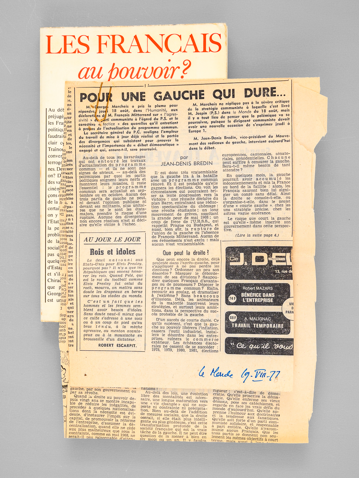 Commentaire : Bel envoi de Jean-Denis Bredin : 'Pour vous, Maurice, ce livre à la recherche de la Vérité. Au-delà des idées, des convictions, des stratégies, il y a notre unité, et, me semble-t-il, une profonde complicité qui m'est très chère. Je vous embrasse. En hommage d'affectueuse fidélité'. Bon état pour cet exemplaire de superbe provenance : de la bibliothèque du grand écrivain Maurice Druon, qui sera Secrétaire Perpétuel de l'Académie Française de 1985 à 1999 et immortel auteur avec son oncle Joseph Kessel du texte du 'Chant des Partisans', qui, conformément à son habitude, a plié l'angle des feuillets contenant des passages de l'ouvrage qui avaient retenu plus particulièrement son attention et a signalé à l'encre plusieurs passages. Il a également inséré une coupure de presse (tribune de Jean-Denis Bredin, vice-président du mouvement des radicaux de gauche).