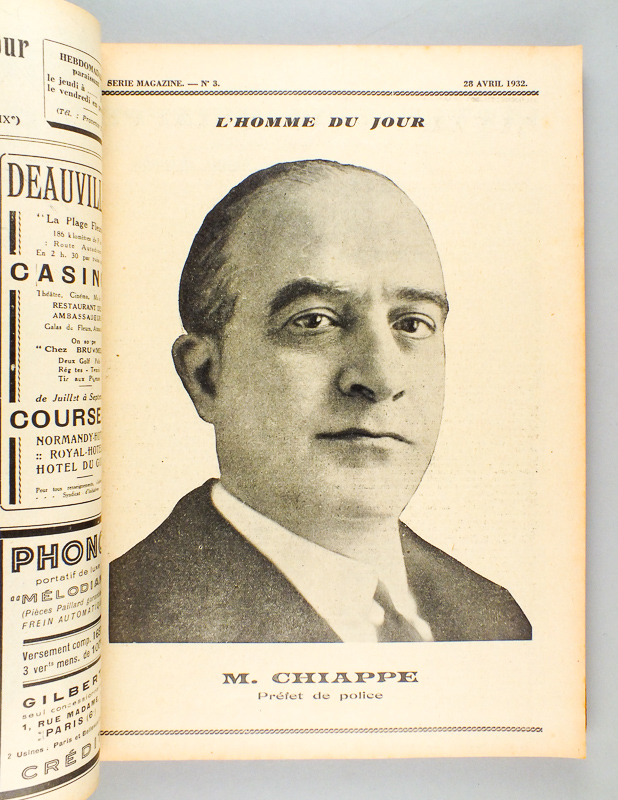 1 vol. in-4 br., Les Hommes du Jour et Le Journal du Peuple. Première Série (1932) : La vrai figure d'Hindeburg - Madame Hanau - Jean Chiappe - Jules Romains - Paul Doumer - Albert Lebrun - César Campinchi - Edouard Herriot - Fernand Bouisson - Paul-Boncour - Joseph Caillaux - Le Bargy, 17 pp. par numéro Commentaire : Etat satisfaisant (couv. abîmée avec mq. en dos, bon état intérieur) pour cette réunion de l'éditeur des 12 premiers numéros de la première série (1932)