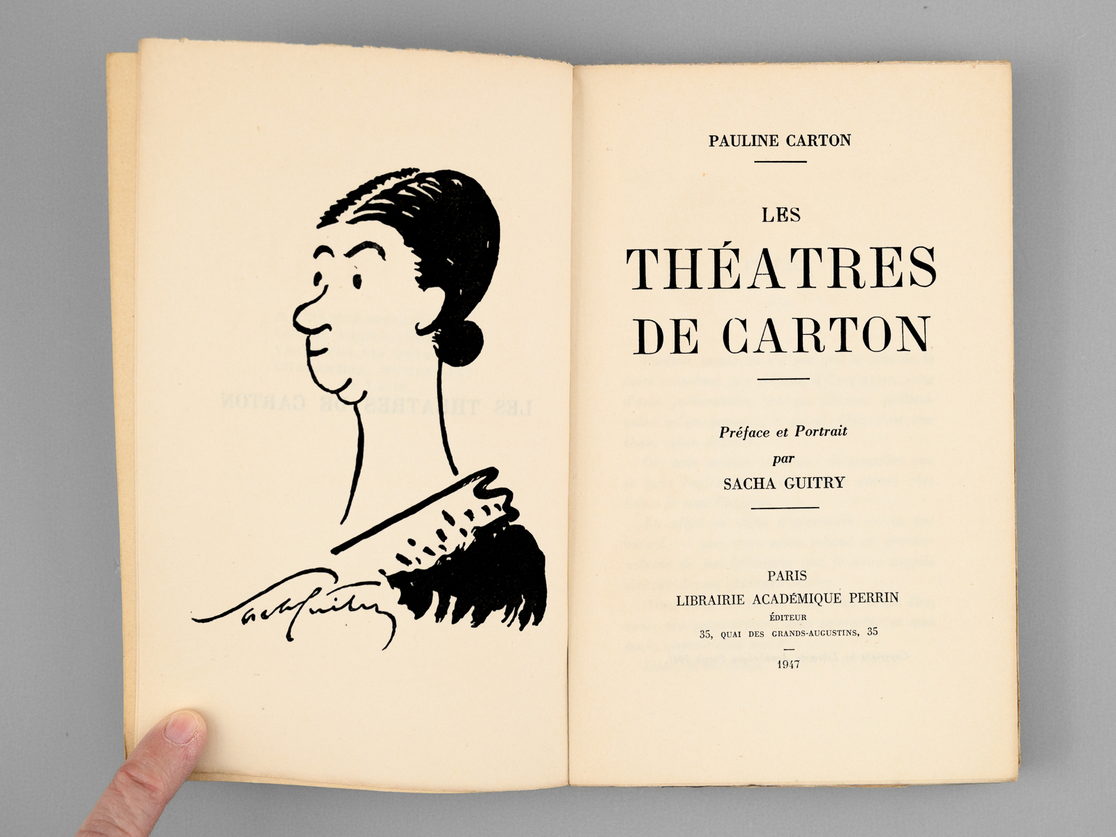 Préface et portrait par Sacha Guitry, 1 vol. in-12 br., Librairie Académique Perrin, Paris, 1947, 203 pp. Commentaire : Bon exemplaire de ces remarquables souvenirs de scène de la grande actrice Pauline Carton (1884-1974), célèbre pour son humour. Grande amie de Sacha Guitry, femme d'une grande culture, elle excella dans les rôles de soubrette, de concierge ou de mégère.