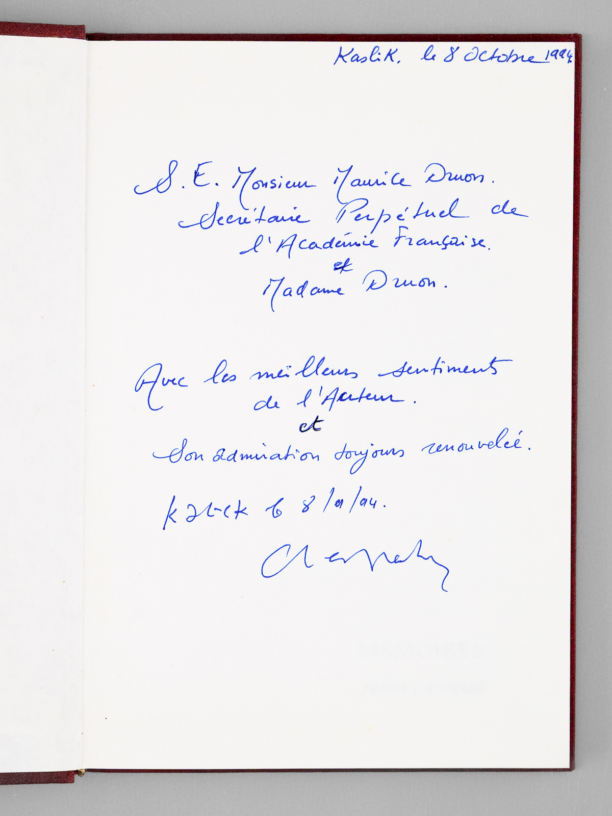5 vol. in-8 reliure pleine toile bordeaux, Librairie Antoine, [ Beyrouth ], s.d. Commentaire : Bel envoi de Charles Helou à 'S.E. Monsieur Maurice Druon Secrétaire Perpétuel de l'Académie Française et Madame Druon, avec les meilleurs sentiments de l'Auteur et son admiration toujours renouvelée'. Remarquable exemplaire des souvenirs personnels et politiques de Charles Hélou (1913-2001), président de la République libanaise de 1964 à 1970, dédicacé à Maurice Druon. Bon exemplaire