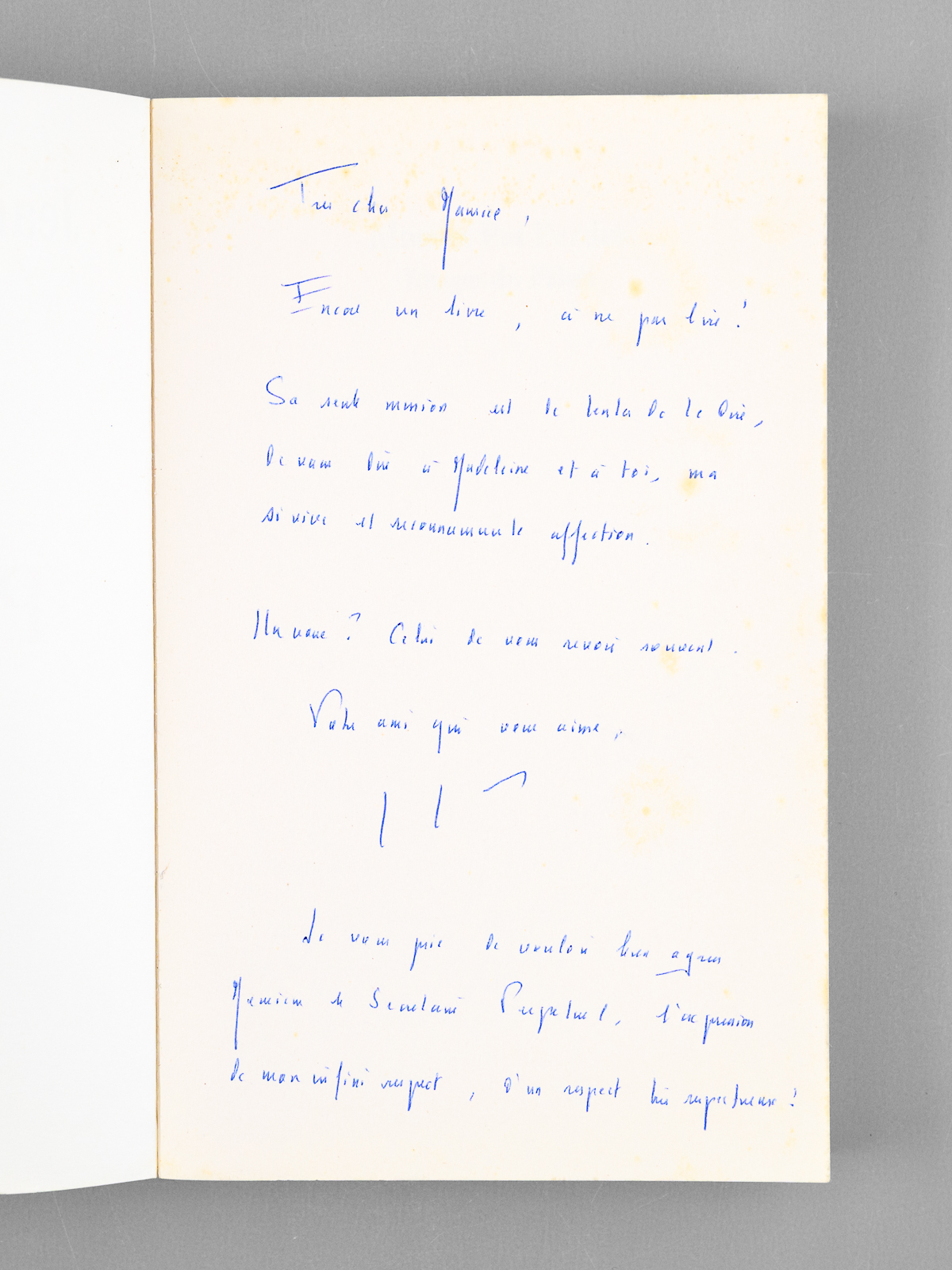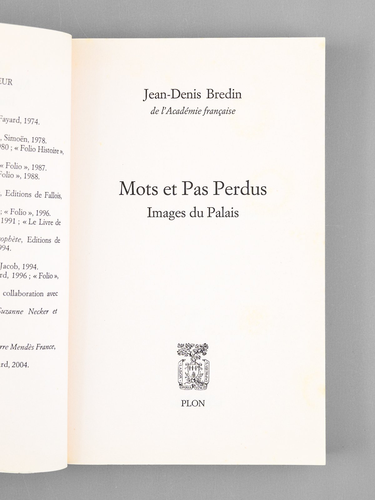 1 vol. in-8 br., Plon, Paris, 2005, 211 pp. Commentaire : Bel envoi de Jean-Denis Bredin : 'Très cher Maurice encore un livre, à ne pas lire ! Sa seule mission est de tenter de le dire,de vous dire à Madeleine et à toi,ma si vive et reconnaissante affection. Un voeux ? Celui de vous revoir souvent. Votre ami qui vous aime. JDB. Je vous prie de vouloir bien agréer, Monsieur le Secrétaire Perpétuel, l'expression de mo infini respect, d'un respect bien respectueux ! Bon état (qq. rouss.) pour cet exemplaire de superbe provenance : de la bibliothèque du grand écrivain Maurice Druon, Secrétaire Perpétuel de l'Académie Française de 1985 à 1999 et immortel auteur avec son oncle Joseph Kessel du texte du 'Chant des Partisans'