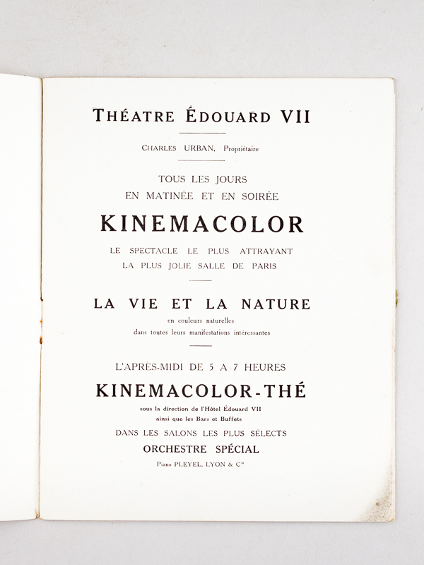 1 brochure in-12, J.A. Poincelin [ circa 1913-1914 ], 8 ff. et 1 f. volant joint (traduction des titres anglais et les grands voyages du Kinemacolor). Rappel du titre complet : Théâtre Edouard VII. Kinemacolor Tous les jours en matinée et en soirée. Le Spectacle le plus attrayant, la plus jolie salle de Paris. La Vie et la Nature en couleurs naturelles dans toutes leurs manifestations intéressantes. L'après-midi de 5 à 7 heures Kinemacolor-Thé sous la direction de l'Hôtel Edouard VII ainsi que les Bars et Buffets dans les Salons les plus sélects. Orchestre spécial Piano Pleyel, Lyon & Cie Commentaire : Très rare programme du Kinémacolor, procédé cinématographique mis au point par par George Smith et Charles Urban. L'obturateur de la caméra contenait un filtre orangé et bleu vert, donnant l'impression de couleur au film. Charles Urban fit construire le Théâtre Edouard VII à Paris en 1913 afin de projeter ses films en Kinemacolor ; la société de ce nom formée avec George Smith fit faillite en 1914. Le programme se compose de films de voyage ('La saison des bains à Ostende', 'les chutes du Niagara', 'le Lac de Lucerne', 'Paris Pittoresque', 'Le Japon' (avec tous les détails dans l'encart joint), mais aussi 'La Lettre Infamante' (la lettre écarlate de Hawthorne), 'Le Tentateur', etc... Bon état (couv. lég. frottée, très bon exemplaire par ailleurs) pour ce très rare document.