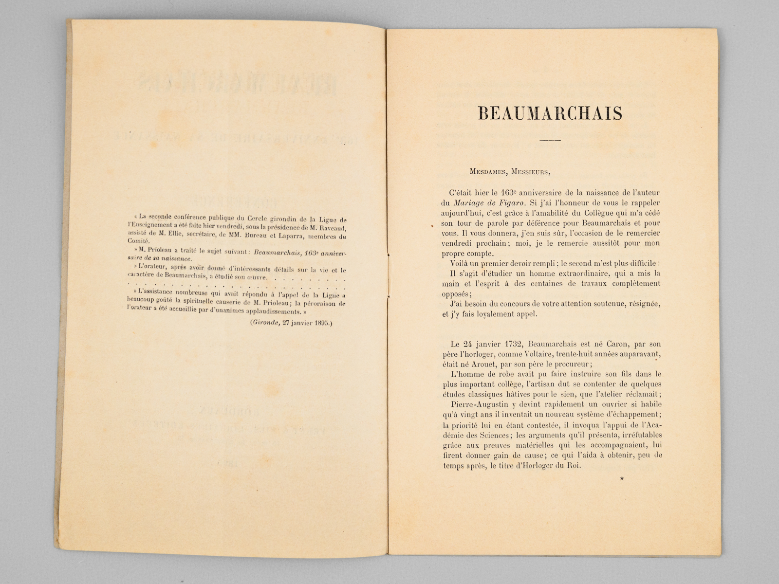 Beaumarchais. 163e Anniversaire de sa Naissance. Conférence faite à l'Athénée de Bordeaux, le 25 janvier 1895 [ Edition originale - Livre dédicacé par l'auteur ]
