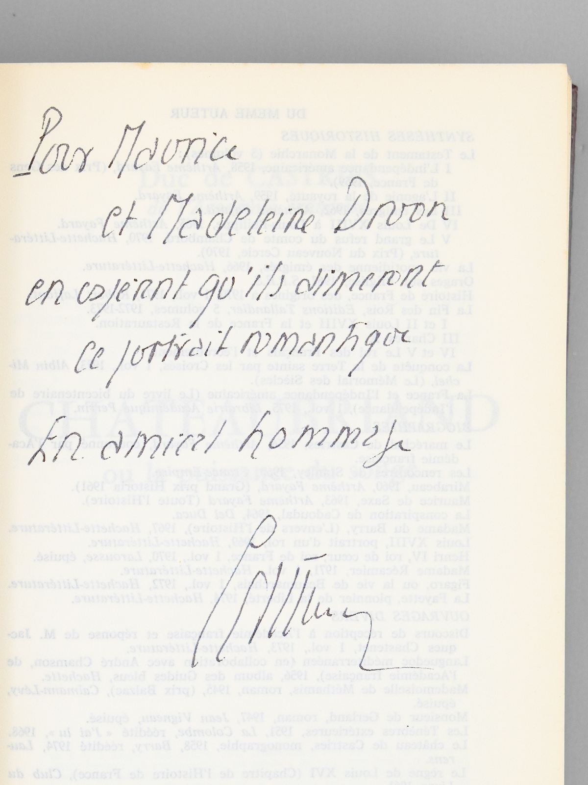 Commentaire : Envoi de l'auteur à Maurice Druon et à son épouse : 'Pour Maurice et Madeleine Druon, en espérant qu'ils aimeront ce portrait romantique. En amical hommage.'. Maurice Druon (1918-2009), auteur notamment de la célèbre saga historique des Rois maudits, fut élu à l'Académie Française en 1968. Il en devint le Secrétaire Perpétuel, de 1985 à 1999. L'auteur, quant à lui, avait été élu à l'Académie Française en 1972. Etat très satisfaisant (lég. rouss. sur tr. sup., bon état par ailleurs) pour cet exemplaire, d'une origine prestigieuse.