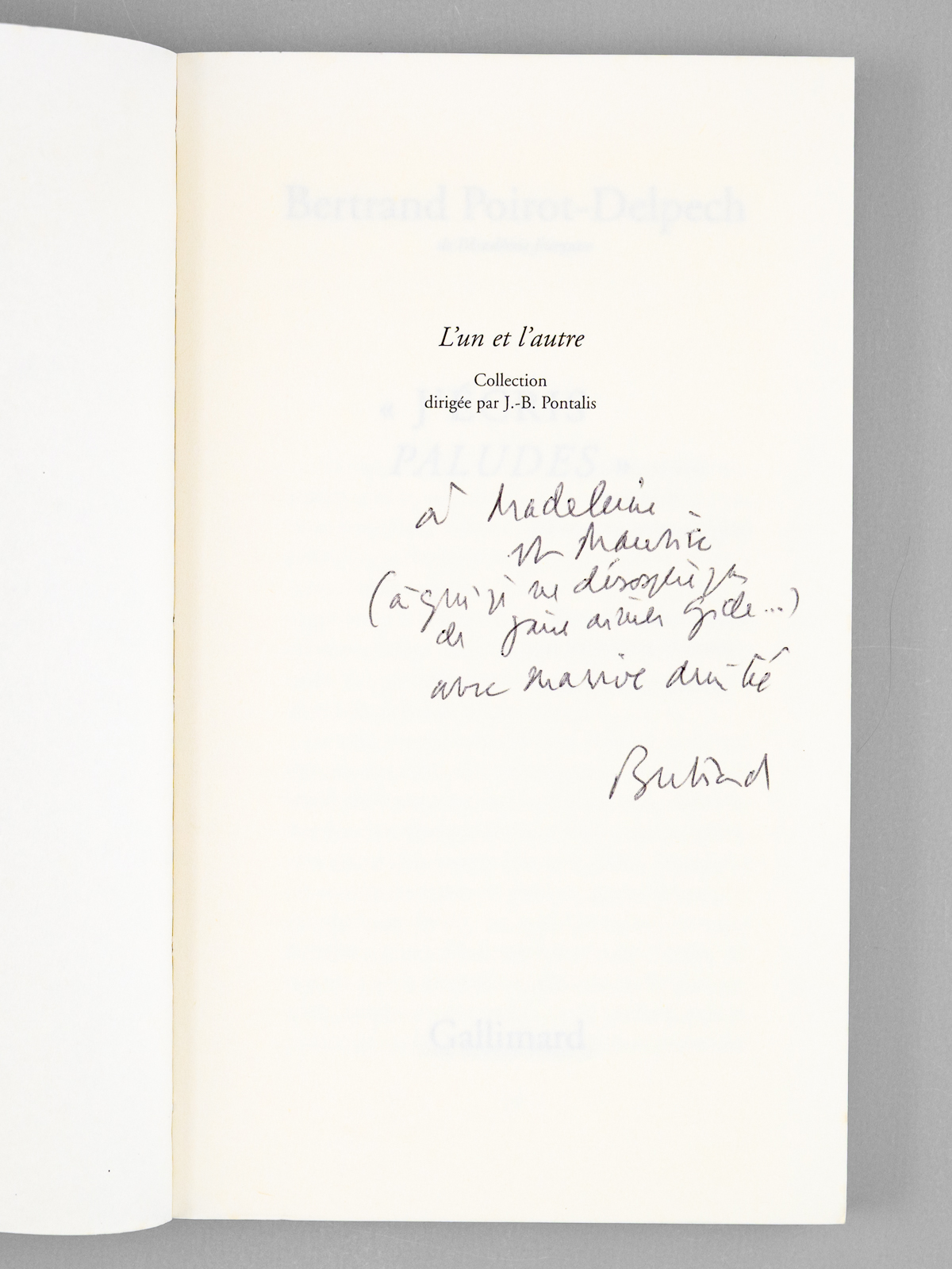 Commentaire : Bel envoi de l'Académicien Bertrand Poirot-Delpech à : 'A Madeleine et Maurice (à qui je e désespère pas de faire aimer Gide...). Avec ma vive amitié'. Bon état pour cet exemplaire de provenance prestigieuse : de la bibliothèque du grand écrivain Maurice Druon, Secrétaire Perpétuel de l'Académie Française de 1985 à 1999, auteur des 'Rois Maudits' et co-auteur avec son oncle Joseph Kessel du 'Chant des Partisans'.