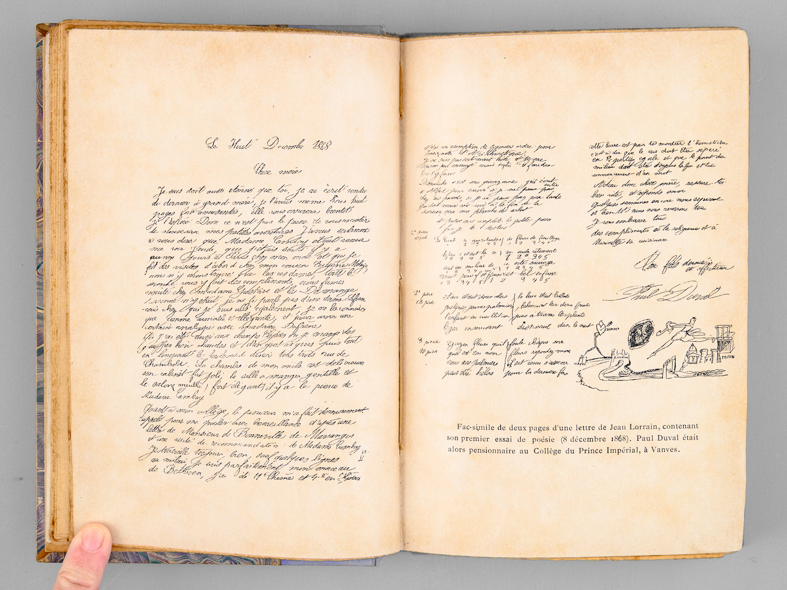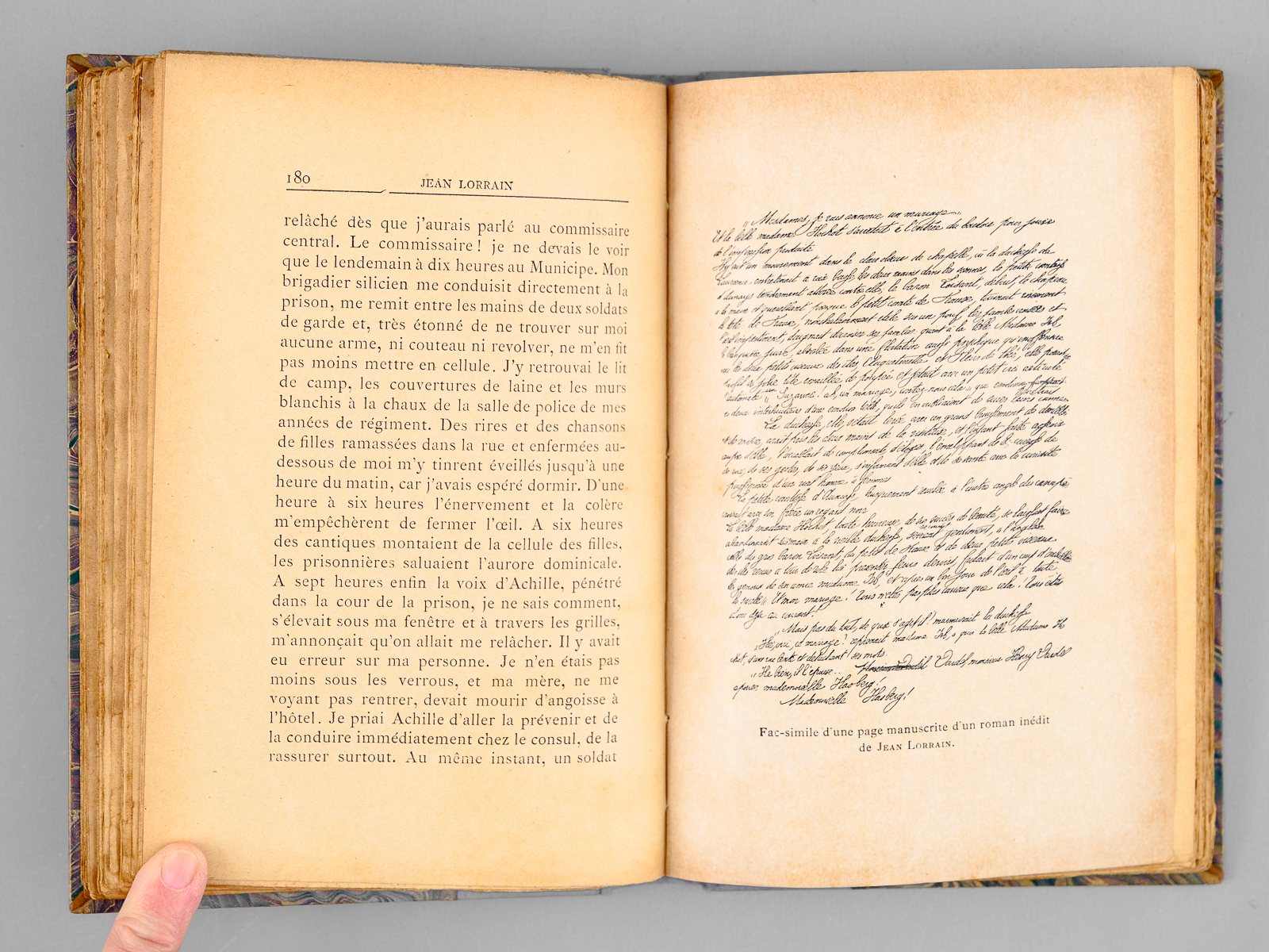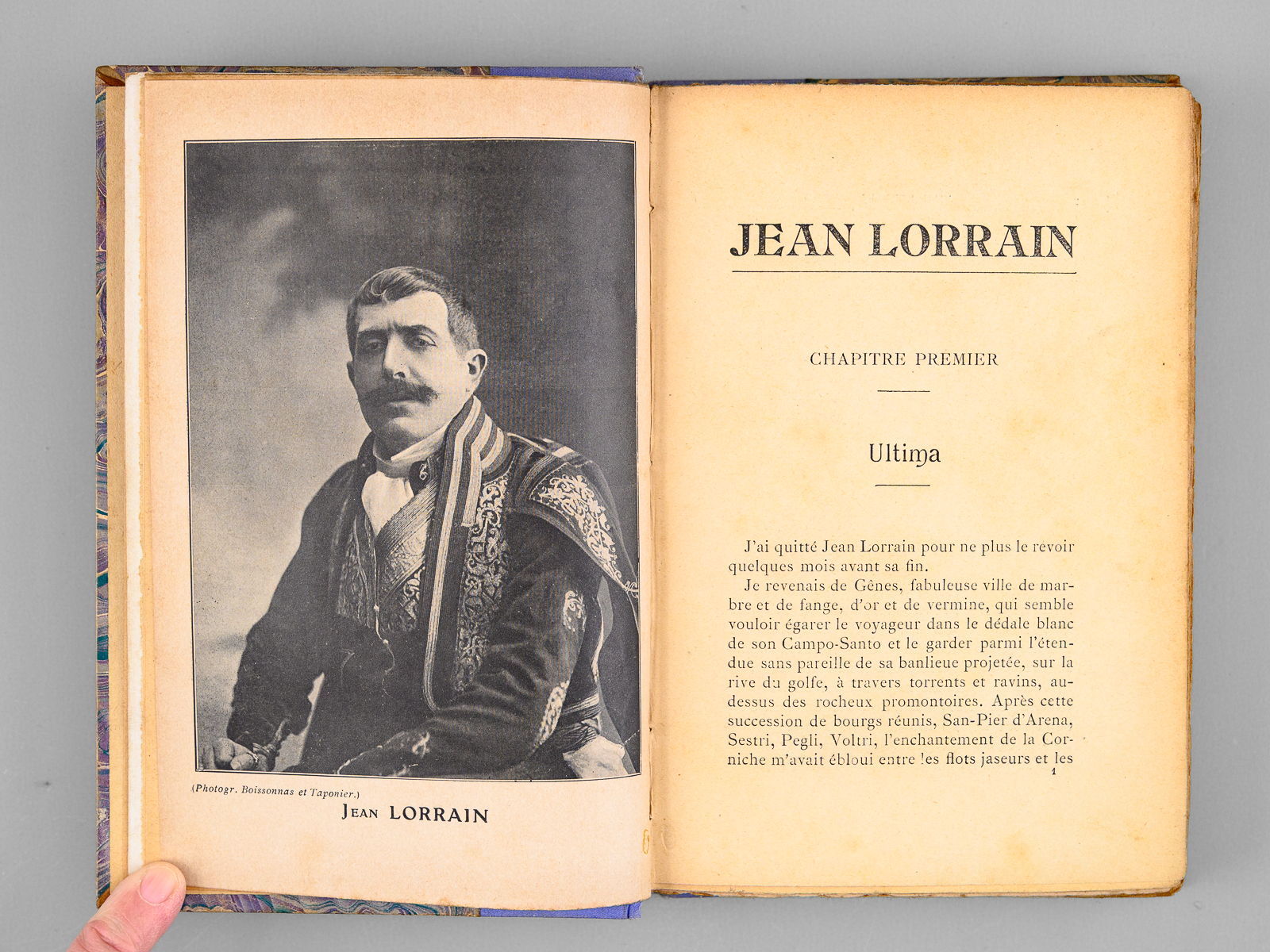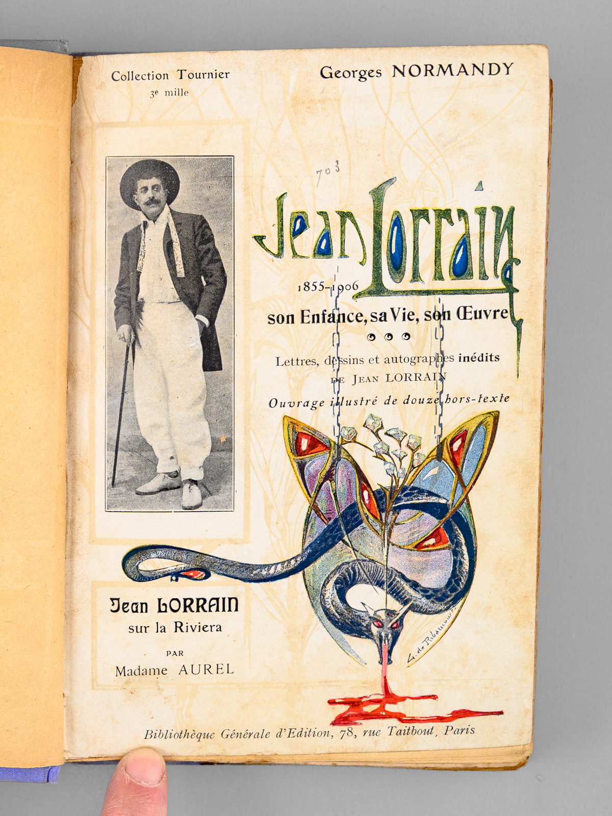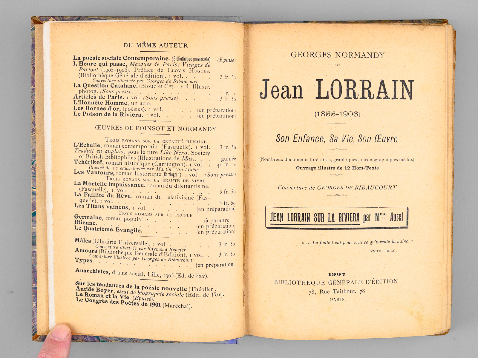 Nombreux documents littéraires, graphiques et iconographiques inédits, Ouvrage illustré de 12 hors-texte, Couverture de Georges de Ribaucourt, Jean Lorrain sur la Riviera par Mme Aurel, mention de 3e mille en couverture conservée, 1 vol. in-12 reliure de l'époque bradel demi-percaline mauve, couvertures conservées, Bibliothèque Générale d'Edition, Paris, 1907, 341 pp. et 4 ff. n. ch. Commentaire : Rare exemplaire du tirage ordinaire de l'édition originale (après 4 exemplaires sur Japon), bien complet de la couverture illustrée. Bon état (reliure très lég. frottée)