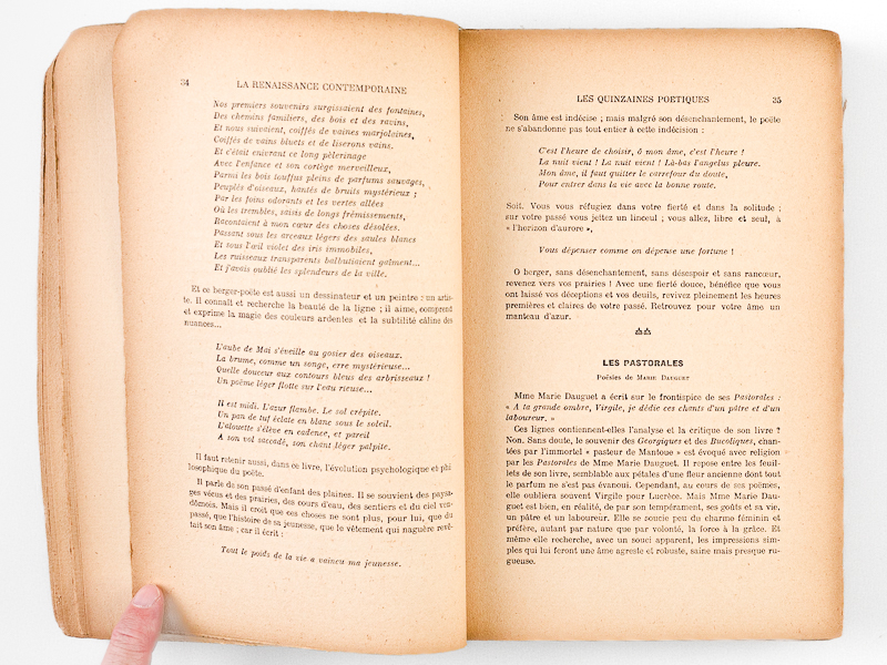 2 vol. fort in-8 br., Poëtes Français. Première Anthologie de la Renaissance Contemporaine, précédées des Quinzaines Poëtiques par Robert Veyssié et d'une Etude critique par Edouard Schuré, 6e Année Tome VI, n°7 [ On joint : ] Prosateurs français. Deuxième anthologie de la Renaissance Contemporaine, avec une Introduction Les Tendances Nouvelles de la Littérature par Alphonse Roux, 6e Année Tome VI, n°11-12-13-14-15-16, La Renaissance Contemporaine, Paris, 1912, 340 et 407 pp. Commentaire : Ensemble peu commun. Etat satisfaisant (dos du second volume et un feuillet restauré). Prix du lot, non séparable.