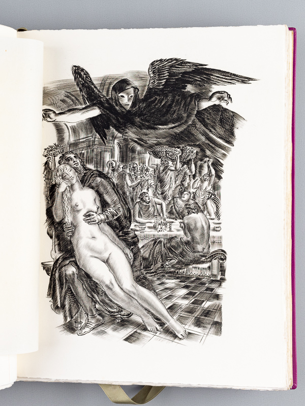 Un des 25 exemplaires hors commerce numérotés en chiffres romains, réservés aux collaborateurs et signés de l'éditeur (n° H.C. X), avec en frontispice un lavis original et une dédicace de Decaris, Traduites en Français par Remy Belleau & Illustrées par Albert Decaris, 1 vol. in-folio reliure plein cuir mauve, dos à 4 nerfs, Les Editions Henri Javal, 1950, 212 pp. et 4 ff. avec un lavis original signé, un frontispice et 20 planches hors texte Commentaire : Belle édition, proposant le texte français, suivi du texte grec, dans un exemplaire du tirage hors commerce enrichi d'une aquarelle originale, signée par Decaris. Etat satisfaisant (petite mouill. ayant décoloré le dos, notice contrecollée en seconde garde, très bon état par ailleurs). Prix en l'état.