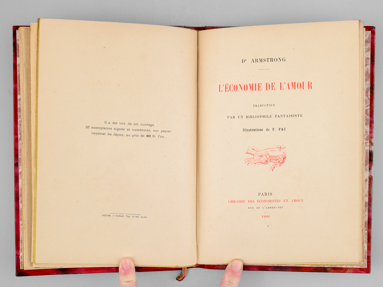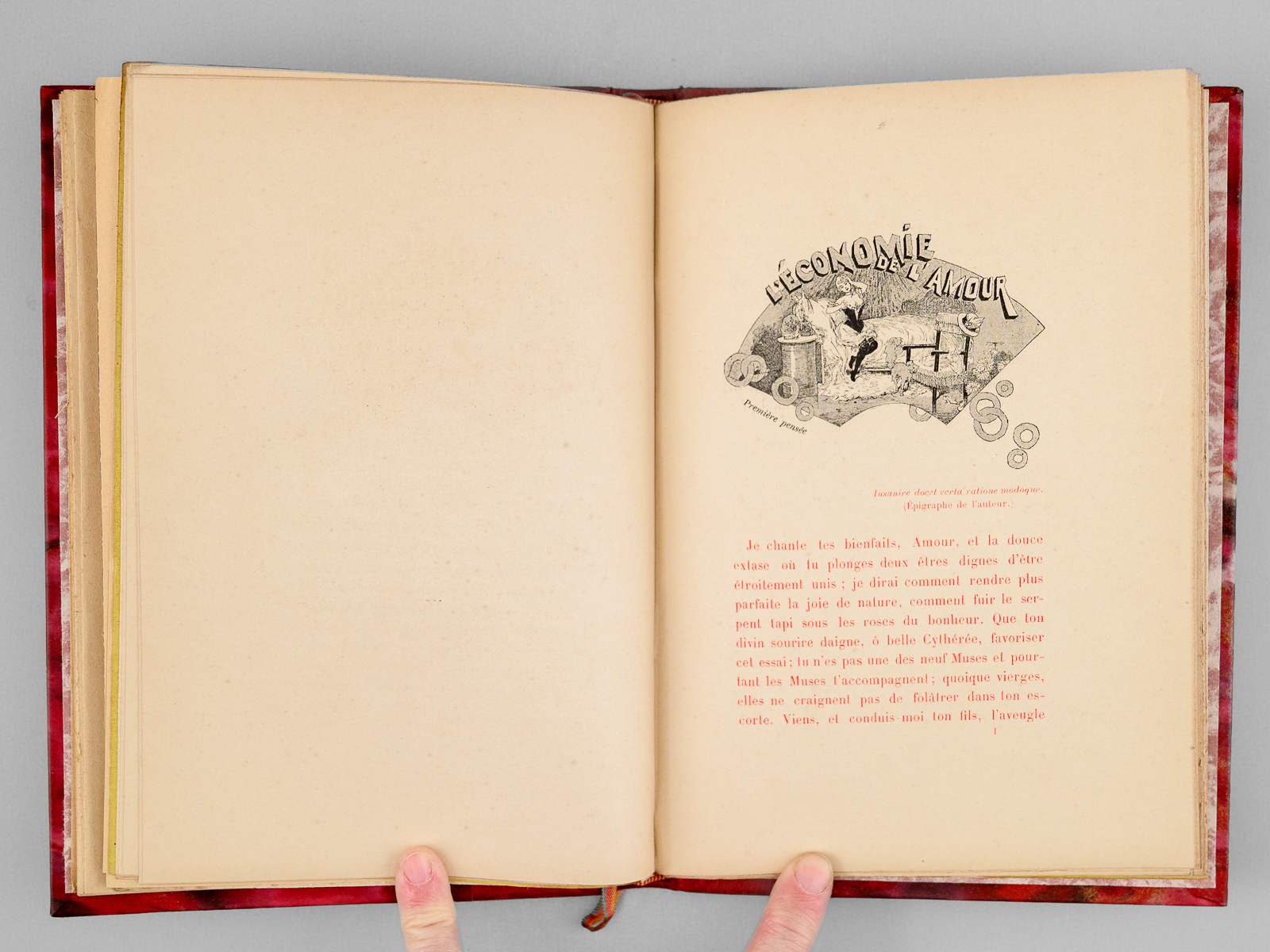 Commentaire : Ce volume réunit un poème d'amour et de jalousie par Aurélien Scholl à la traduction de 'The Oeconomy of Love', du médecin écossais John Armstrong. Etat très satisfaisant (reliure un peu frottée, fortes rouss. dans le premier titre, bon état par ailleurs)