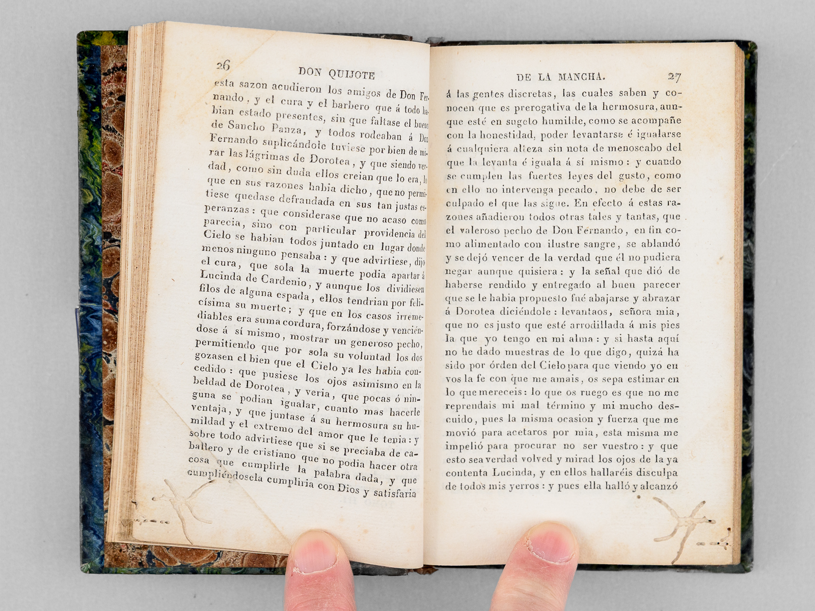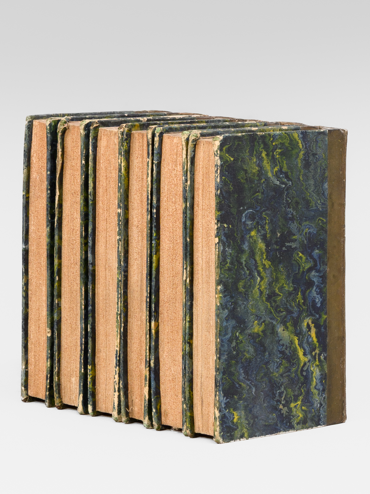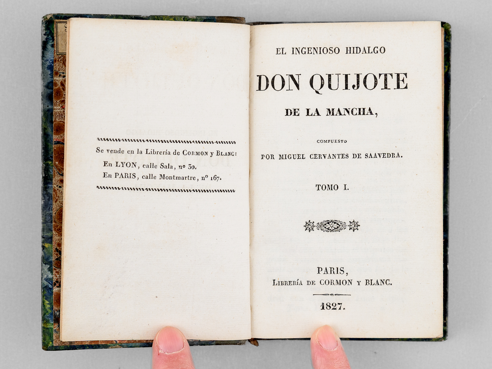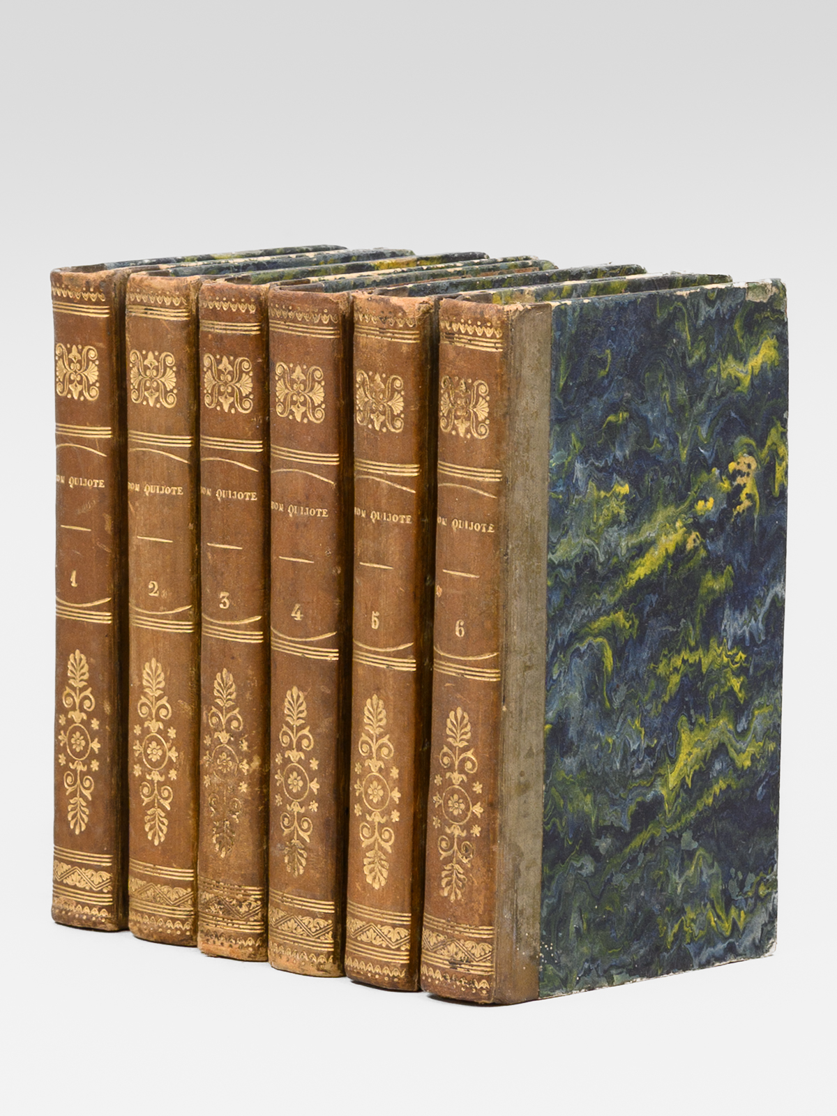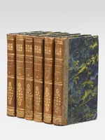 6 vol. in-18 reliure de l'époque demi-veau brun, dos lisse, reliure signée de Taillade, relieur à Bernay, Libreria de Cormon y Blanc , Paris, 1827, 2 ff., LXVII-212 pp. ; 2 ff., 301 pp. ; 2 ff., 267 pp. ; 2 ff., XII-284 pp. ; 2 ff., 284 pp. ; 2 ff., 273 pp. Commentaire : Etat satisfaisant (petit travail de vers n'affectant pas le texte en coins des 25 premiers feuillets du tome 3, petit poinçonnage en début du tome 6, reliures un peu frottées, une coupe frottée) pour cette petite édition peu commune du Don Quichotte.