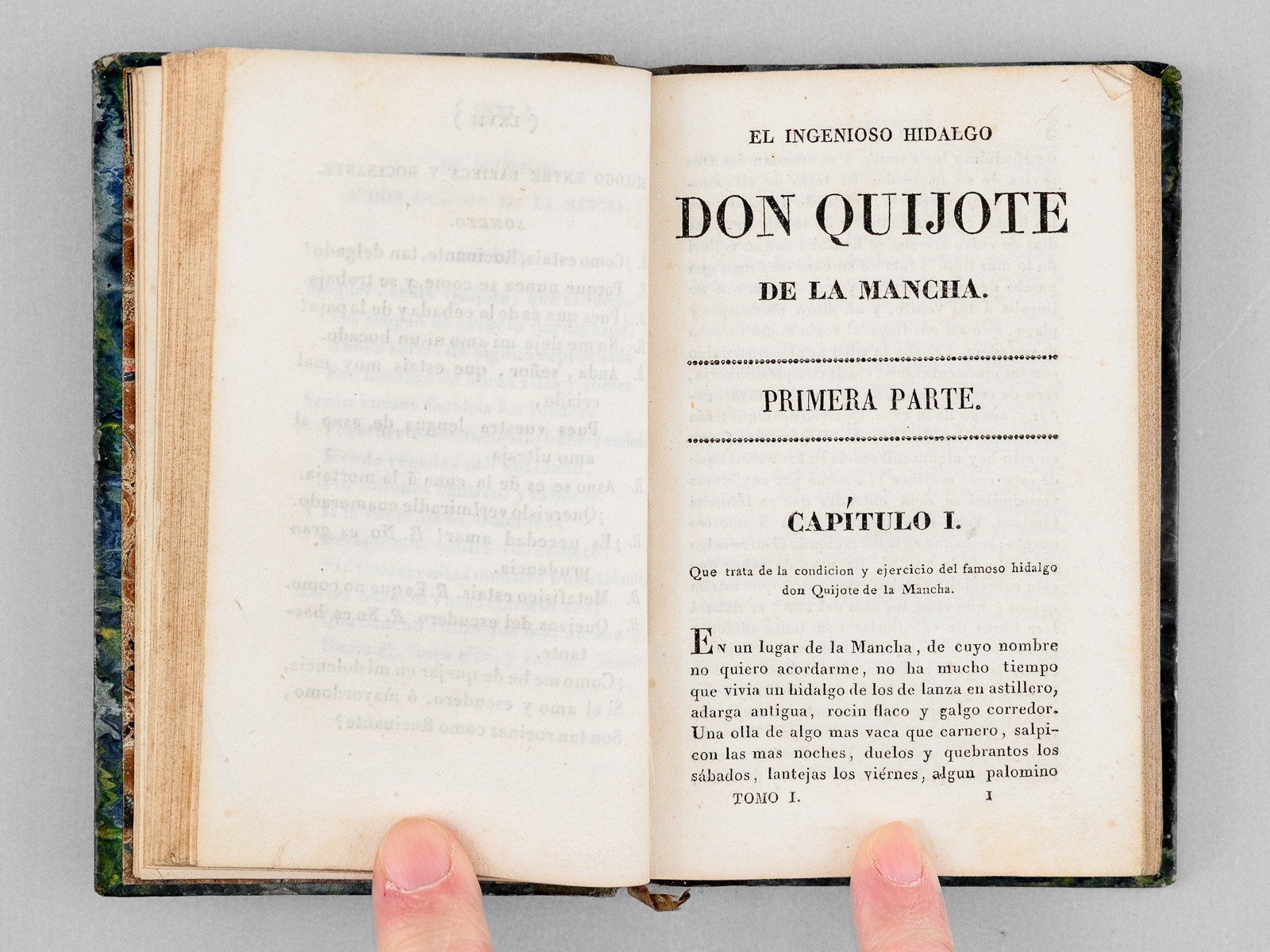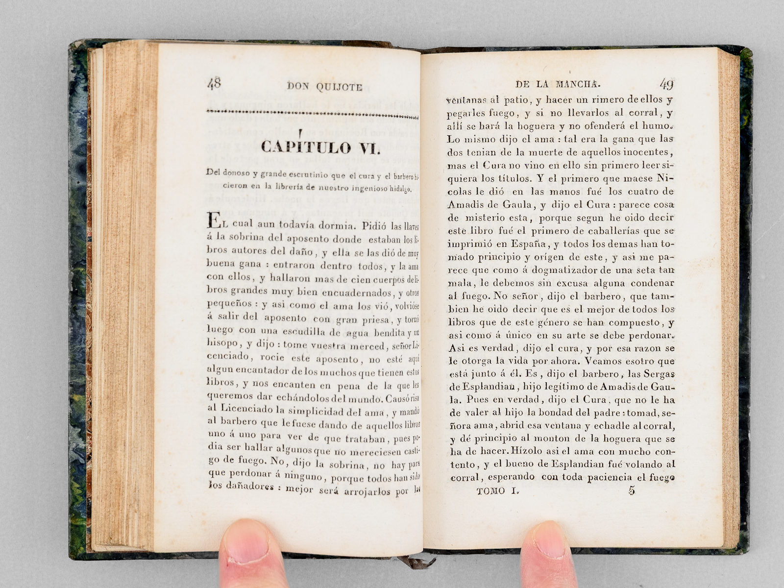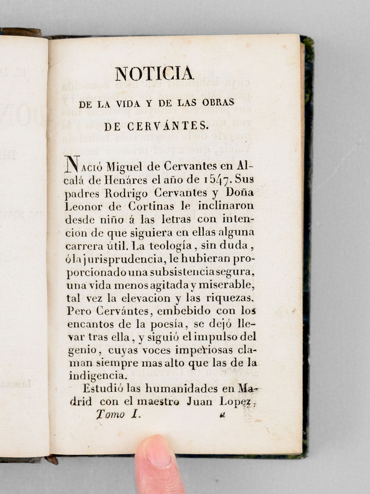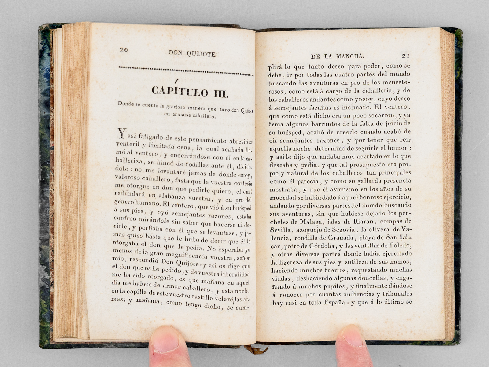 6 vol. in-18 reliure de l'époque demi-veau brun, dos lisse, reliure signée de Taillade, relieur à Bernay, Libreria de Cormon y Blanc , Paris, 1827, 2 ff., LXVII-212 pp. ; 2 ff., 301 pp. ; 2 ff., 267 pp. ; 2 ff., XII-284 pp. ; 2 ff., 284 pp. ; 2 ff., 273 pp. Commentaire : Etat satisfaisant (petit travail de vers n'affectant pas le texte en coins des 25 premiers feuillets du tome 3, petit poinçonnage en début du tome 6, reliures un peu frottées, une coupe frottée) pour cette petite édition peu commune du Don Quichotte.