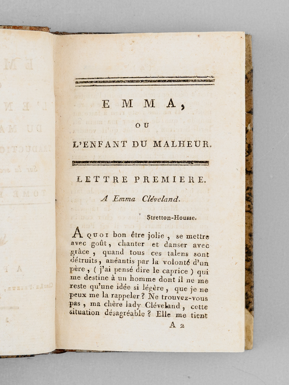 Commentaire : Traduction française de 'Emma Or the Child of Sorrow: A Novel'. Une autre traduction, parue en 1788, avait pour titre 'Histoire de Lady Cleveland'. Bon état (dos lég. frottés, qq. pliure à qq. feuillets).