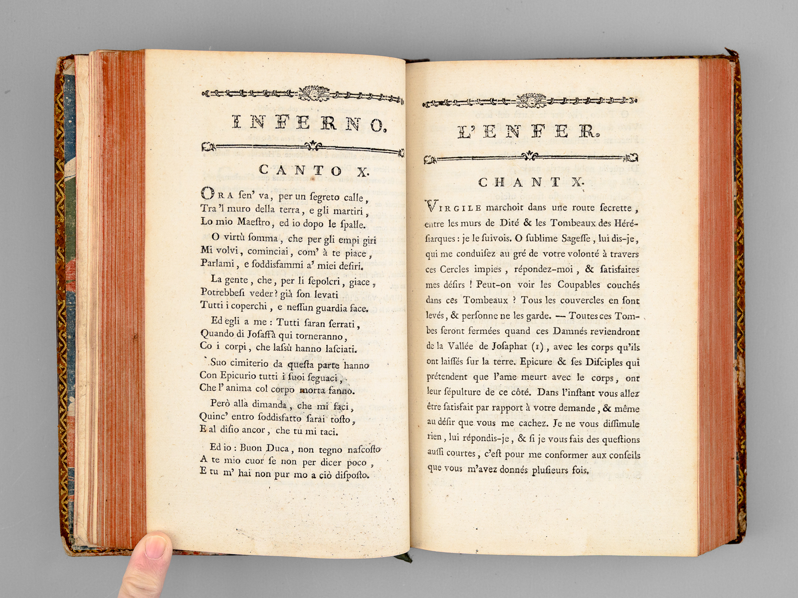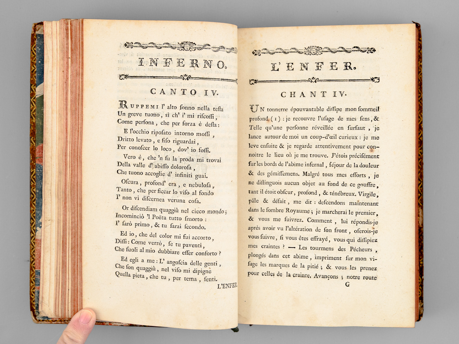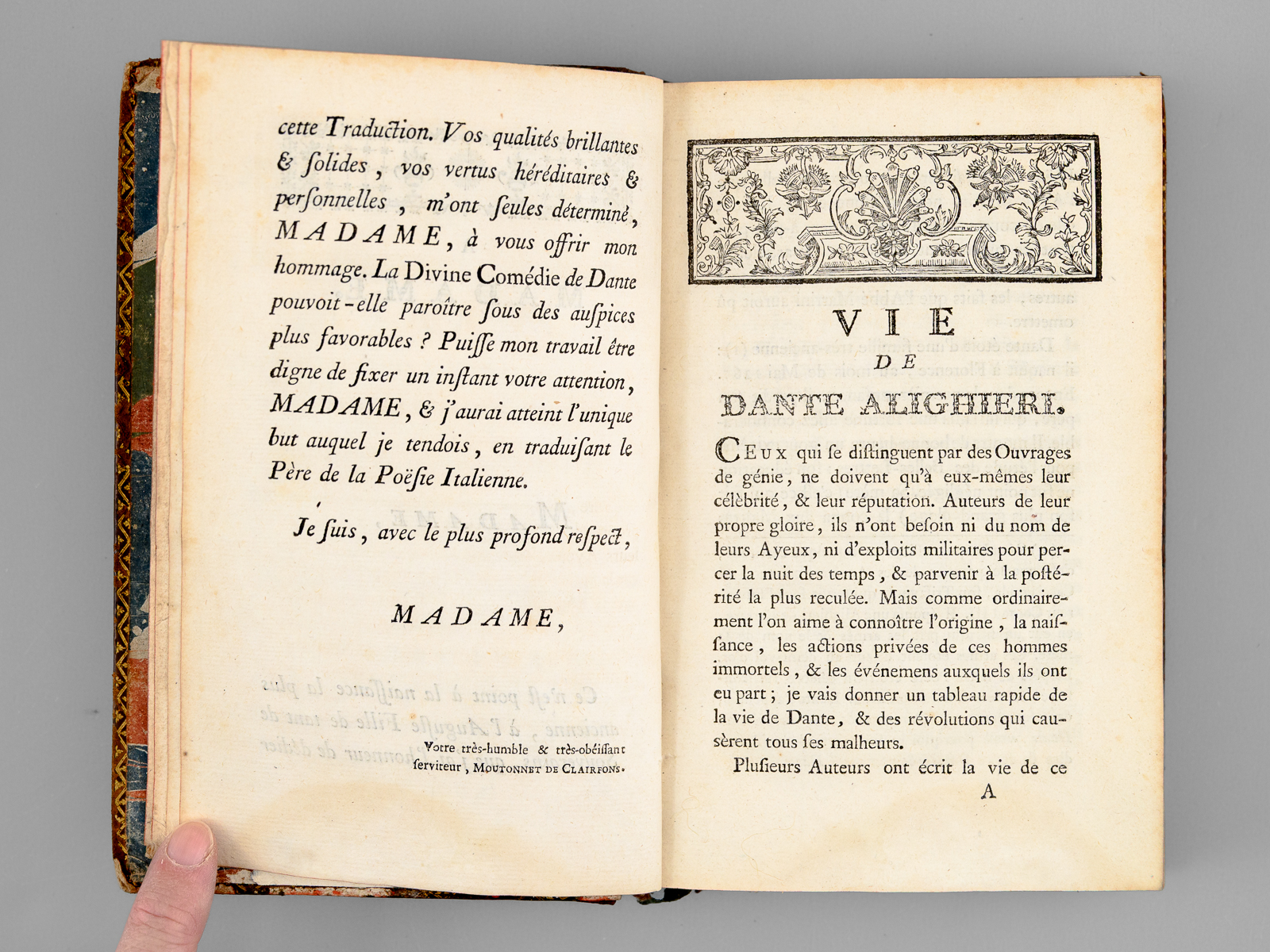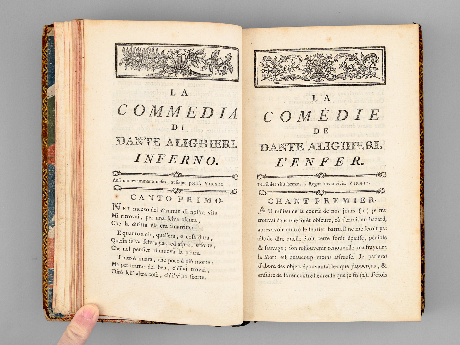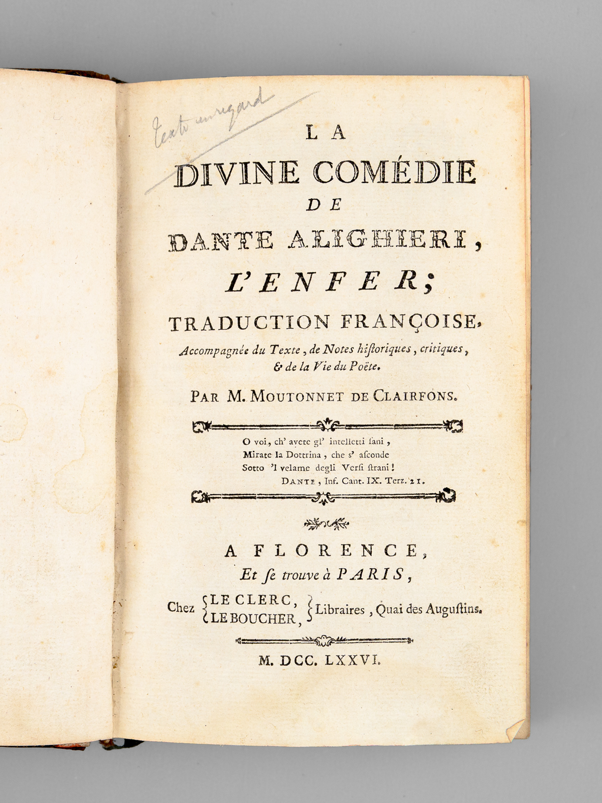 Par M. Moutonnet de Clairfons, 1 vol. in-8 reliure de l'époque pleine veau marbré, dos à 5 nerfs orné, Chez Le Clerc, Le Boucher, A Florence, Et se trouve à Paris, 1776, 2 ff., 577 pp. Commentaire : Rare exemplaire de cette édition proposant l'un des toutes premières traduction française en prose de l'Enfer de Dante. Etat satisfaisant (forte mouillure en queue avec mq. de cuir en dos et plats, bon état par ailleurs). Prix en l'état