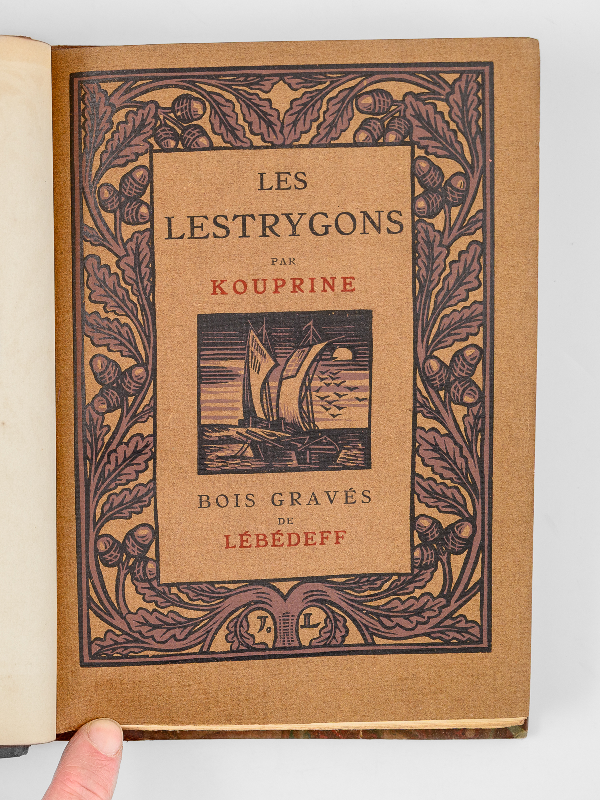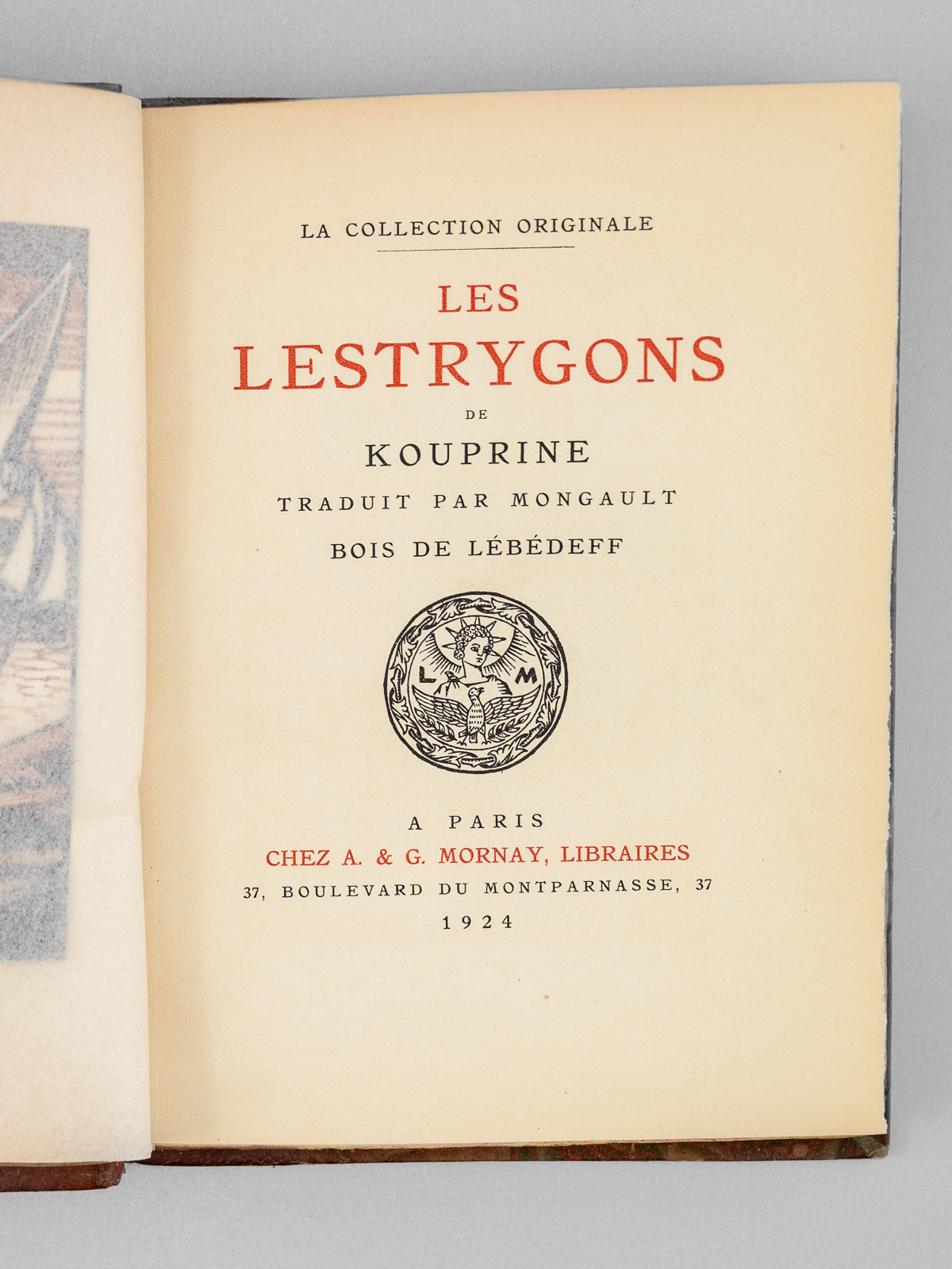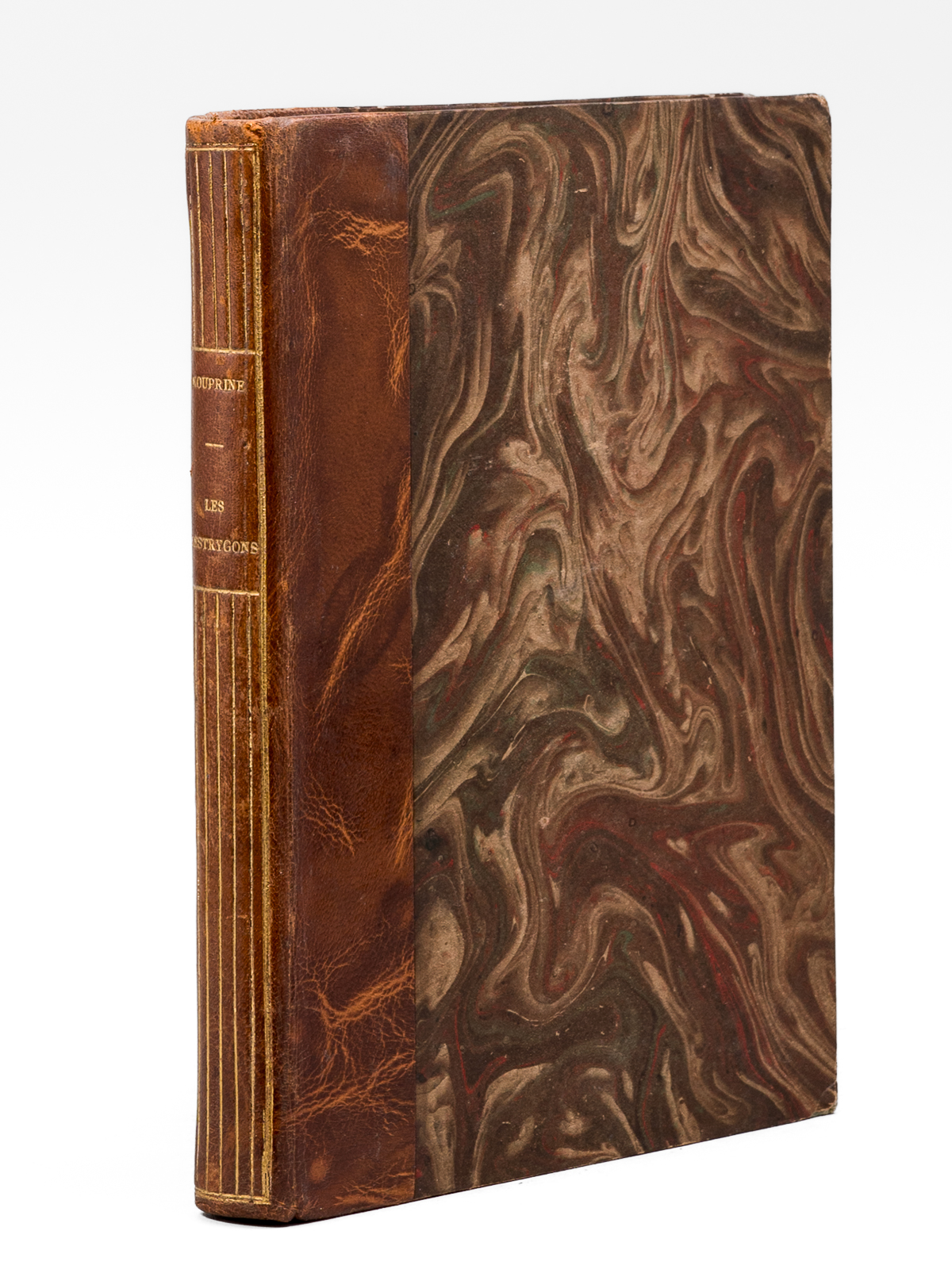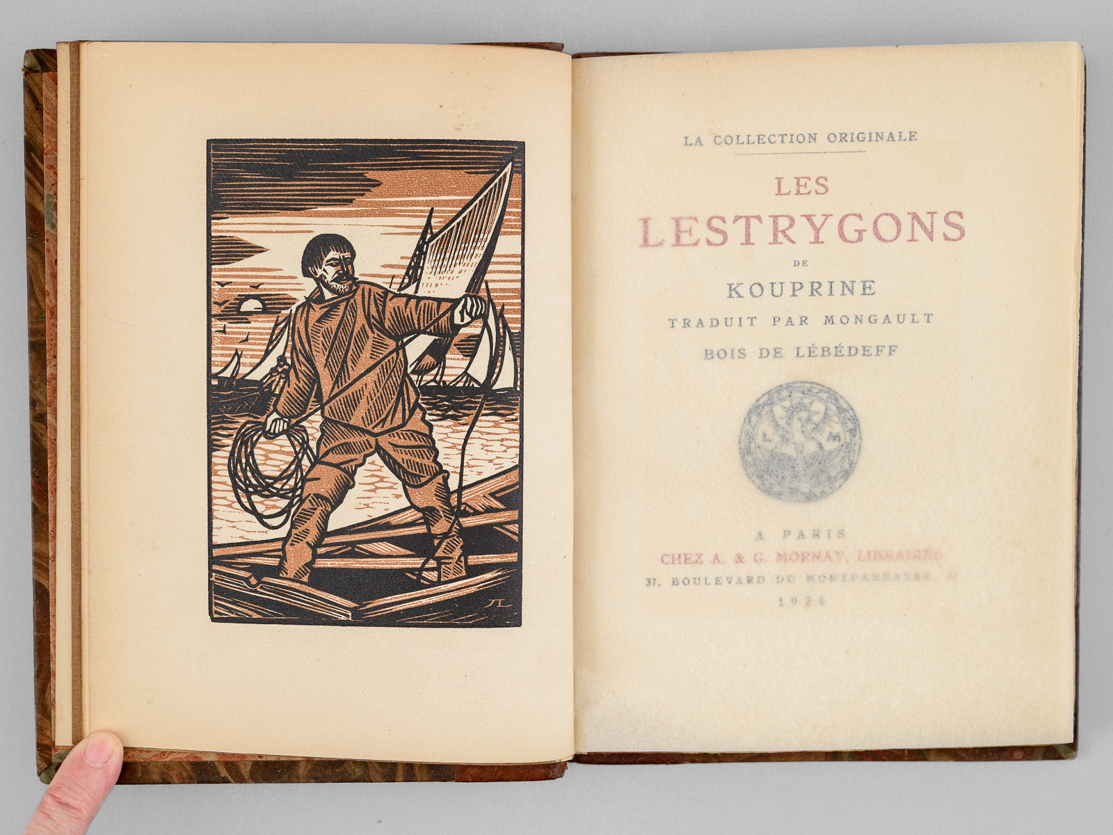 Un des 902 exemplaires sur vélin de Rives à la forme numéroté (n° 94), Traduit par Mongault, Bois de Lébédeff, 1 vol. in-8 reliure demi-basane marbrée, tête dorée, couverture conservée, La Collection Originale, Chez A. & G. Mornay, Libraires, Paris, 1924, 239 pp. Commentaire : Sur les bords de la Mer Noire, les descendants du peuple mythique naïf et rude visité par Ulysse sont décrits en ce début de XXe siècle par l'écrivain russe Alexandre Kouprine (1870-1938) que Nabokov qualifiera de ' Vladimir Nabokov le qualifie de « Kipling russe, pour ses histoires pathétiques d'aventuriers déracinés, souvent névrotiques et vulnérables'. Bon état (dos et coupes lég. frottés, bon exemplaire par ailleurs)