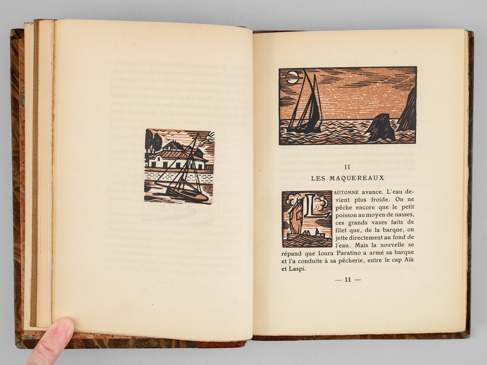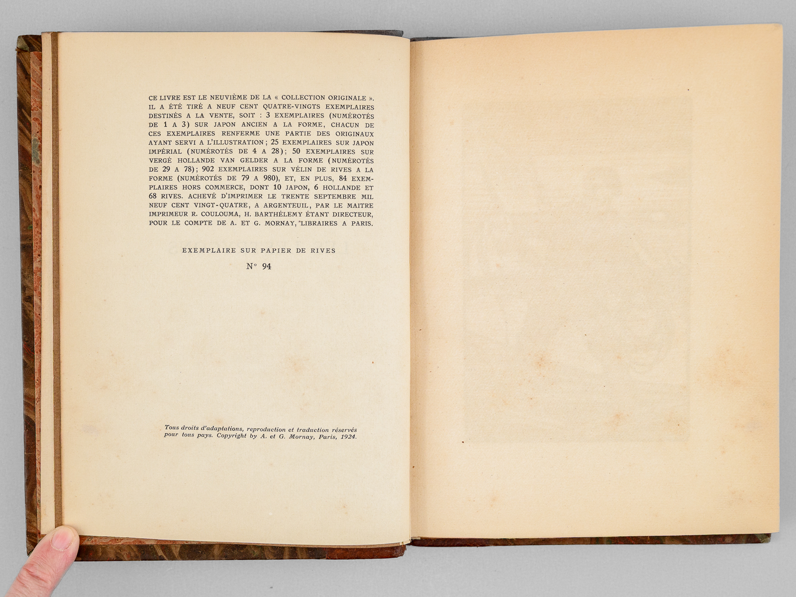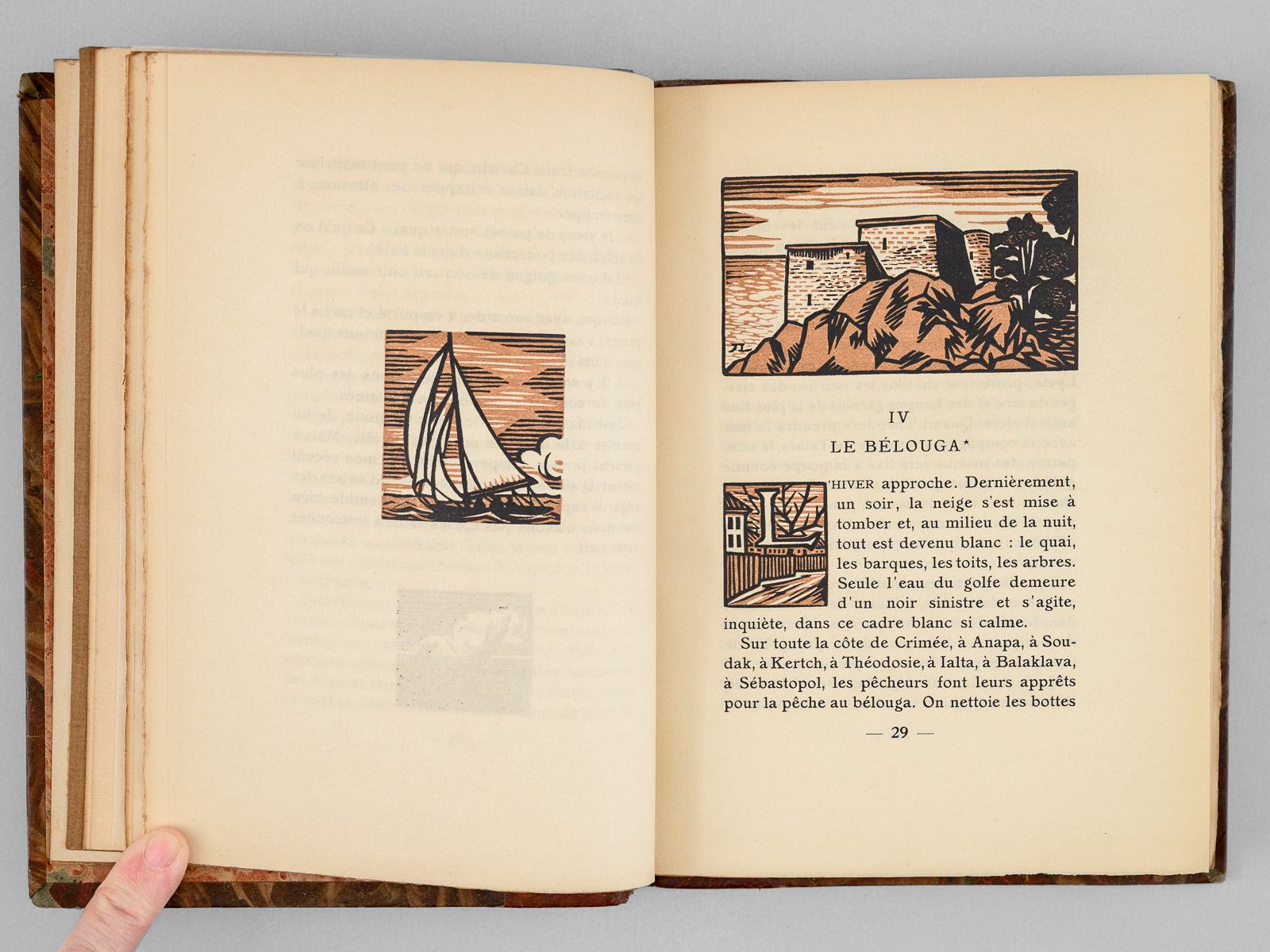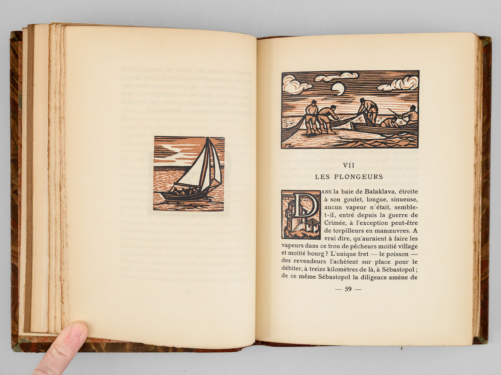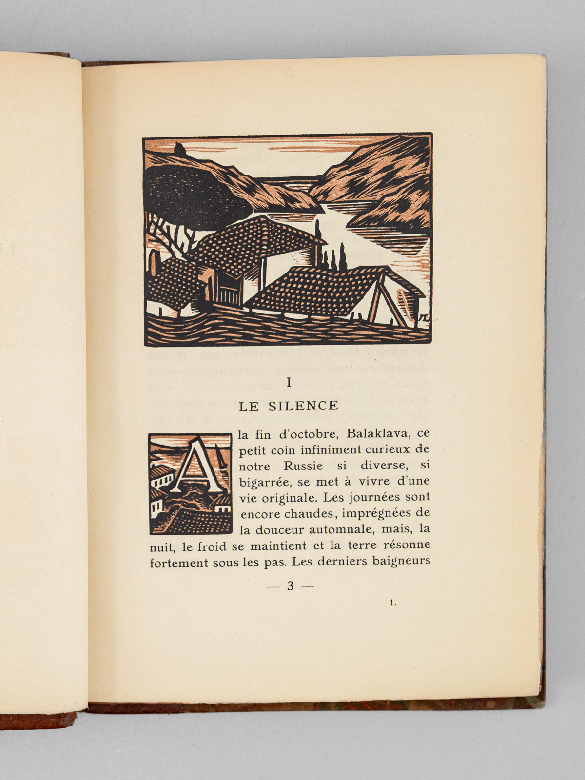 Un des 902 exemplaires sur vélin de Rives à la forme numéroté (n° 94), Traduit par Mongault, Bois de Lébédeff, 1 vol. in-8 reliure demi-basane marbrée, tête dorée, couverture conservée, La Collection Originale, Chez A. & G. Mornay, Libraires, Paris, 1924, 239 pp. Commentaire : Sur les bords de la Mer Noire, les descendants du peuple mythique naïf et rude visité par Ulysse sont décrits en ce début de XXe siècle par l'écrivain russe Alexandre Kouprine (1870-1938) que Nabokov qualifiera de ' Vladimir Nabokov le qualifie de « Kipling russe, pour ses histoires pathétiques d'aventuriers déracinés, souvent névrotiques et vulnérables'. Bon état (dos et coupes lég. frottés, bon exemplaire par ailleurs)