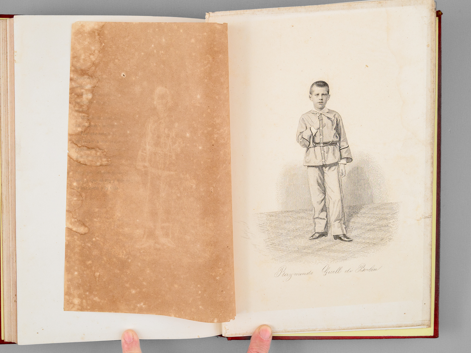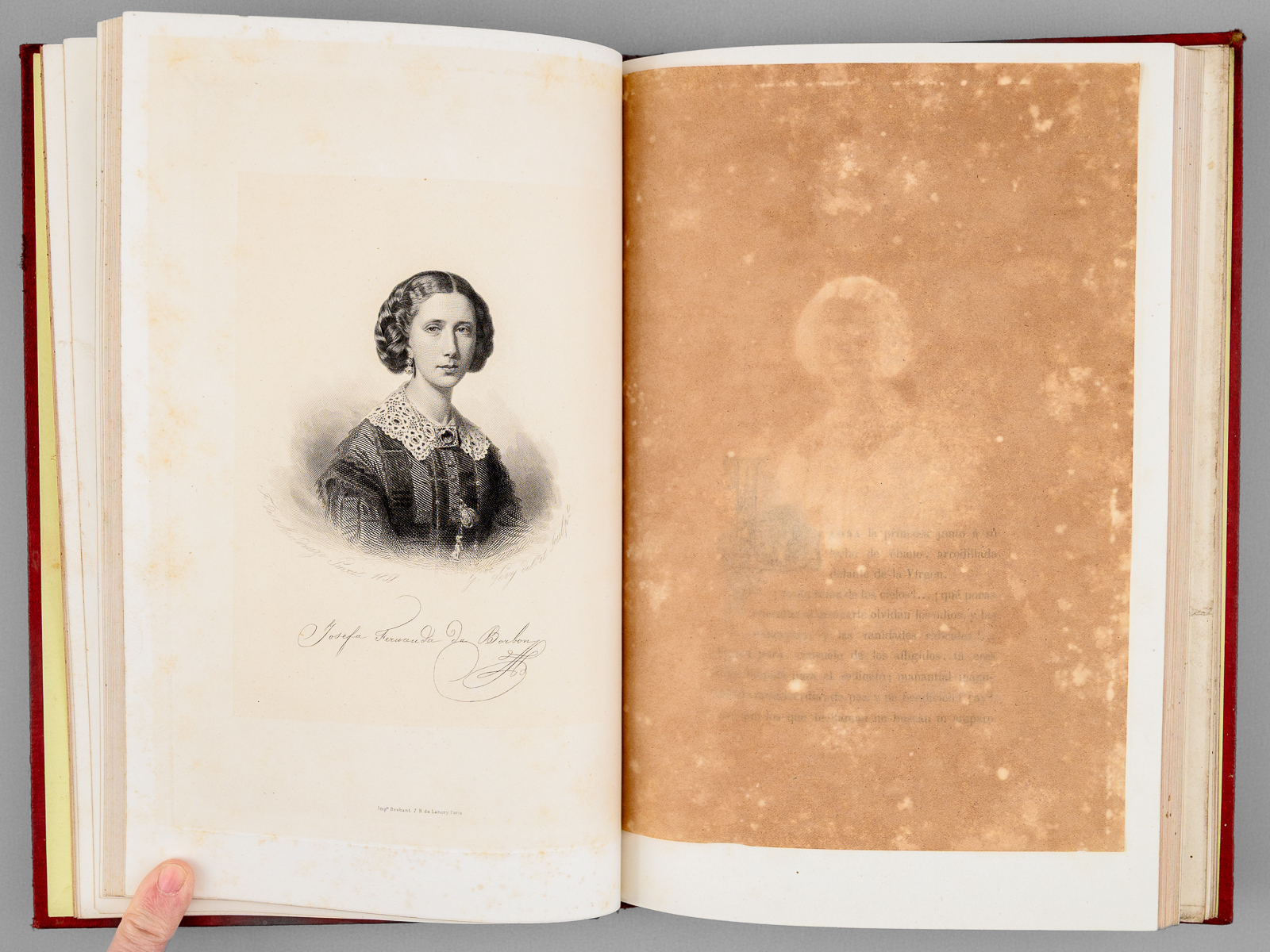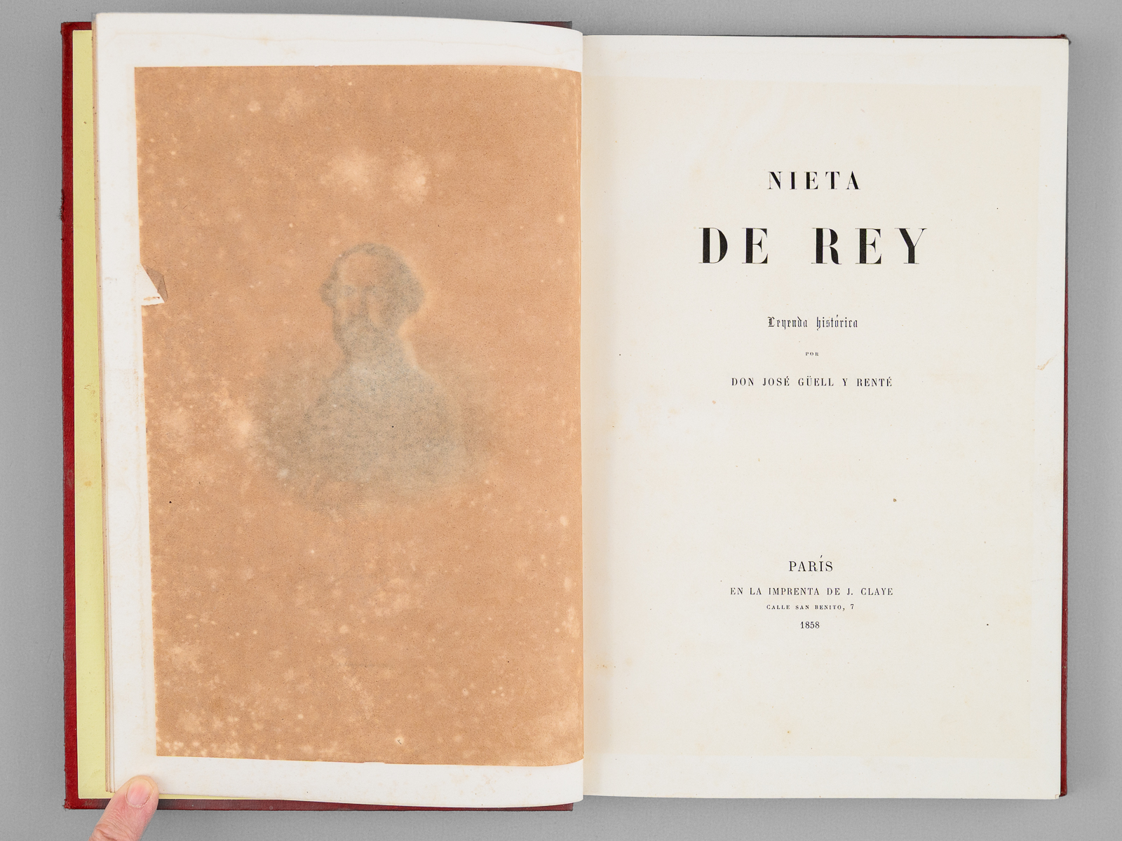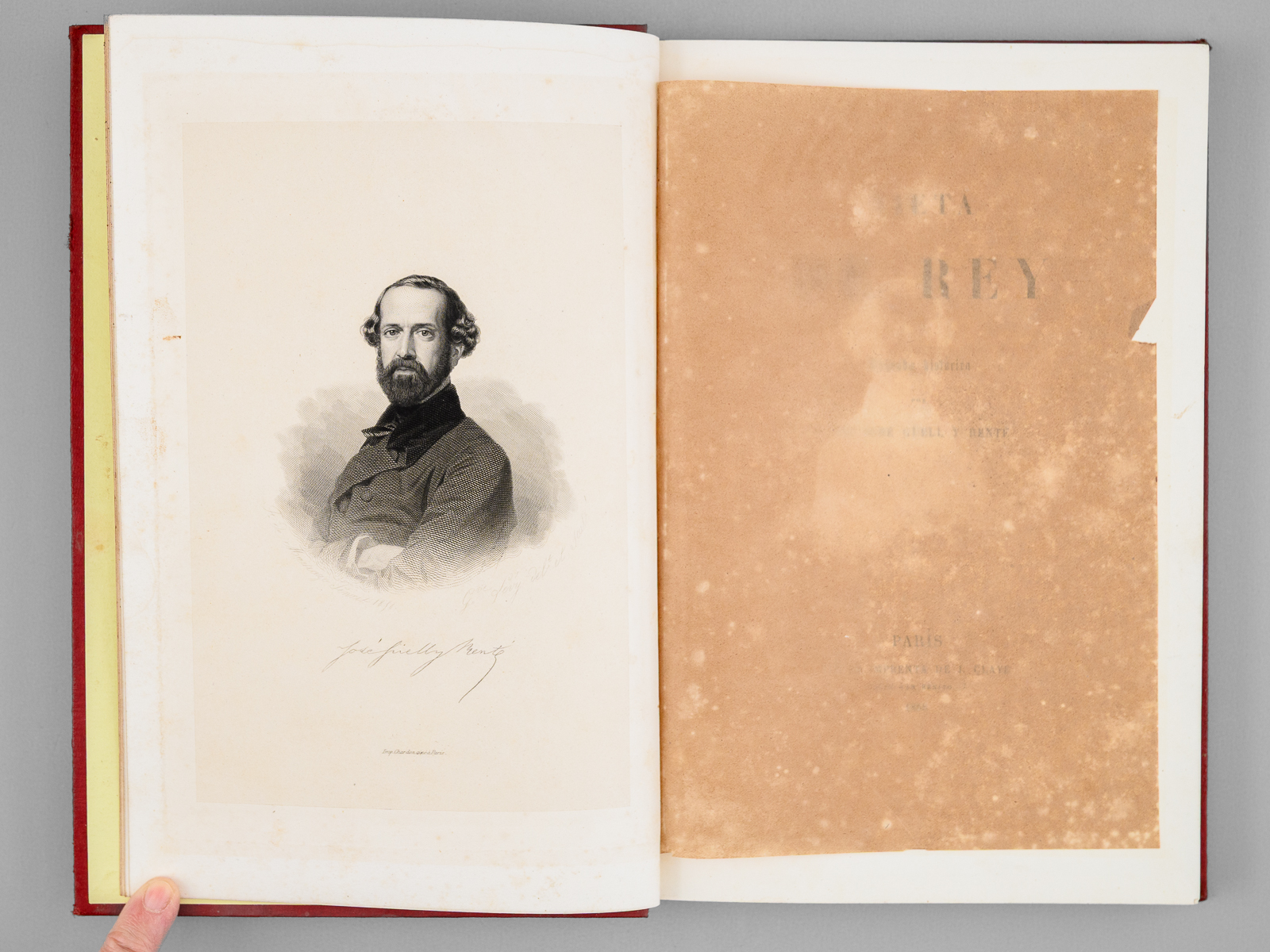 Commentaire : L'écrivain espagnol José Güell y Renté (1818-1884) est fameux pour avoir épousé l'infante espagnole Josefina Fernanda de Bourbon, soeur du roi consort, ce qui les condamna tous deux à l'exil. Un temps député de Valladolid, il reprendra le chemin de l'exil en 1856. Etat satisfaisant (l'exemplaire est d'une fraîcheur remarquable, à l'exception d'une planche, débrochée peut-être depuis l'origine, lég. frottée et victime d'un accroc en marge).
