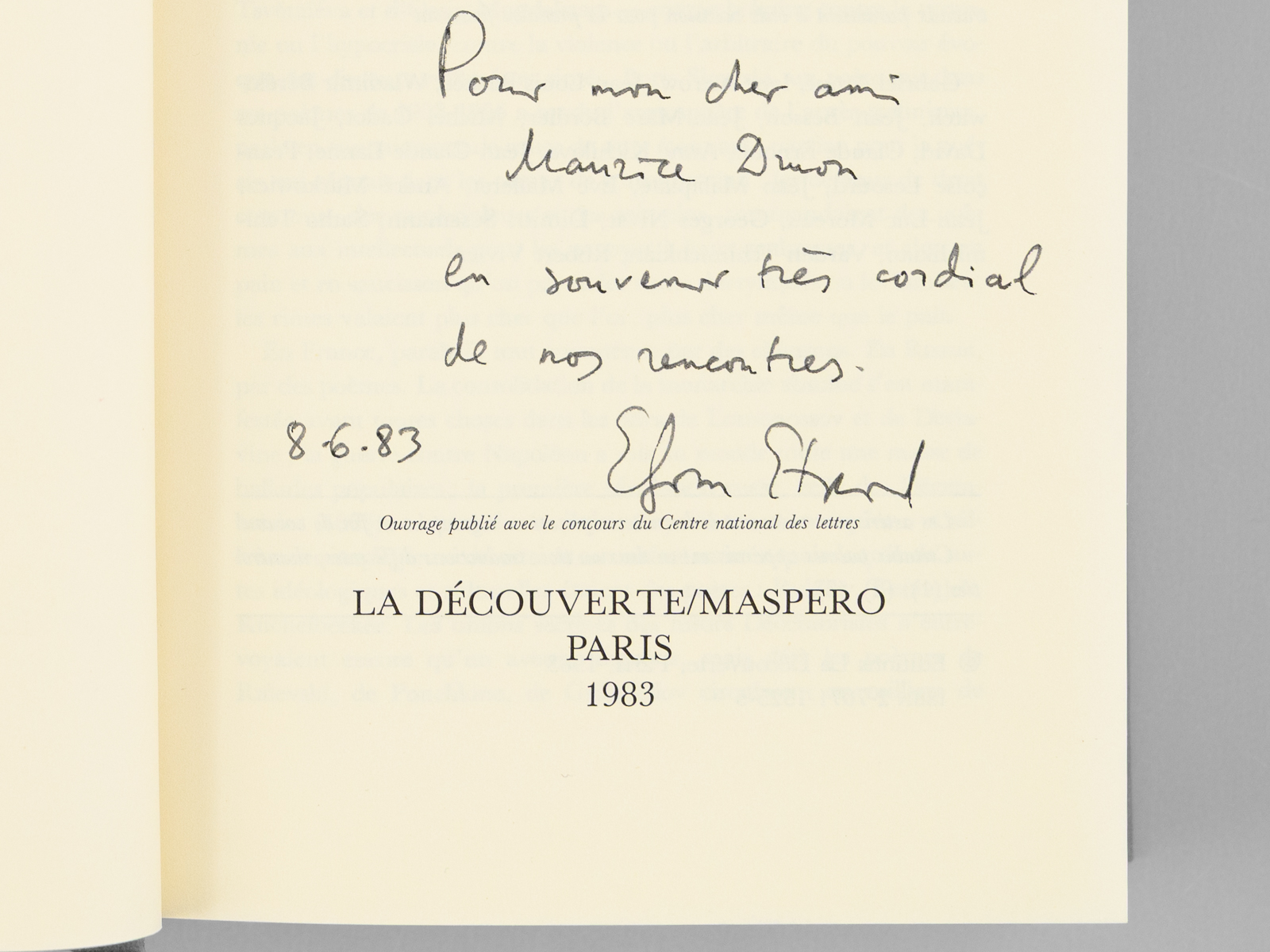 Commentaire : Bel envoi de l'auteur, le linguiste et écrivain russe Efim Etkind, 'Pour mon cher ami Maurice Druon, en souvenir très cordial de nos rencontres'. De la bibliothèque du grand écrivain Maurice Druon, Secrétaire Perpétuel de l'Académie Française de 1985 à 1999. Chassé de l'Institut Herzen en 1974, Efim Etkind viendra enseigner à l'Université de Nanterre.. Bon état (sans la jaquette)