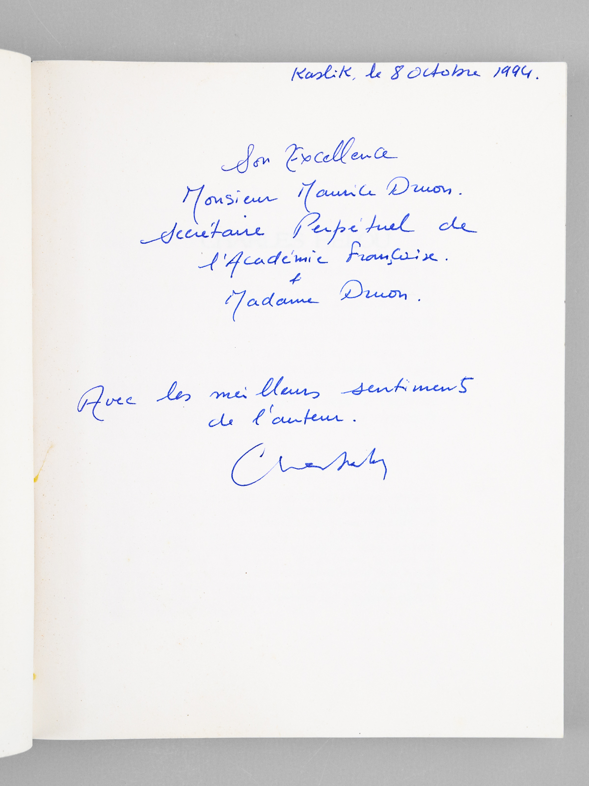 Commentaire : Bel envoi de Charles Helou à 'S.E. Monsieur Maurice Druon Secrétaire Perpétuel de l'Académie Française et Madame Druon, avec les meilleurs sentiments de l'Auteur'. Etat très satisfaisant (couv. un peu frottée) pour cet exemplaire dédicacé à Maurice Druon par Charles Hélou (1913-2001), président de la République libanaise de 1964 à 1970.
