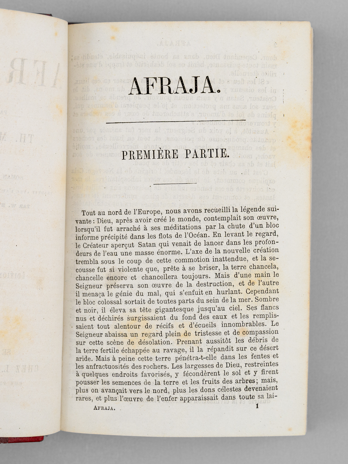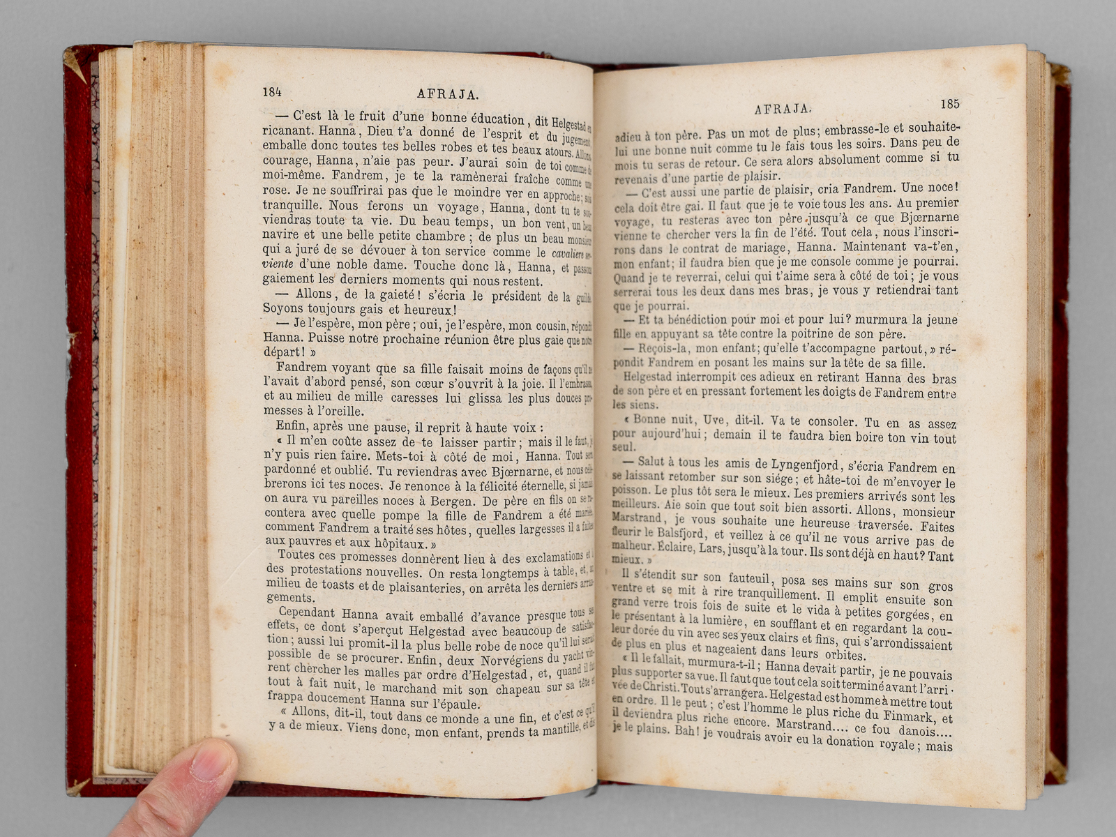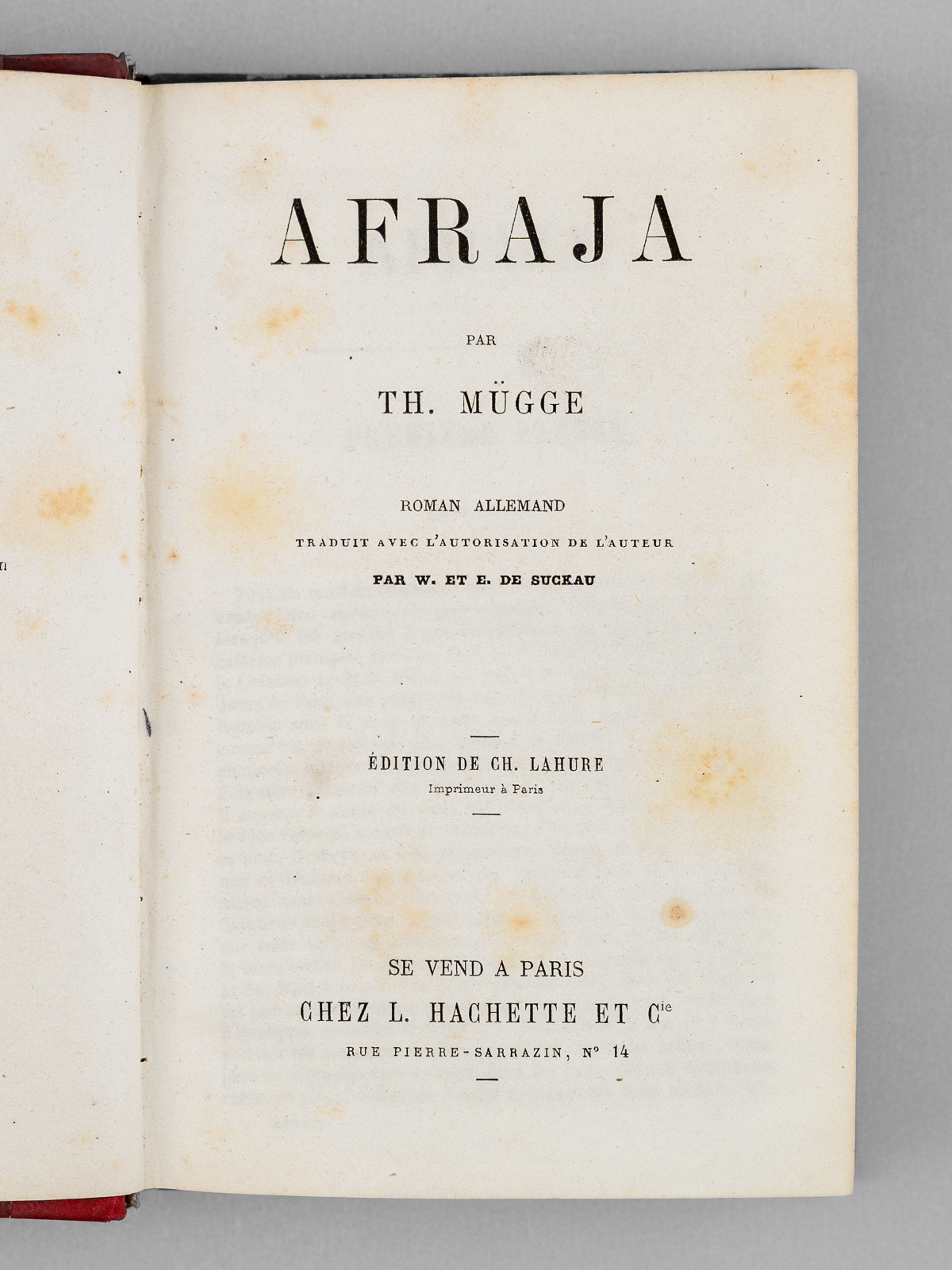 Traduit avec l'autorisation de l'auteur parW. et E. de Suckau, 1 vol. in-12 reliure de l'époque demi-chagrin rouge, dos à 4 nerfs dorés orné de caissons, Edition de Ch. Lahure, Chez L. Hachette, Paris, s.d. [ circa 1857-1860 ], 480 pp. Commentaire : Exemplaire bien relié de ce roman de Théodor Mügge ( 1802-1861). En Norvège, au milieu du XVIIIe siècle, l'exilé Johan Marstrand découvre une société clivée, les élites locales exploitant le peuple et un conflit violent oppose les sédentaires aux nomades Samis, spoliés de leurs terres. Figure centrale de cette résistance, le sorcier Afraja incarne la richesse et les mythes d'un peuple assimilé aux 'Indiens du Nord'. Etat très satisfaisant (usures en coupes, qq. rouss., cachet de colportage en garde, bon exemplaire par ailleurs).