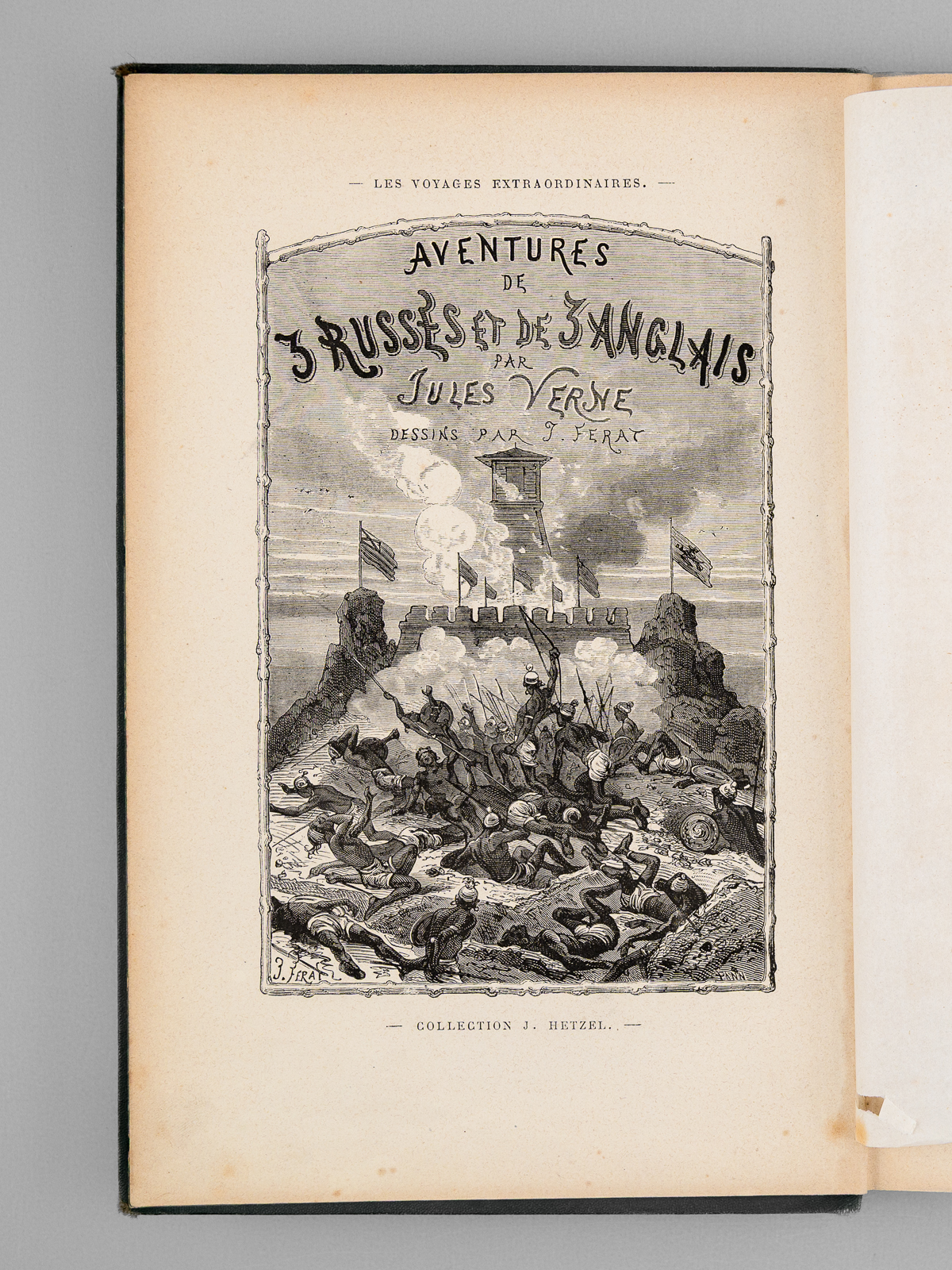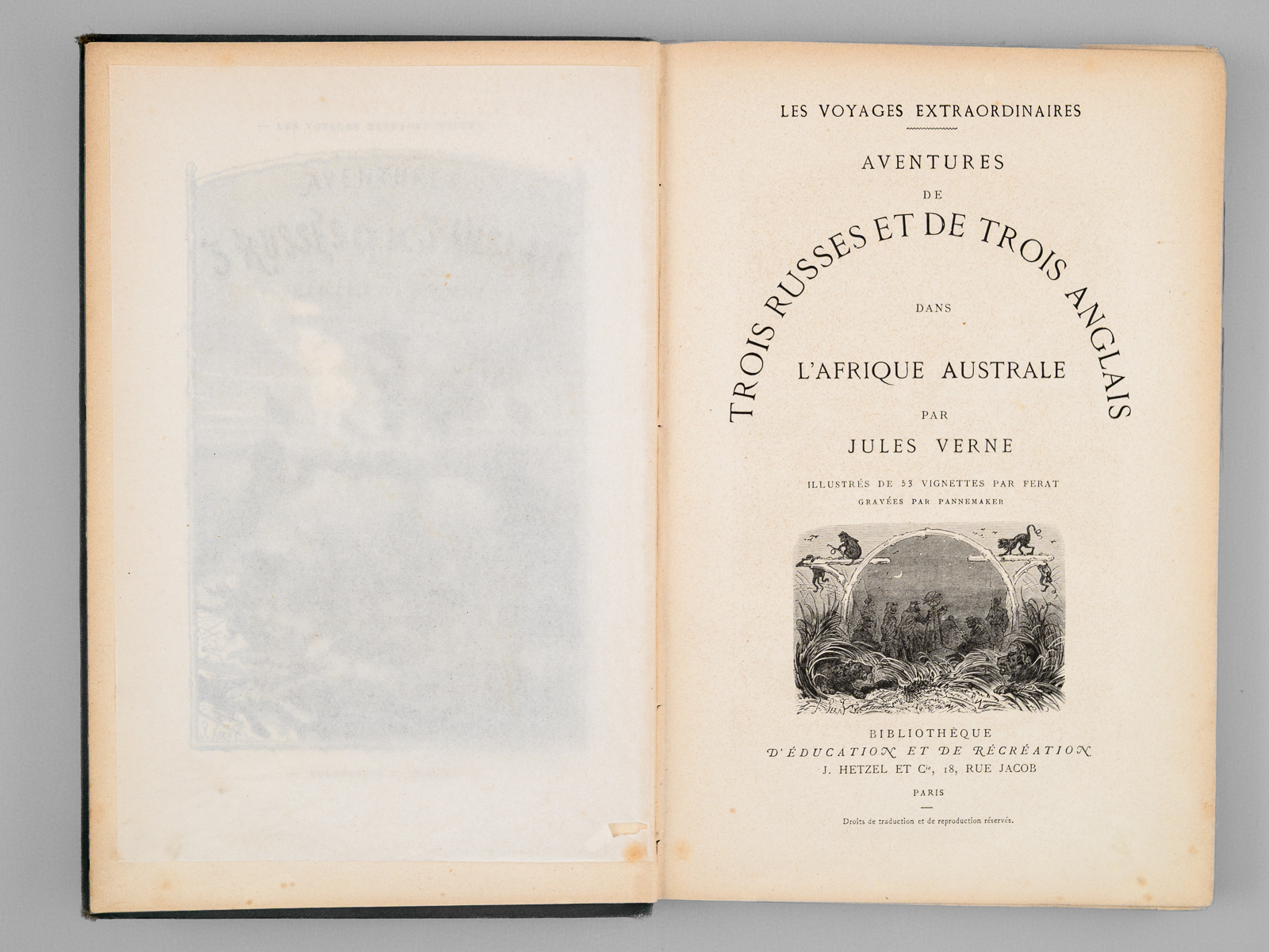 Illustrés de 53 vignettes par Ferat, gravées par Pannemaker, 1 vol. in-8 cartonnage éditeur vert aux bouquets de roses simple, toutes tranches dorées, reliure signée de Ch. Magnier, coll. Les Voyages Extraordinaires, Bibliothèque d'Education et de récréation, J. Hetzel et Cie, Paris, s.d. [ 1872 ], 2 ff., 202 pp. et 1 f. n. ch. Commentaire : Première édition illustrée de ce titre, en cartonnage vert aux bouquets de roses simple. Etat satisfaisant (un feuillet débroché, coiffes et coins un peu frottés). Jauzac, 82