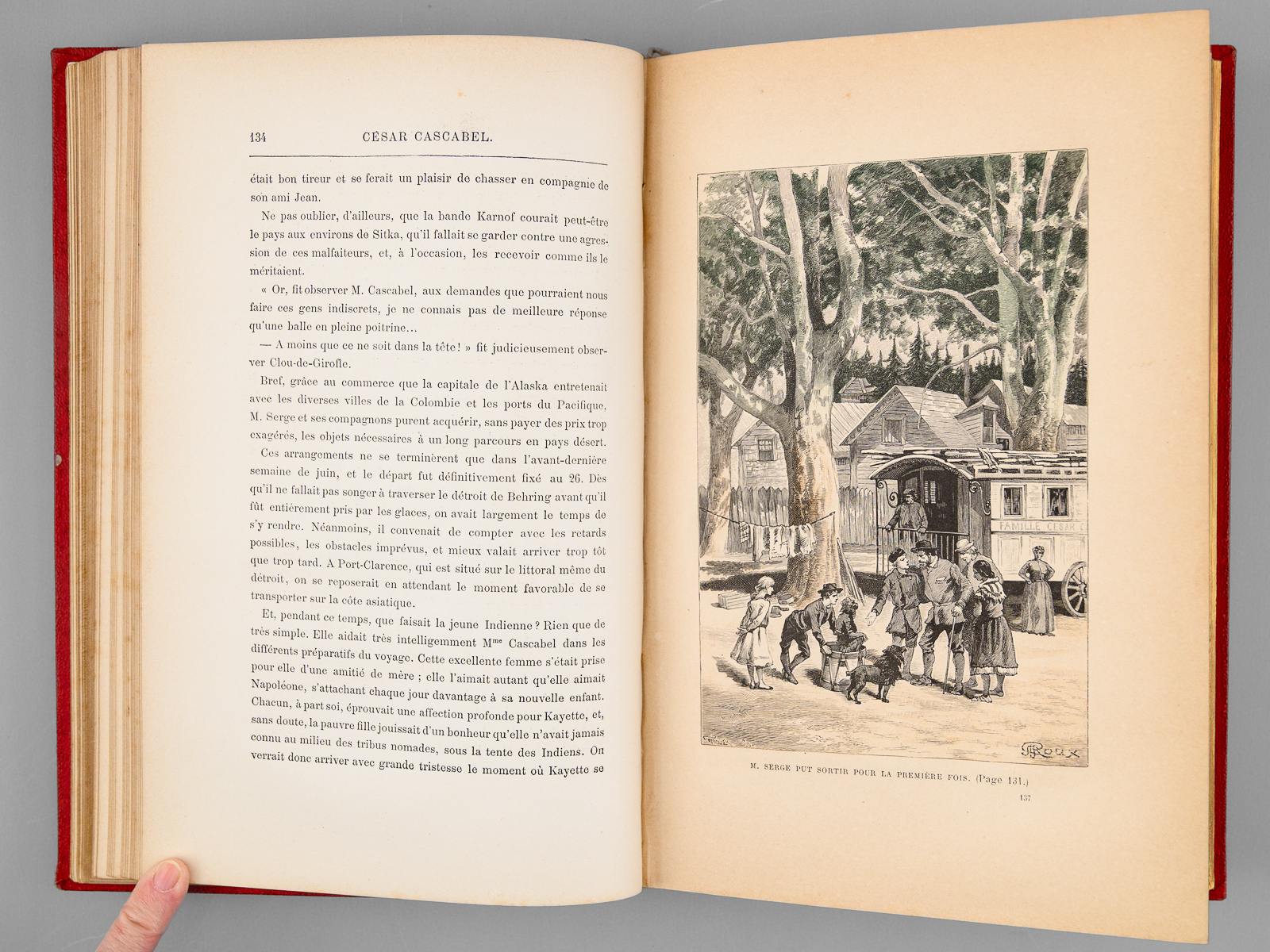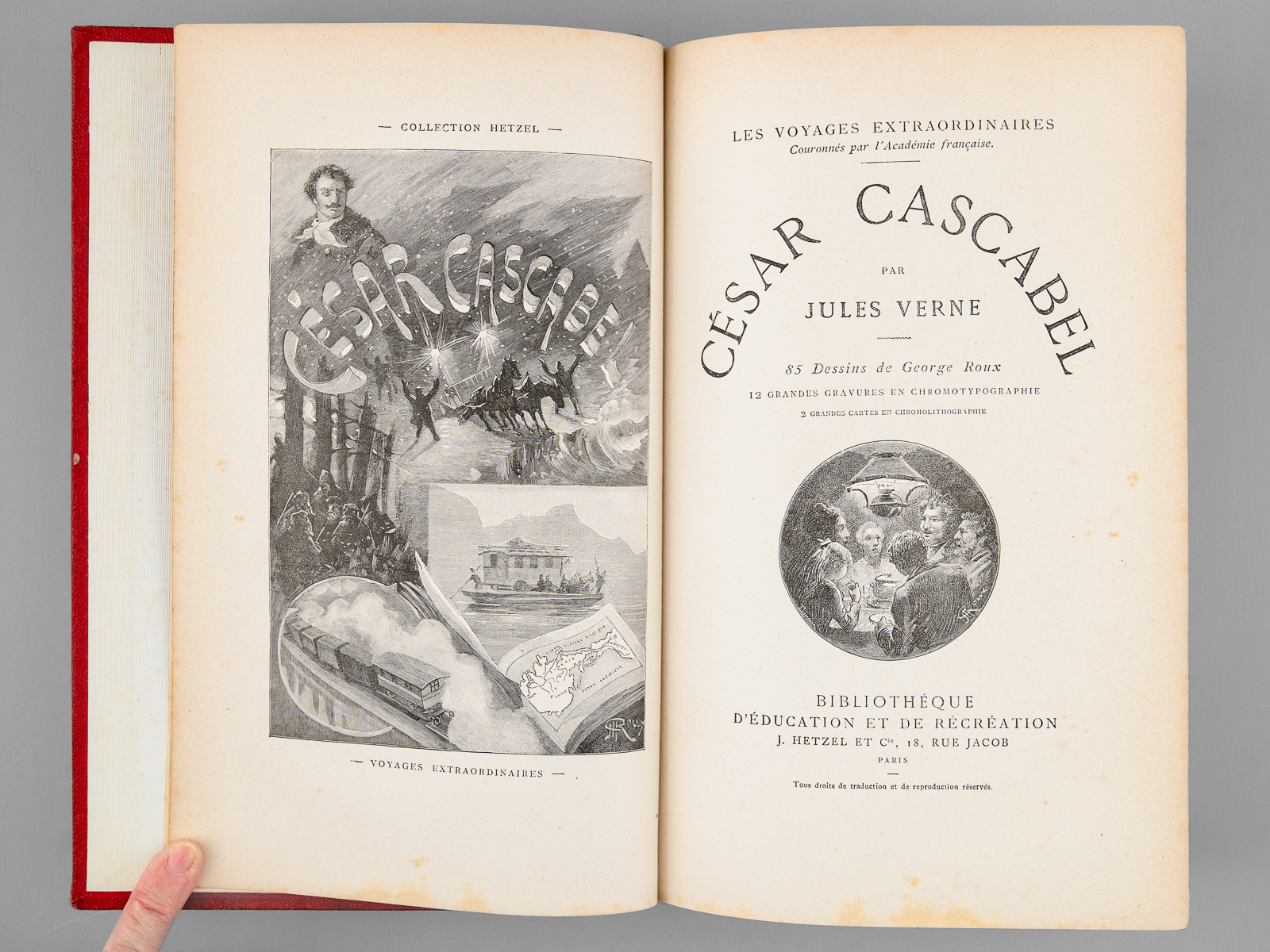 85 dessins de Georges Roux, 1 vol. in-8 reliure de l'époque demi-chagrin rouge dite « aux fers de lance » (ou « harpons » ou 'reliure à la lancette'), dos à 4 nerfs orné, toutes tranches dorées, reliure signée de Wendling, Collection Hetzel, Coll. Les Voyages Extraordinaires, Bibliothèque d'Education et de Récréation, J. Hetzel et Cie, Paris, s.d., 2 ff., 438 pp.