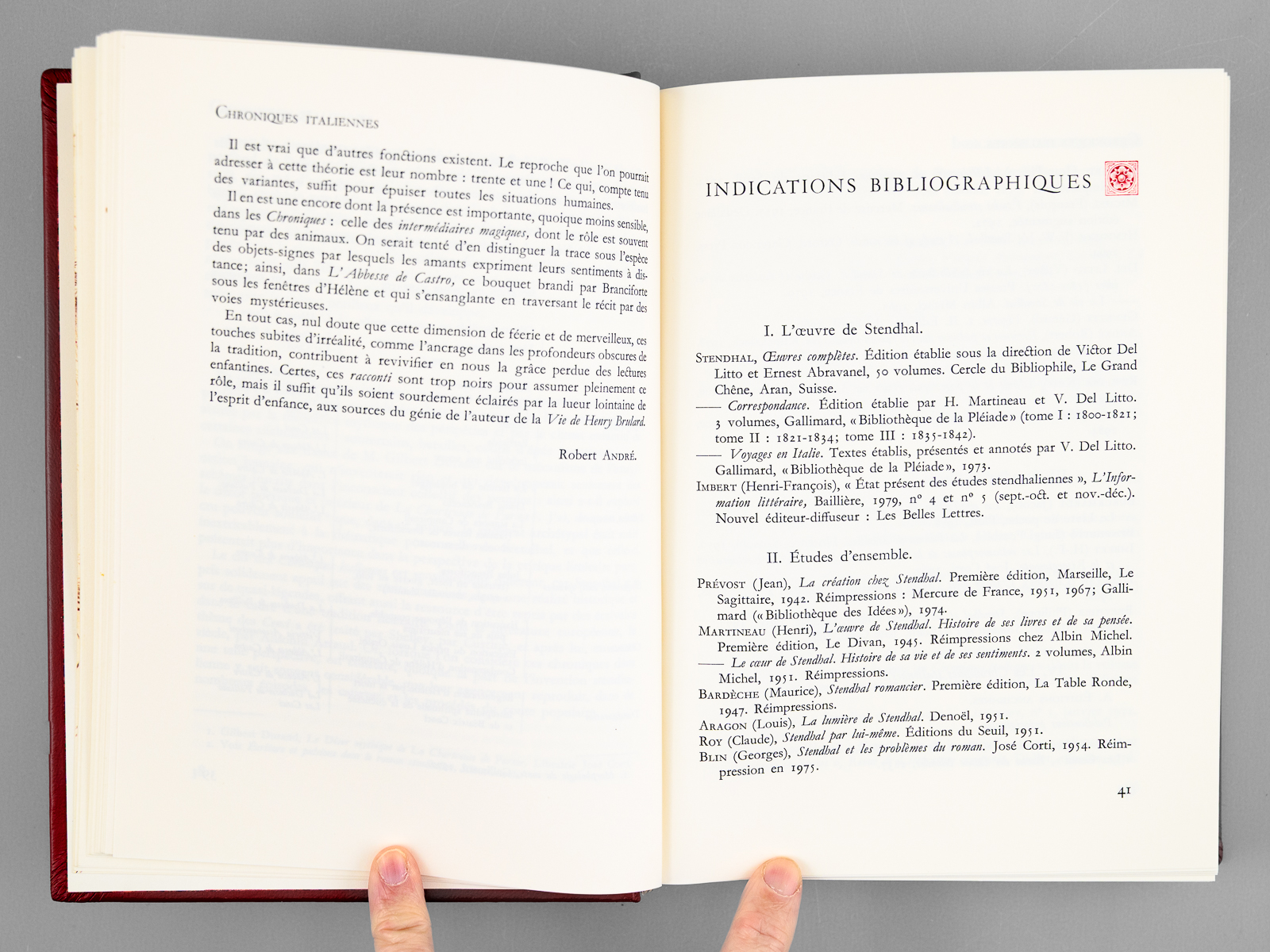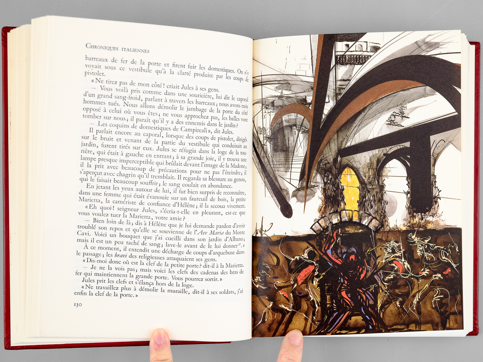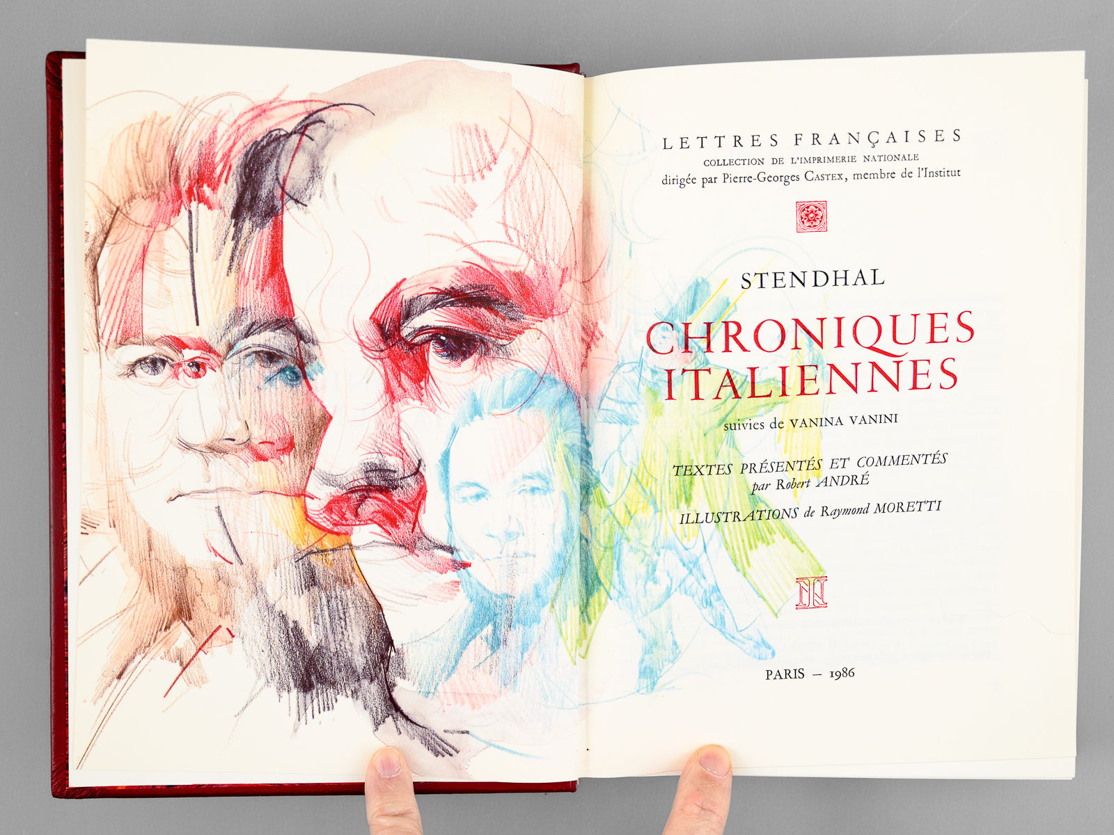 Textes présentés et commentés par Robert André, illustrations de Raymond Moretti, un des 5000 exemplaires sur papier d'édition de Rives numéroté, 1 vol. in-8 reliure pleine cuir rouge éditeur, dos à 4 nerfs dorés, tête dorée, coll. Lettres Françaises, collection de l'Imprimerie Nationale, Imprimerie Nationale, Paris, 1986, 387 pp. Commentaire : Bel exemplaire