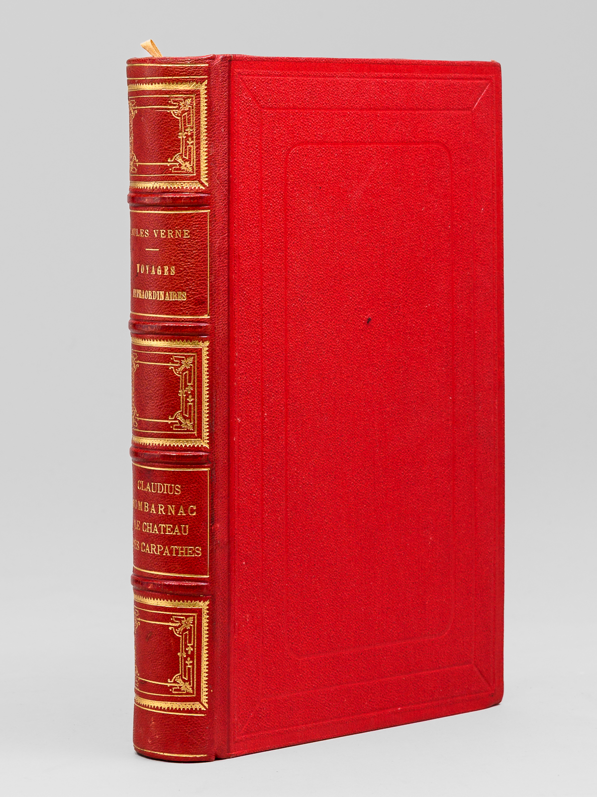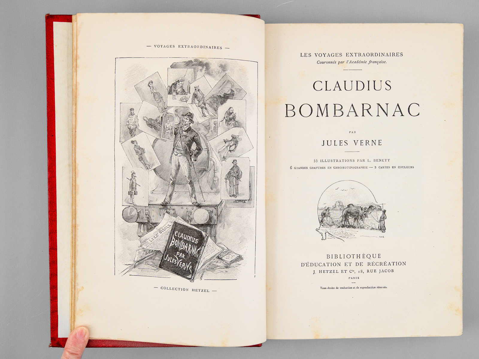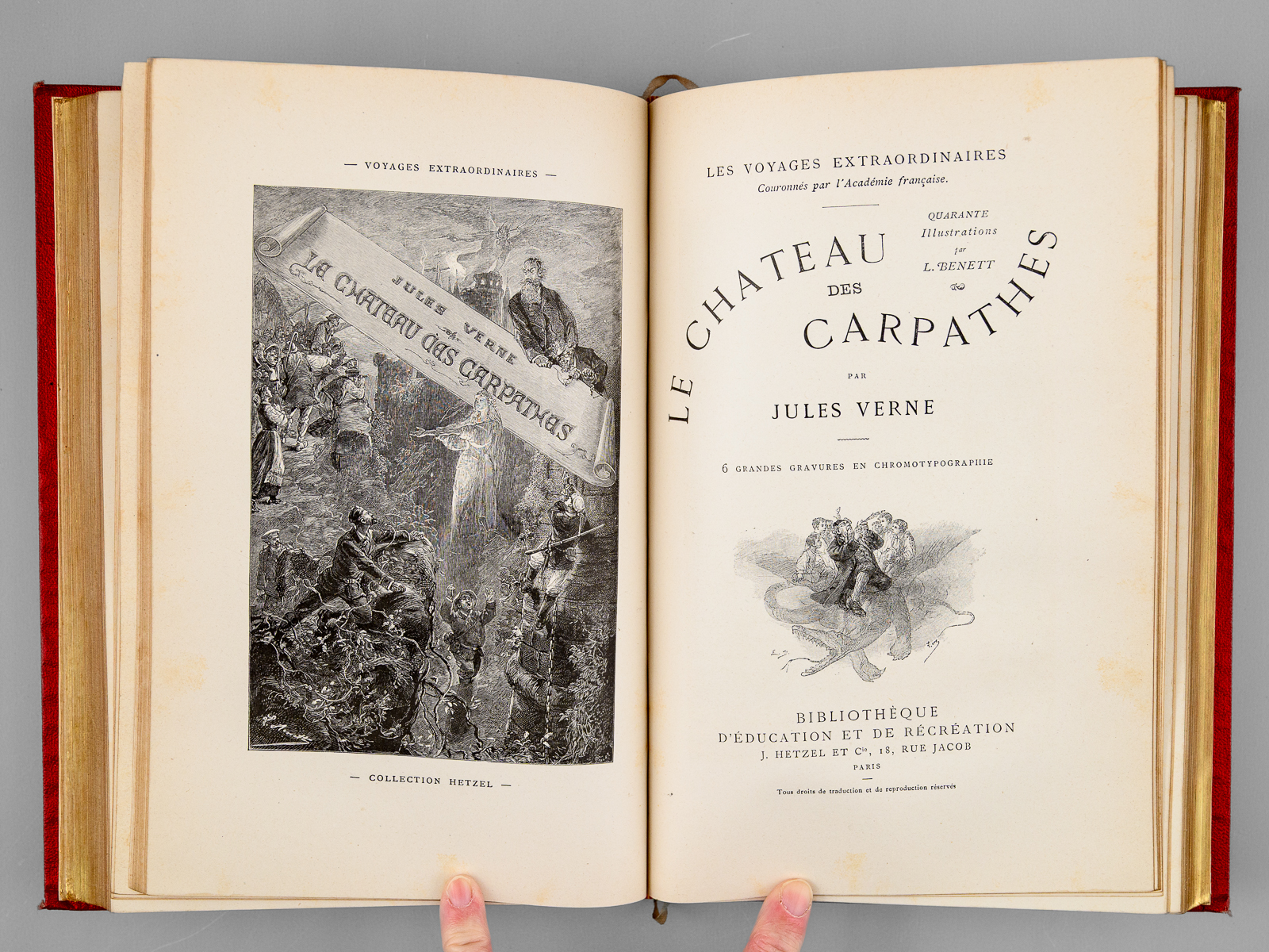 Avec 55 et 40 illustrations par Benett, 1 vol. in-8 reliure de l'époque demi-chagrin rouge dite « aux fers de lance » (ou « harpons » ou 'reliure à la lancette'), dos à 4 nerfs orné, toutes tranches dorées, Collection Hetzel, Coll. Les Voyages Extraordinaires, Bibliothèque d'Education et de Récréation, J. Hetzel et Cie, Paris, s.d. [circa 1892-1895 ], 285-199 pp. Commentaire : Bon exemplaire en reliure 'aux fers de lance' connue également comme 'reliure aux harpons', en très bon état (infime point de frott. au centre du plat, infimes frott. par ailleurs, rares rouss., très bel état par ailleurs). Cet exemplaire non signé mais mesurant seulement 27,5 cm de haut est peut-être à mettre en rapport avec les reliures 'Wendling'?