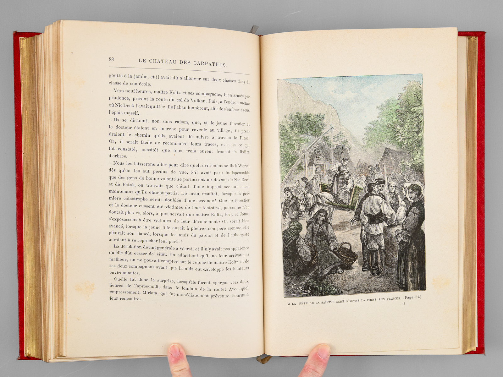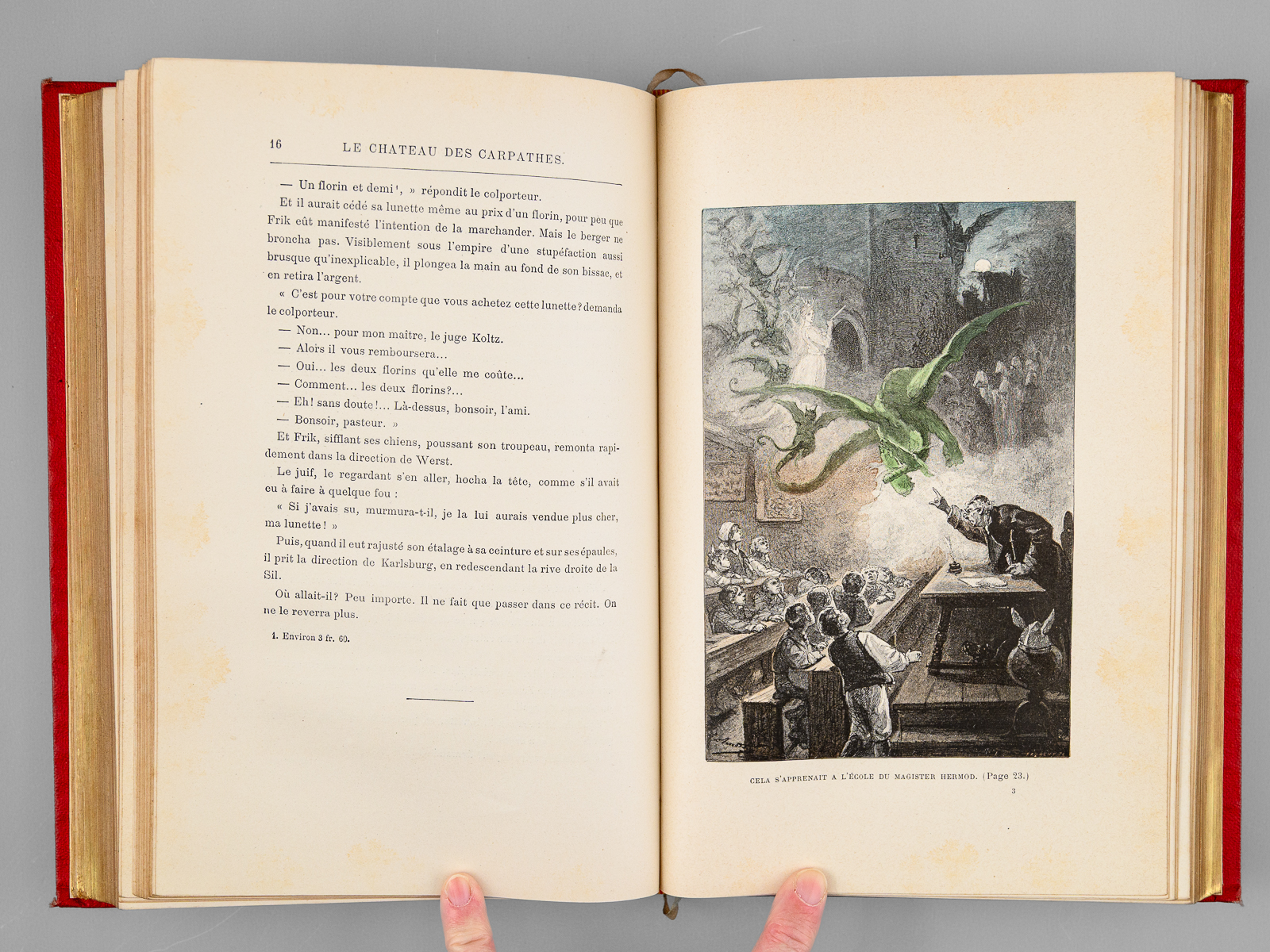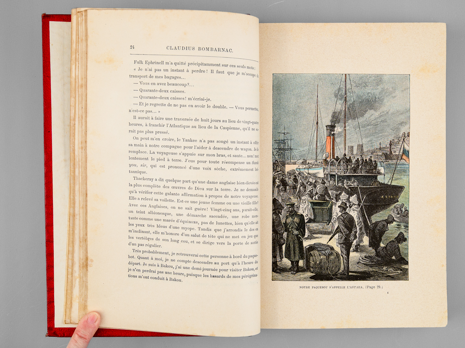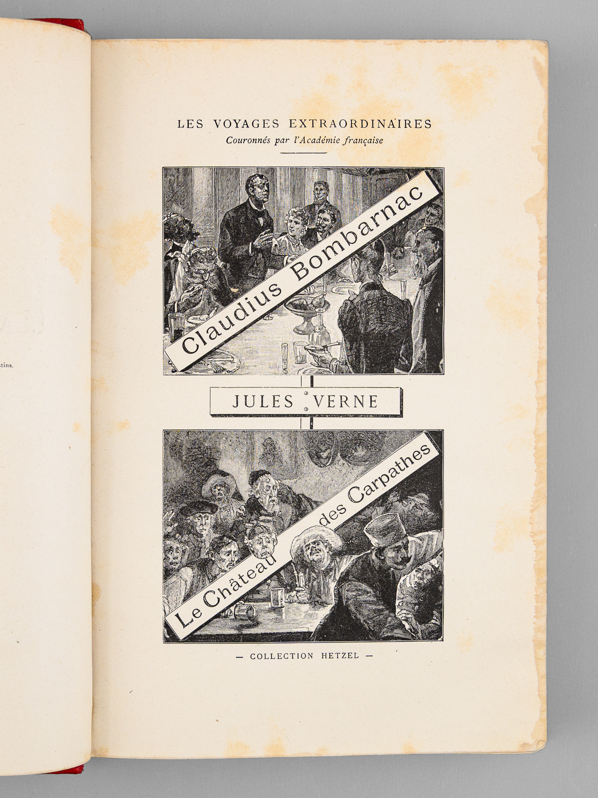 Avec 55 et 40 illustrations par Benett, 1 vol. in-8 reliure de l'époque demi-chagrin rouge dite « aux fers de lance » (ou « harpons » ou 'reliure à la lancette'), dos à 4 nerfs orné, toutes tranches dorées, Collection Hetzel, Coll. Les Voyages Extraordinaires, Bibliothèque d'Education et de Récréation, J. Hetzel et Cie, Paris, s.d. [circa 1892-1895 ], 285-199 pp. Commentaire : Bon exemplaire en reliure 'aux fers de lance' connue également comme 'reliure aux harpons', en très bon état (infime point de frott. au centre du plat, infimes frott. par ailleurs, rares rouss., très bel état par ailleurs). Cet exemplaire non signé mais mesurant seulement 27,5 cm de haut est peut-être à mettre en rapport avec les reliures 'Wendling'?