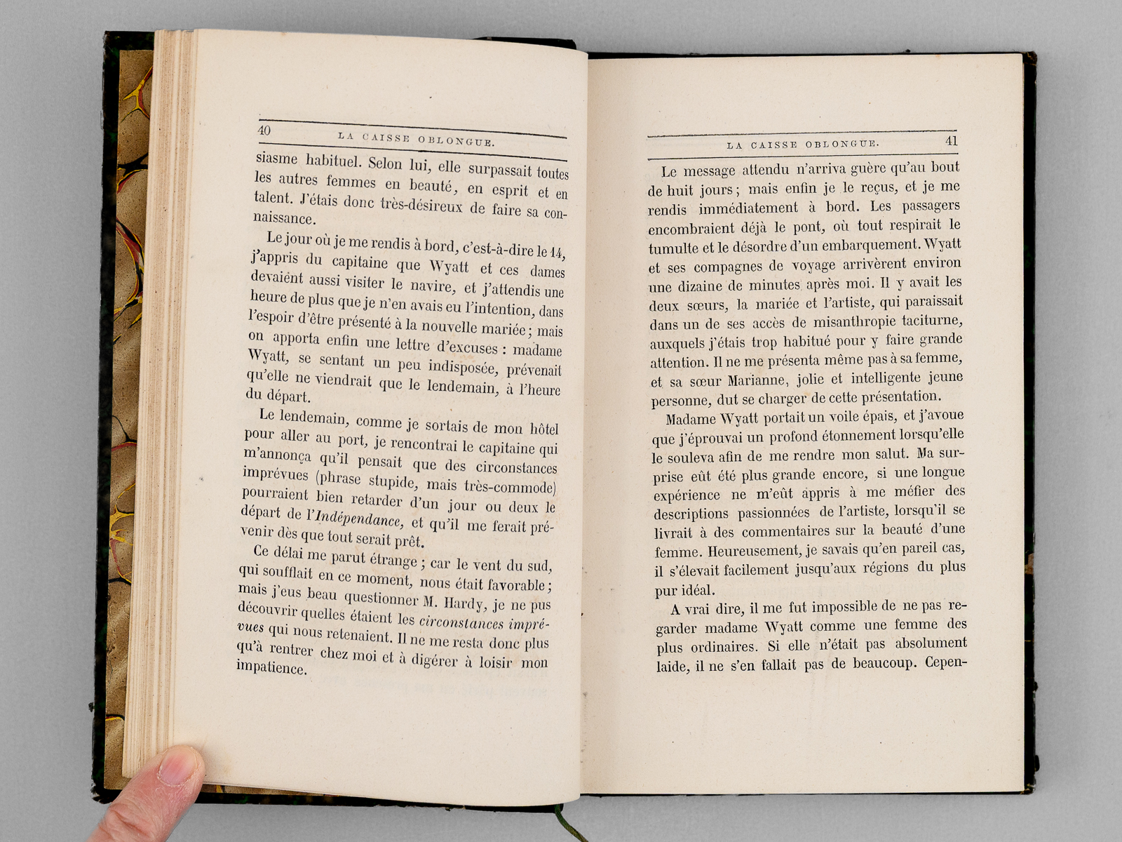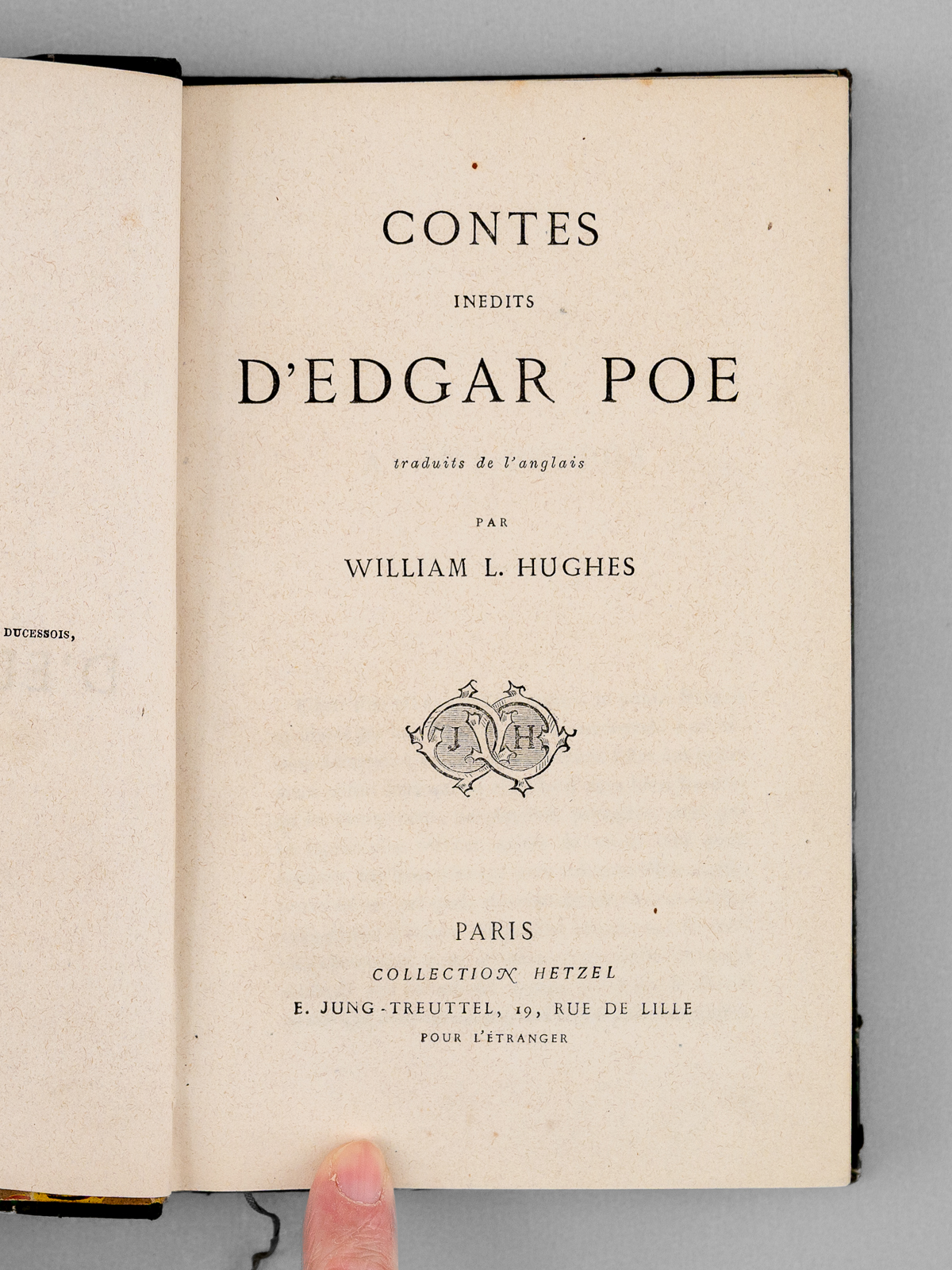 Traduit de l'anglais par William L. Hughes, 1 vol. in-12 reliure demi-chagrin vert bronze, dos à 4 nerfs orné, Collection Hetzel, E. Jung-Treuttel, Paris, s.d. [ 1862 ], 2 ff., III-314 pp. et 1 f. n. ch. Commentaire : Rare exemplaire de l'édition originale de la traduction française, en jolie reliure d'époque. L'ouvrage contient les contes suivants : Le rendez-vous ; Éléonore ; La caisse oblongue ; Le cadavre accusateur ; Le système du docteur Goudron et du professeur Plume ; Un homme usé ; La semaine des trois dimanches ; Le sphinx ; Les lunettes ; Les débuts littéraires de Thingum Bob ; Politien. Et 9 poèmes (Ulalume ; Hélène ; El Dorado ; Le corbeau ; A ; La dormeuse ; Lénore ; Un rêve dans un rêve ; Pour Annette). Etat très satisfaisant (coupes frottées, infime frott. en dos, très bon état par ailleurs). Vicaire, VI, 737