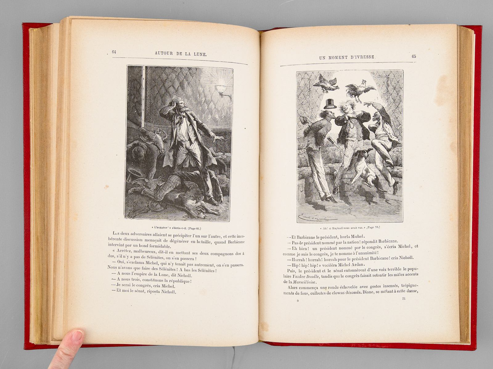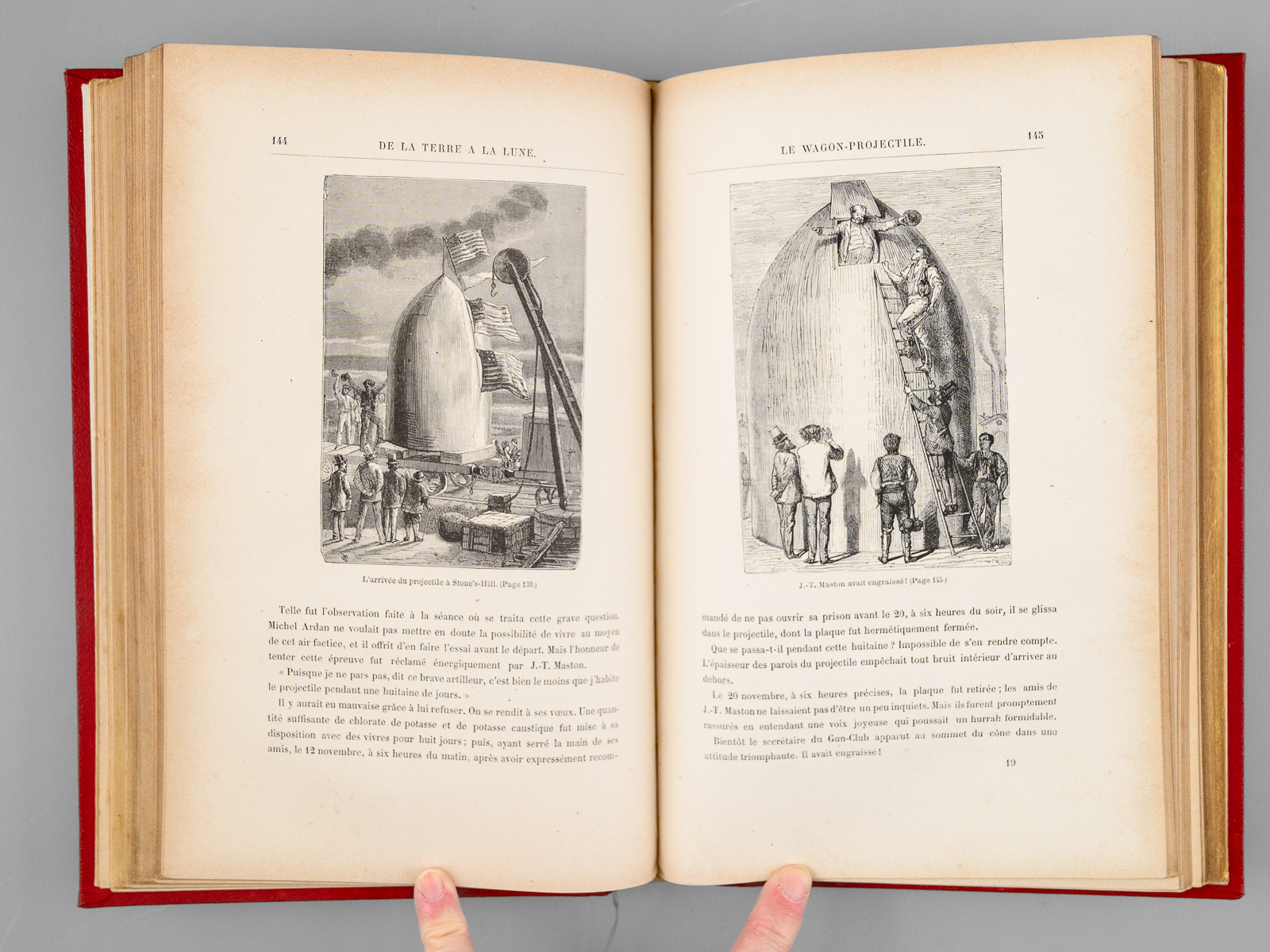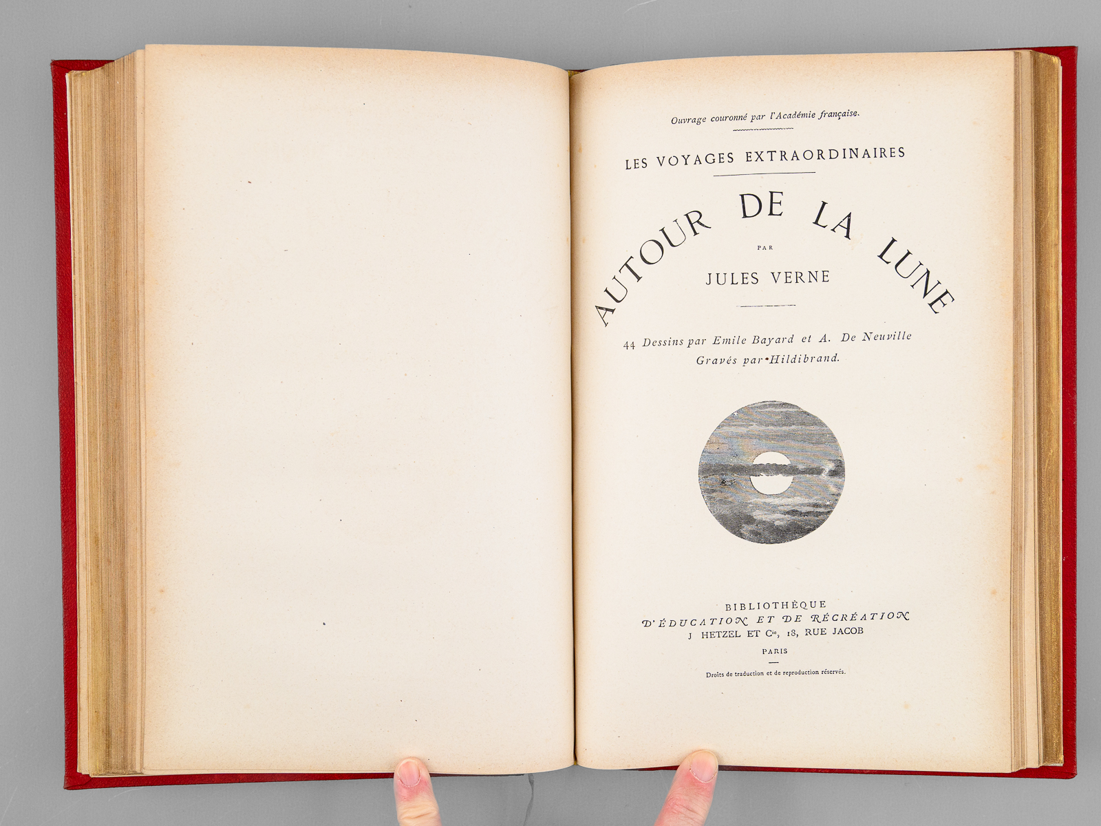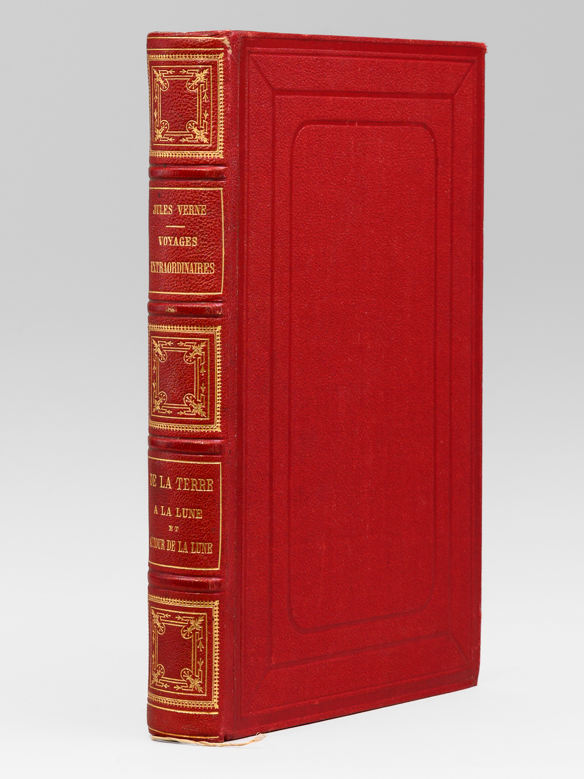 41 Dessins ez une Carte par De Montaut, 44 Dessins de Emily Bayard et A. de Neuville, 1 vol. in-8 reliure de l'époque demi-chagrin rouge dite « aux fers de lance » (ou « harpons » ou 'reliure à la lancette'), dos à 4 nerfs orné, toutes tranches dorées, Collection Hetzel, Coll. Les Voyages Extraordinaires, Bibliothèque d'Education et de Récréation, J. Hetzel et Cie, Paris, s.d. [ 1890 ], 2 ff., 171 pp., 2 ff., 180 pp., et 4 ff. (Catalogue FN) Commentaire : Bon état pour cet exemplaire en reliure 'aux fers de lance' connue également comme 'reliure aux harpons' (rares rouss., infimes frott., très bon état par ailleurs).