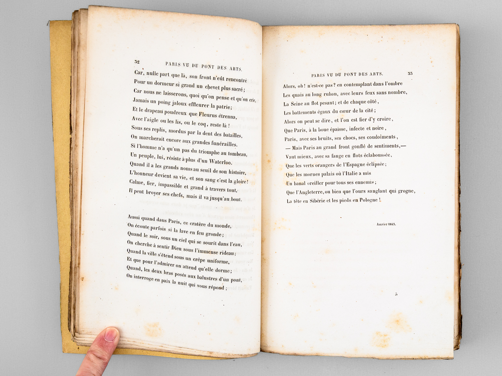 E.O., 1 vol. in-8 br., W. Coquebert éditeur, Paris, 1844, 356 pp. Commentaire : Etat satisfaisant (couv. frottée avc dos rajouté, des rousseurs, bon état par ailleurs) pour ce recueil de poésies, qui fut le tout premier livre de Louis Ulbach. Victor Hugo l'avait encouragé à le publier. Peu courant désormais.