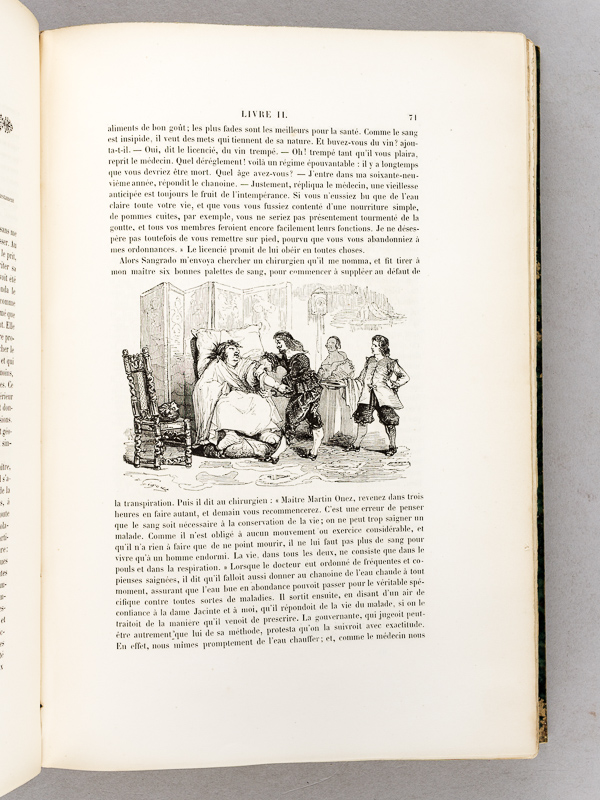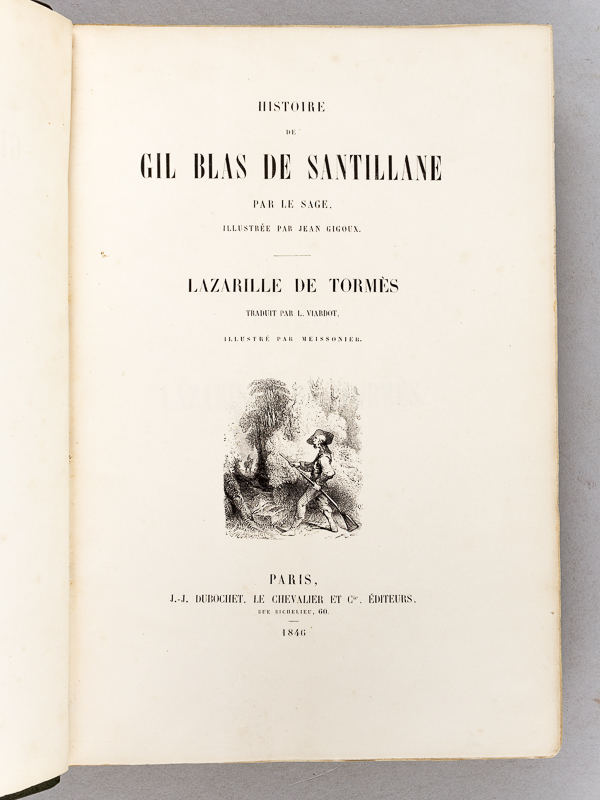 1 vol. in-4 reliure demi-chagrin vert, dos à 4 nerfs, J. J. Dubochet, Le Chevalier et Cie, Paris, 1846, LV-630 pp. Commentaire : 'Les vignettes de Gigoux sont ici en 4e tirage pour la partie réimprimée en 1836 et en 3e pour le surplus ; celles de Meissonier pour Lazarille sont de premier tirage. Dans cette édition, il y a une quarantaine de vignettes nouvelles, mais elle n'est recherchée que pour les dessins de Meissonier, qui sont très finement gravés.' (Brivois, 259) Etat très satisfaisant (dos lég. frotté, qq. rouss. et mouill. claires).