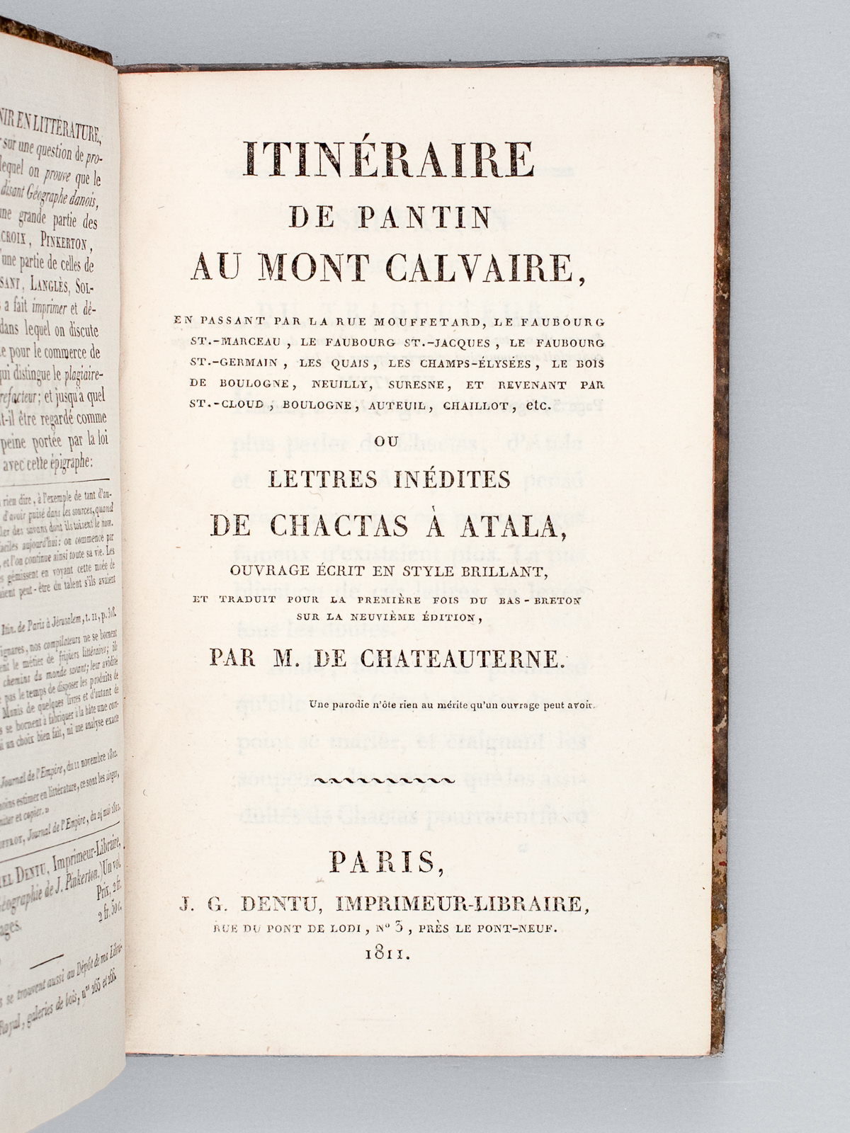 1 vol. in-8 reliure de l'époque demi-basane marron, reliure vernissée, J. G. Dentu, Paris, 1811, 2 ff., XIII-236 pp. Rappel du titre complet : Itinéraire de Pantin au Mont Calvaire, en passant par la rue Mouffetard, le Faubourg St.-Marceau, le Faubourg St.-Jacques, le Faubourg St.-Germain, les Quais, les Champs-Élysées, le Bois de Boulogne, Neuilly, Suresne, et revenant par St.-Cloud, Boulogne, Auteuil, Chaillot, etc. ou Lettres inédites de Chactas à Atala, ouvrage écrit en style brillant, et traduit pour la première fois du bas-breton sur la neuvième édition, par M. de Chateauterne.