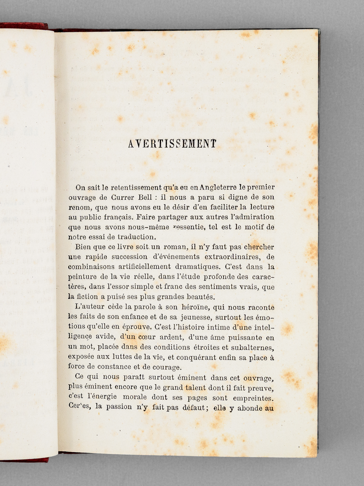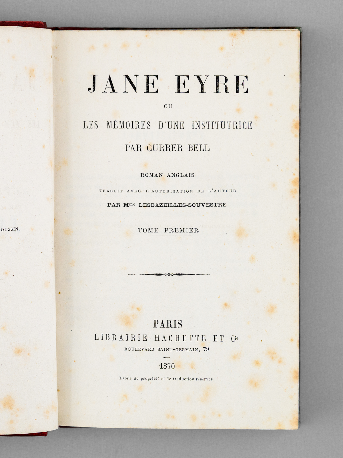 Roman anglais traduit avec l'autorisation de l'auteur par Mme Lesbazeilles-Souvestre, 2 vol. in-12 reliure de l'époque demi-chagrin rouge, dos à 5 nerfs, Librairie de L. Hachette et Cie, Paris, 1870, 2 ff., 243 pp. ; 2 ff. , 217 pp. Commentaire : Bon état (rouss.) pour cet exemplaire en jolie reliure d'époque.
