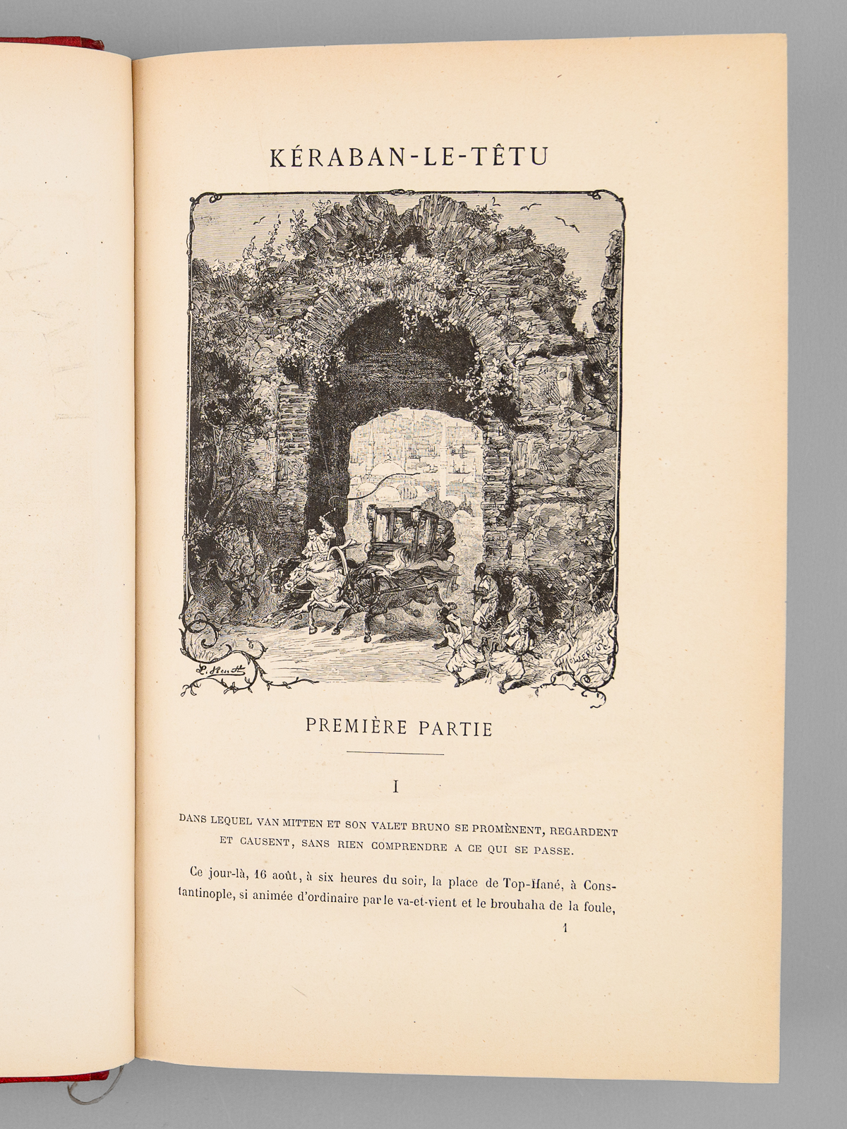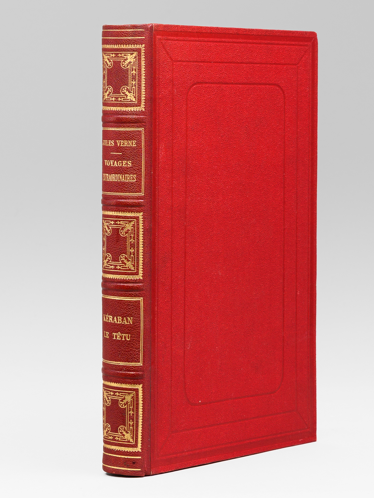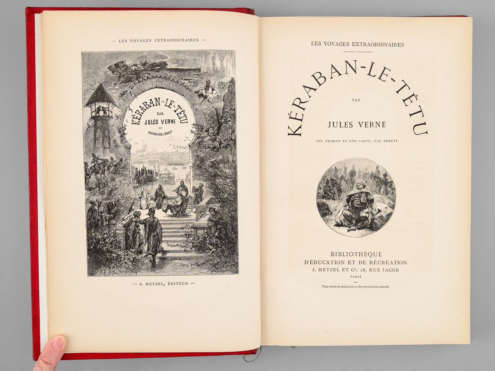 41 Dessins ez une Carte par De Montaut, 44 Dessins de Emily Bayard et A. de Neuville, 1 vol. in-8 reliure de l'époque demi-chagrin rouge dite « aux fers de lance » (ou « harpons » ou 'reliure à la lancette'), dos à 4 nerfs orné, toutes tranches dorées, reliure signée de A. Lenègre, Collection Hetzel, Coll. Les Voyages Extraordinaires, Bibliothèque d'Education et de Récréation, J. Hetzel et Cie, Paris, s.d. [ 1890 ], 2 ff., 171 pp., 2 ff., 180 pp., et 4 ff. (Catalogue FN) Commentaire : Bon exemplaire en reliure 'aux fers de lance' connue également comme 'reliure aux harpons', en très bon état.