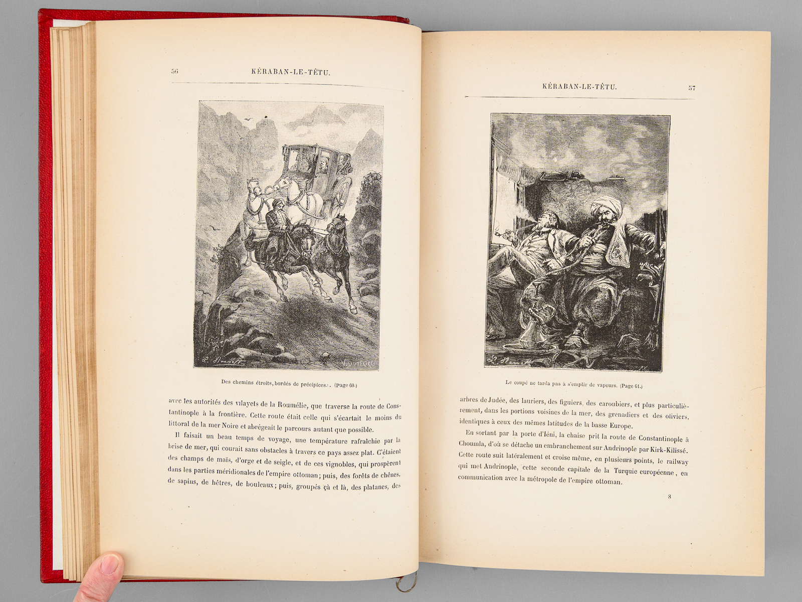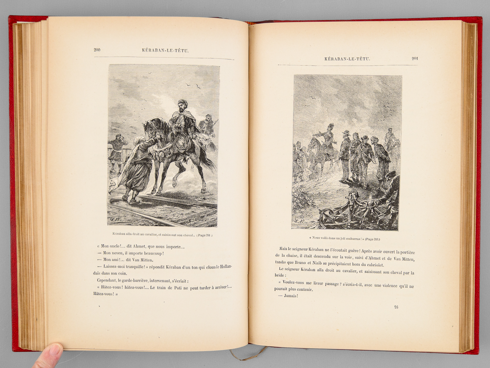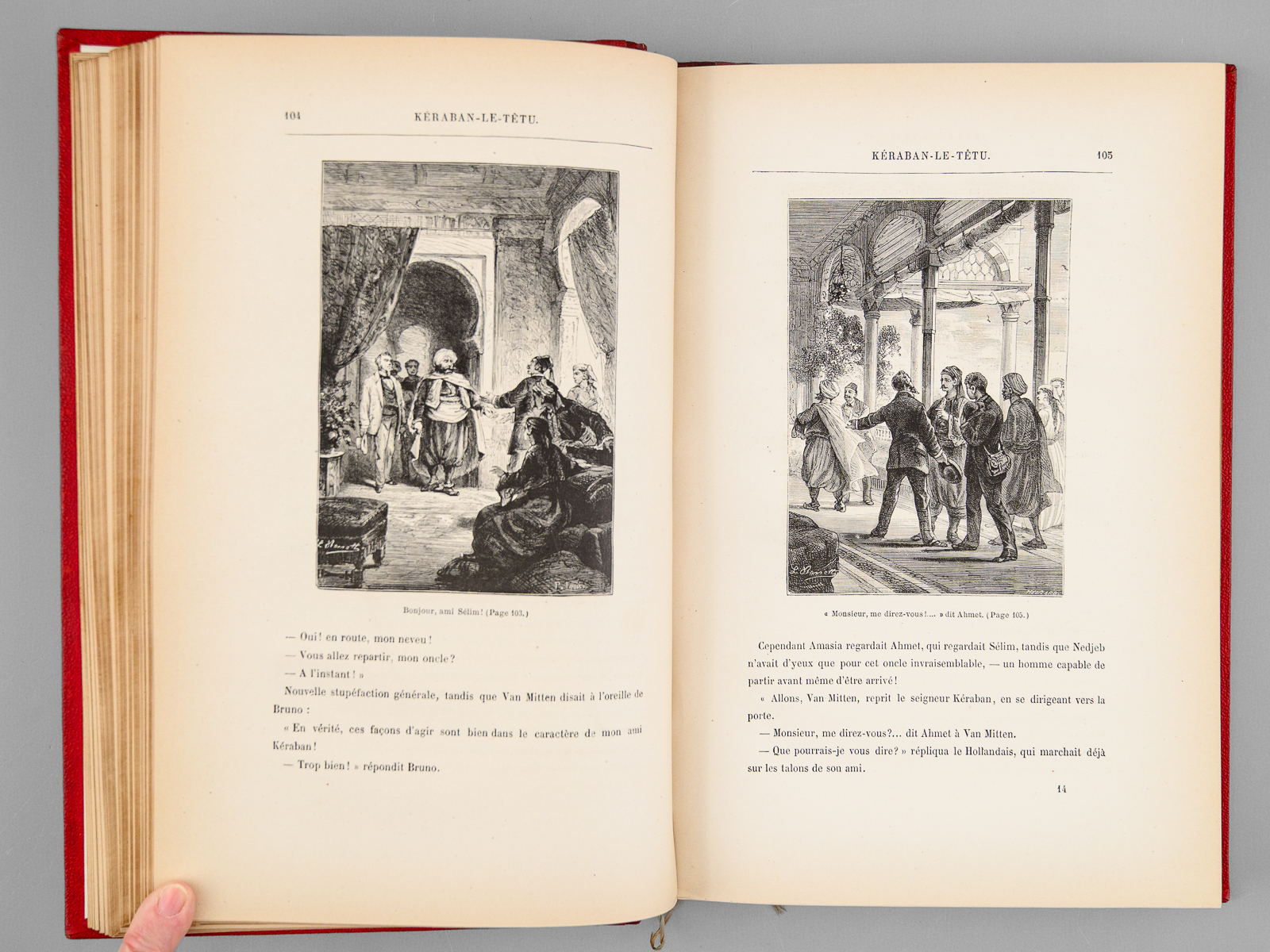 41 Dessins ez une Carte par De Montaut, 44 Dessins de Emily Bayard et A. de Neuville, 1 vol. in-8 reliure de l'époque demi-chagrin rouge dite « aux fers de lance » (ou « harpons » ou 'reliure à la lancette'), dos à 4 nerfs orné, toutes tranches dorées, reliure signée de A. Lenègre, Collection Hetzel, Coll. Les Voyages Extraordinaires, Bibliothèque d'Education et de Récréation, J. Hetzel et Cie, Paris, s.d. [ 1890 ], 2 ff., 171 pp., 2 ff., 180 pp., et 4 ff. (Catalogue FN) Commentaire : Bon exemplaire en reliure 'aux fers de lance' connue également comme 'reliure aux harpons', en très bon état.