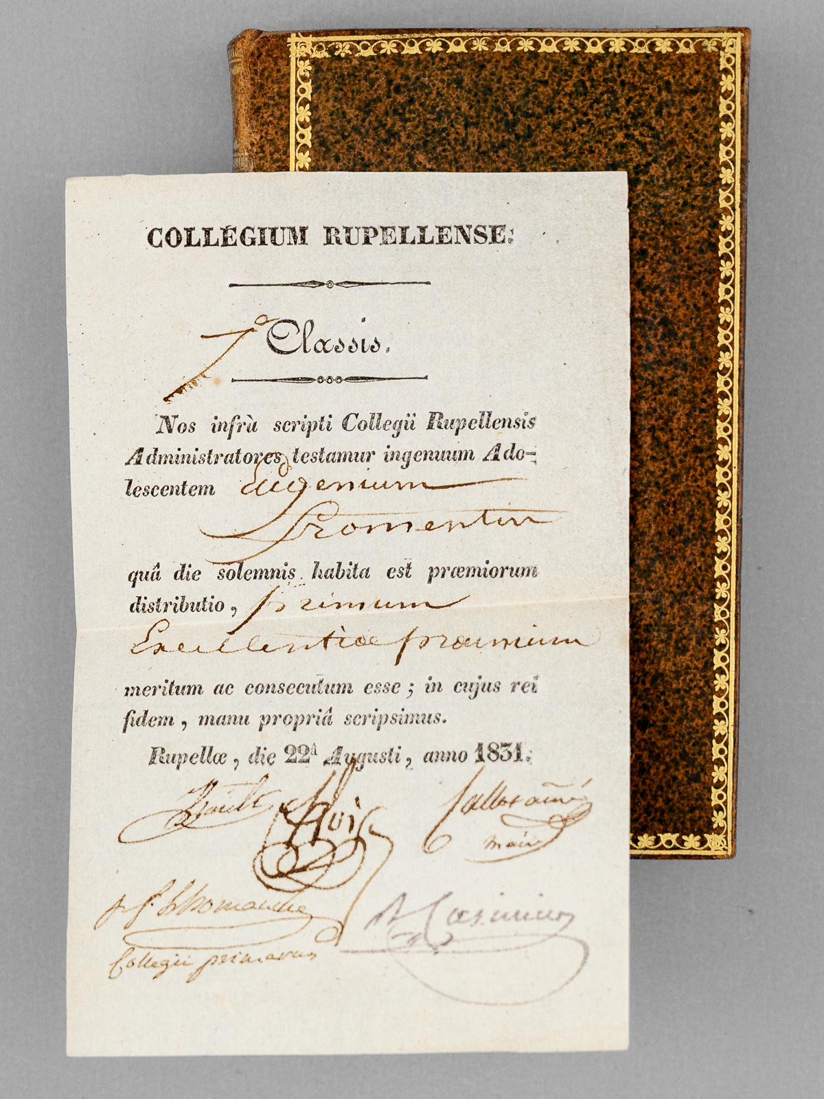 Commentaire : Très remarquable exemplaire, contenant le billet de prix en un feuillet plié (et non collé, probablement en raison de son format) accordant le Premier Prix d'Excellence accordé au futur écrivain et peintre Eugène Fromentin par le Collège de La Rochelle, le 22 août 1831. Eugène Fromentin (1820-1876), alors seulement âgé de 10 ans, était élève en classe de 7ème. Le texte complet du document, complété à la plume et signé par les dirigeants du collège de La Rochelle et diverses notabilités, dont 'Callot aîné maire' (Pierre Simon Callot, maire de La Rochelle de 1830 à 1834), est le suivant : 'Collegium Rupellense. Nos infrà scripti Collegii Rupellensis Administratores testamur ingenuum Adolescentem Eugenium Fromentin quâ die solemnis habita est præmiorum distributio, primum Excellentiæ præmium meritum ac consecutum esse ; in cujus rei fidem, manu propriâ scripsimus. Rupellae, die 22a Augusti, anno 1831' (Traduction : 'Collège de la Rochelle. Classe de 7ème. Nous, administrateurs soussignés du Collège de La Rochelle, certifions que le jeune homme Eugène Fromentin, le jour où s'est tenue la distribution solennelle des prix, a mérité et obtenu le premier prix d'Excellence ; en foi de quoi, nous avons signé de notre propre main. À La Rochelle, le 22 août de l'an 1831'). Il est difficile de savoir si ces 3 volumes, publiés en 1802, furent réellement le prix offert à Eugène Fromentin à cette occasion ; néanmoins le style de la reliure et du papier de garde, ainsi que le contenu de l'ouvrage, et le fait que le billet de prix n'ait jamais été collé mais replié proprement semblent des indices favorables à une telle conclusion (et il arrivait souvent que les ouvrages de prix proviennent d'anciens stocks d'éditeurs). Bon exemplaire (très petit frott.) enrichi d'un exceptionnel billet de prix.